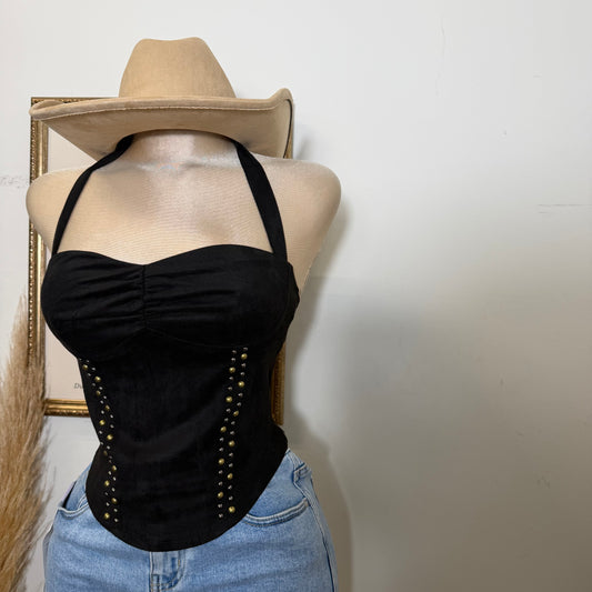 Suede Studded Halter Top-Black