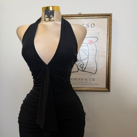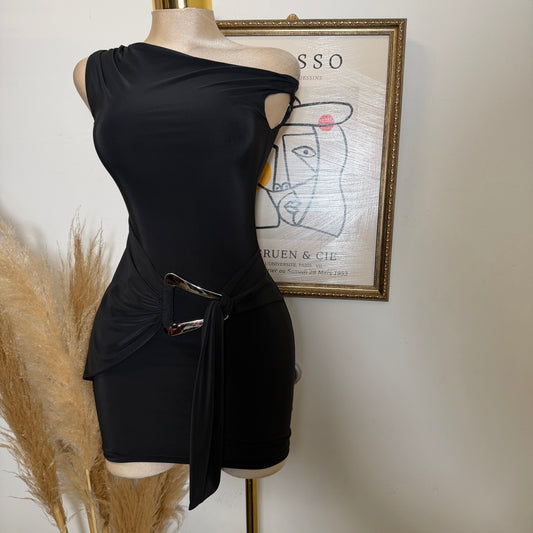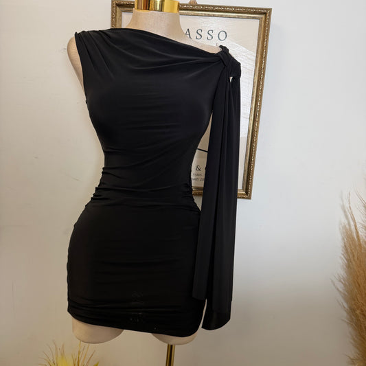 Off Shoulder Ruched Side Tie Mini Dress-Black