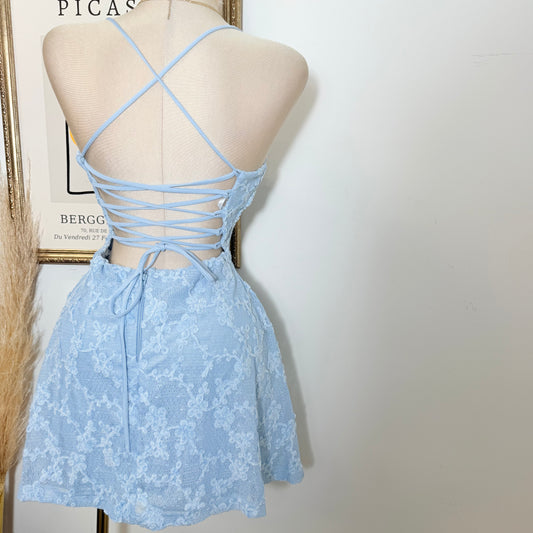 Fleur Faux Fur Tape Flare Mini Dress-Baby Blue