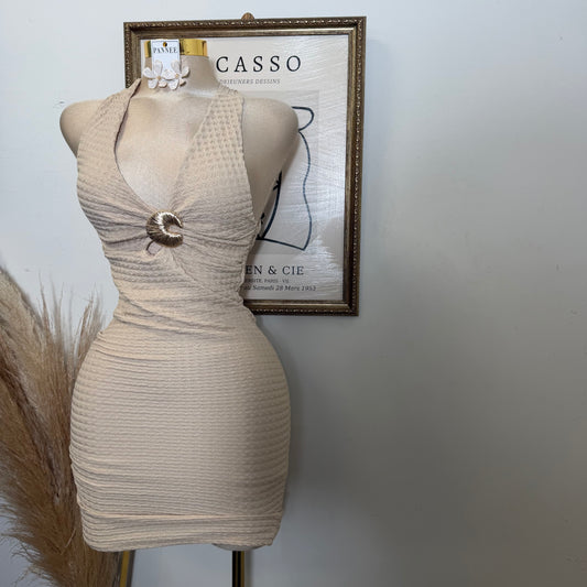 Textured Back Cross Mini Dress-Sand