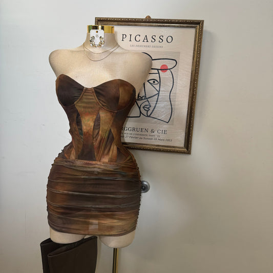 Corset Mesh Mini Dress-Green