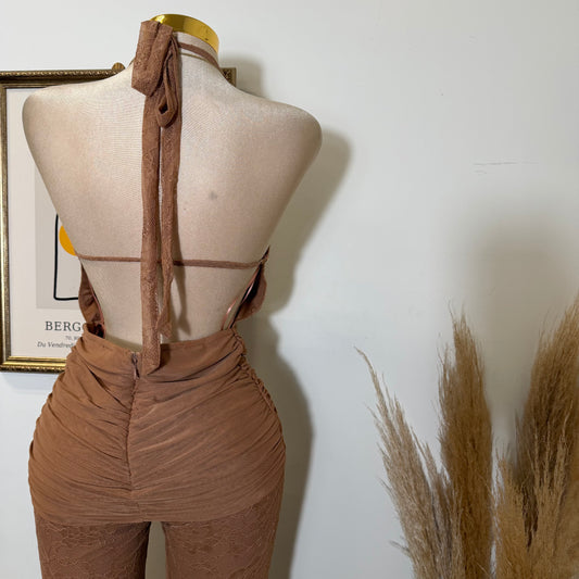 Halter Lace Jumpsuit Gold Detail-Brown