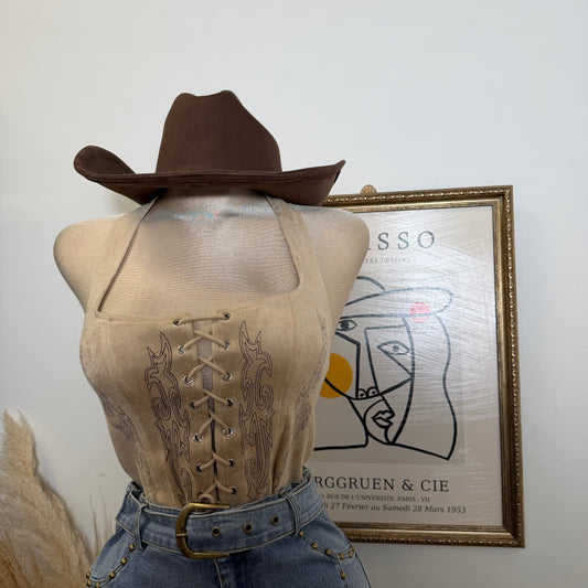 Tie Front suede Top with stitch Detail-Caramel