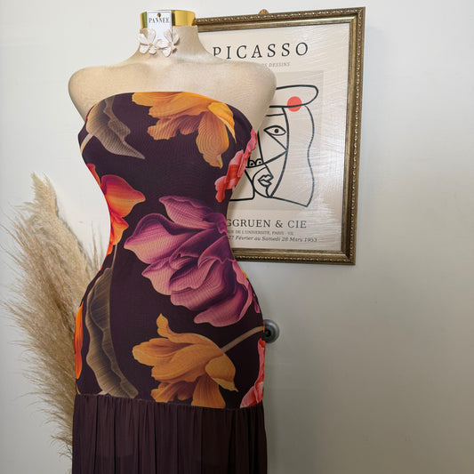Floral Mesh Bottom fit and Flare Maxi Dress-Raisin
