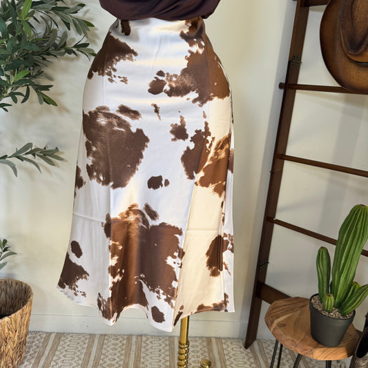 Cow Print Satin Midi Skirt-brown