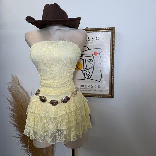 Floral Lace Ruched Triple-Layer Mini Dress-yellow