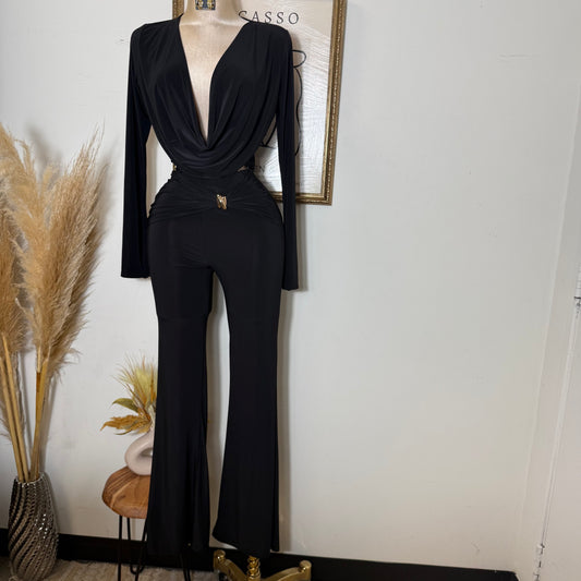 Long Sleeve Crop Top Pant Set-Black