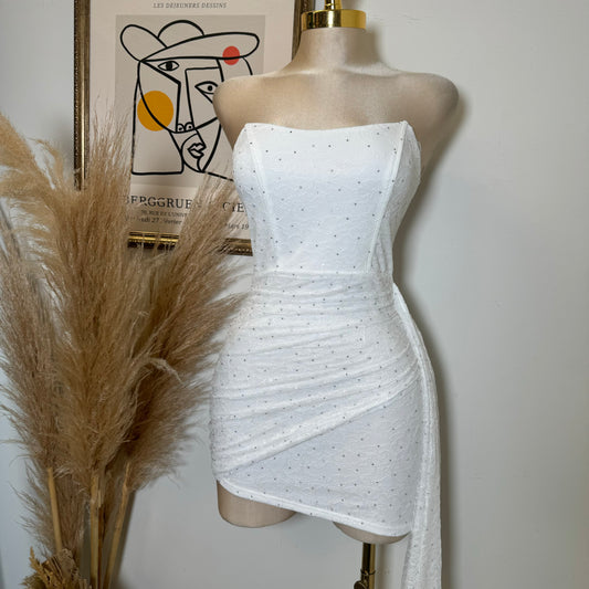 STUDD HOTFIX REGISTERED LACE STRAPLESS MINI BODYCON DRESS-White