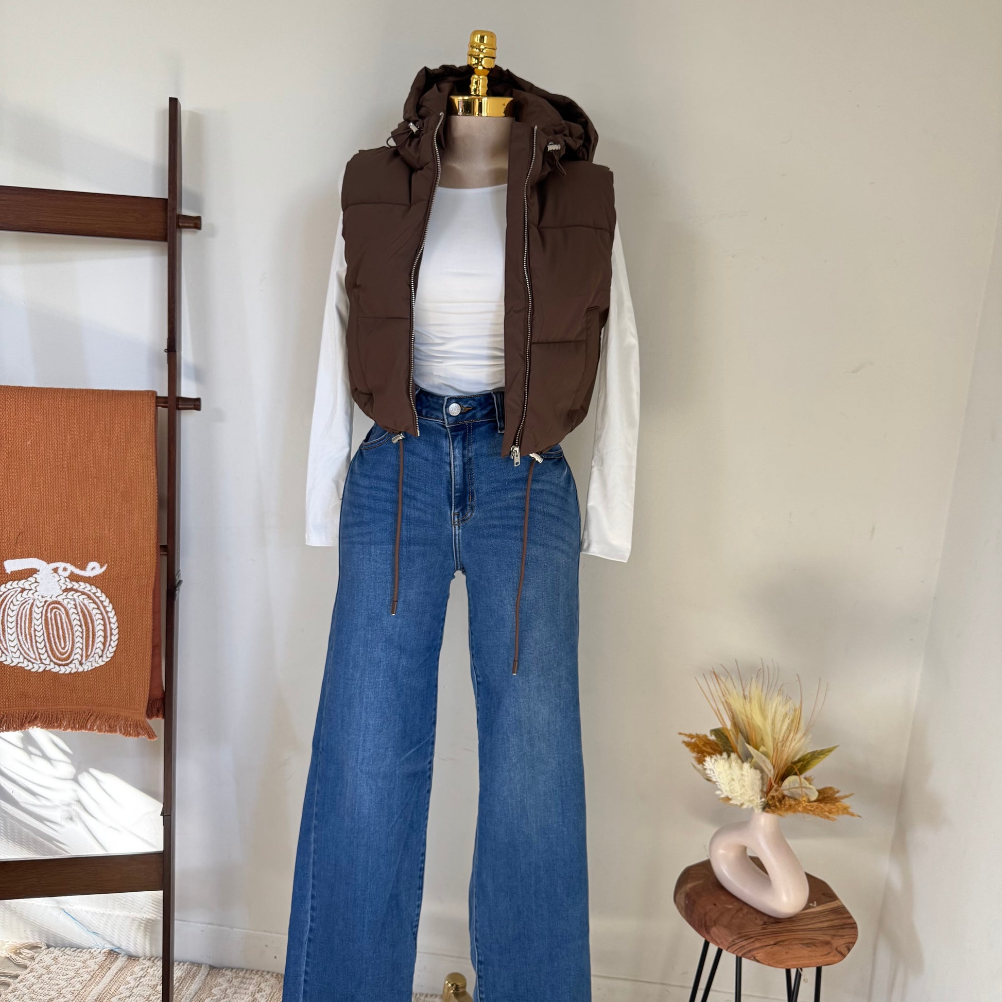 Cropped Puffer Vest W/ Adjustable Drawstrings- Espresso