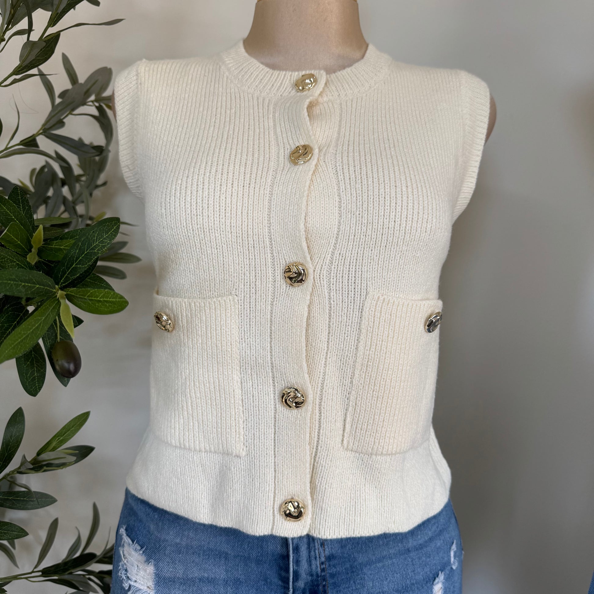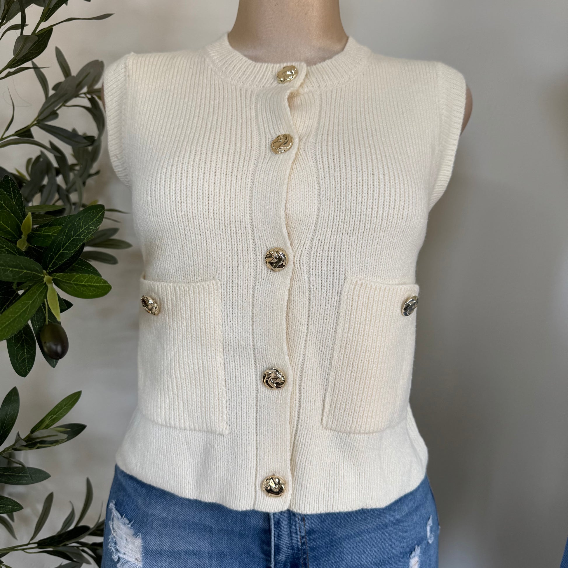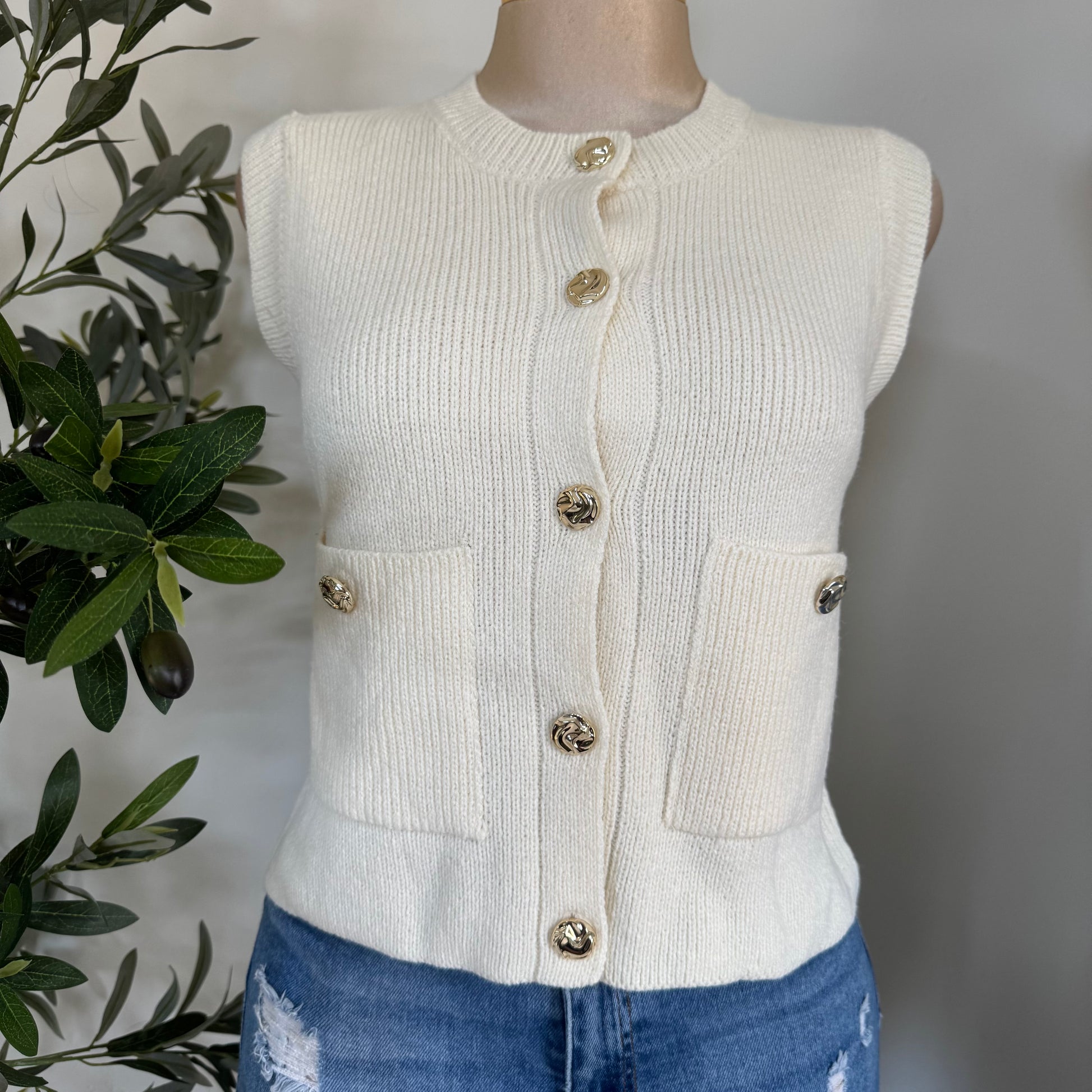 Sleeveless Knit Sweater Vest -Ivory