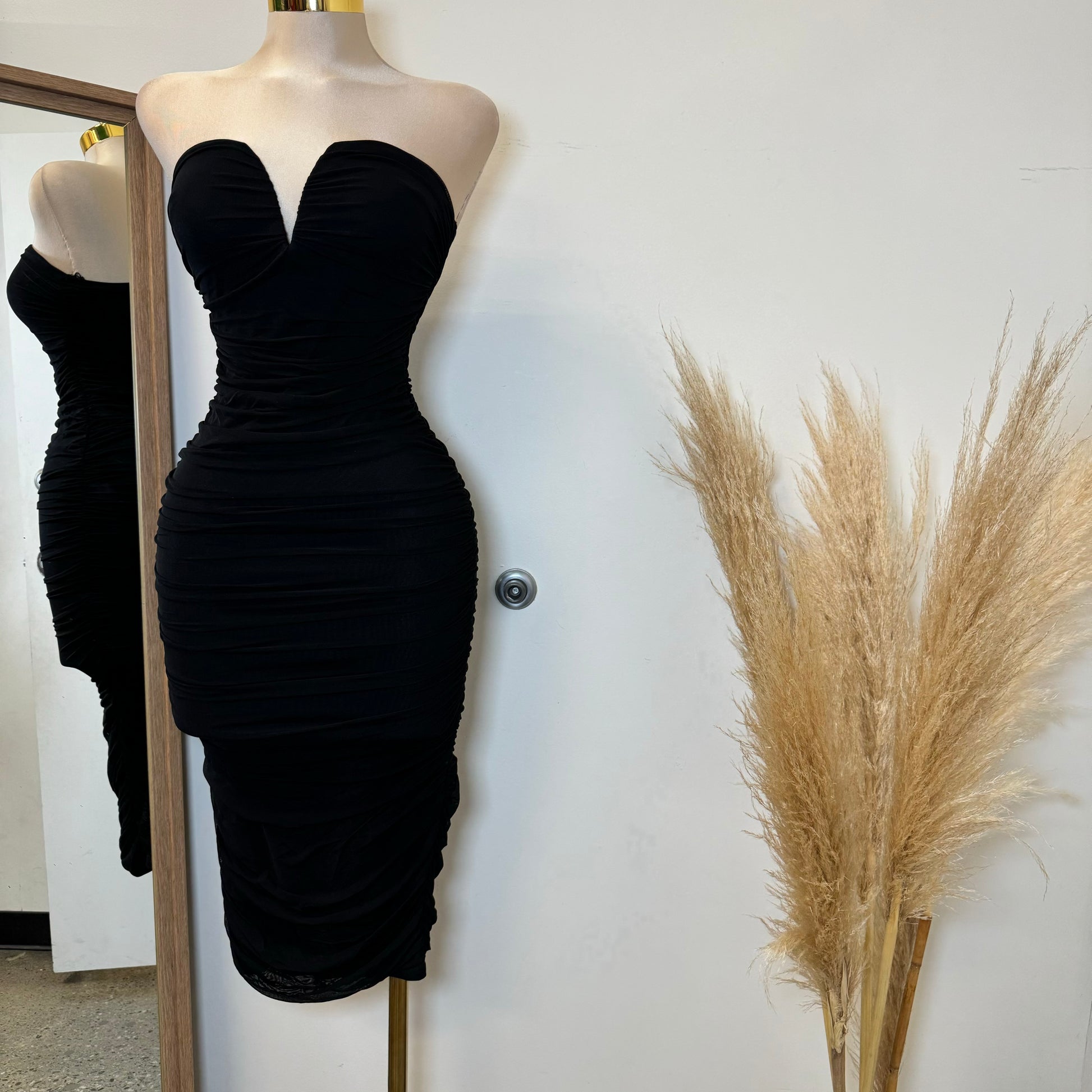 LUXE MESH OFF SHOULDER SWEETHEART SIDE SLITTED RUCHED MIDI LENGTH TUBE DRESS