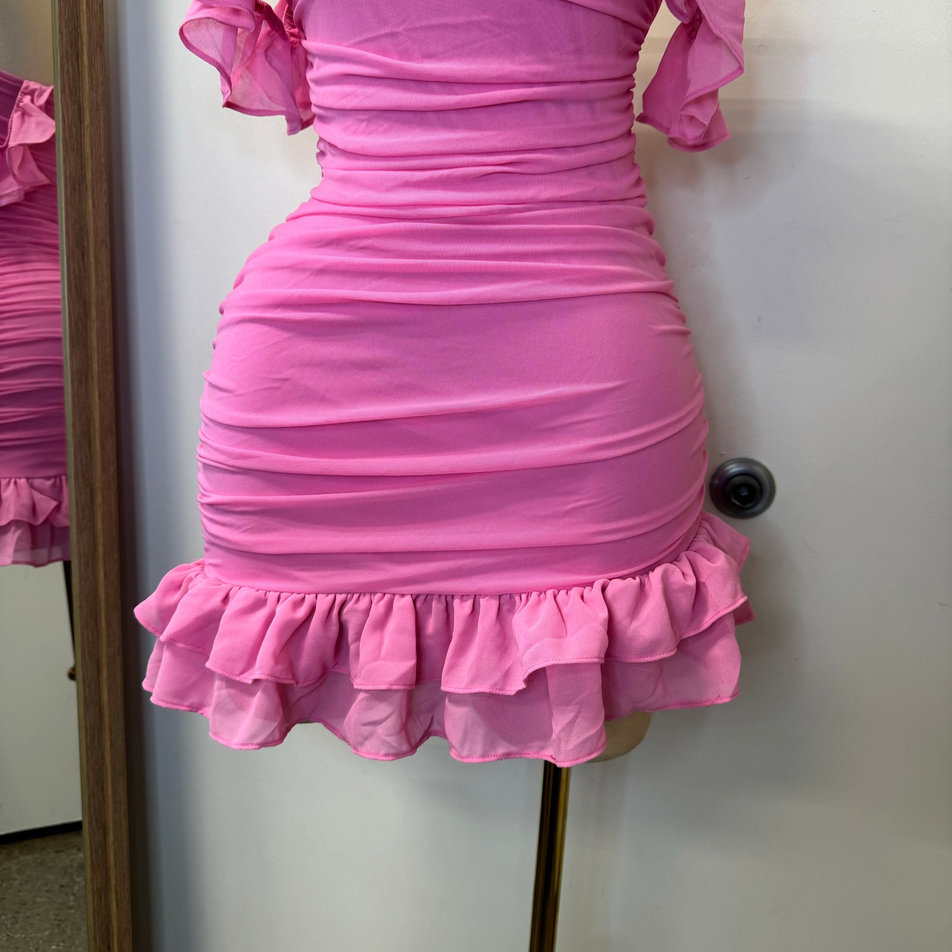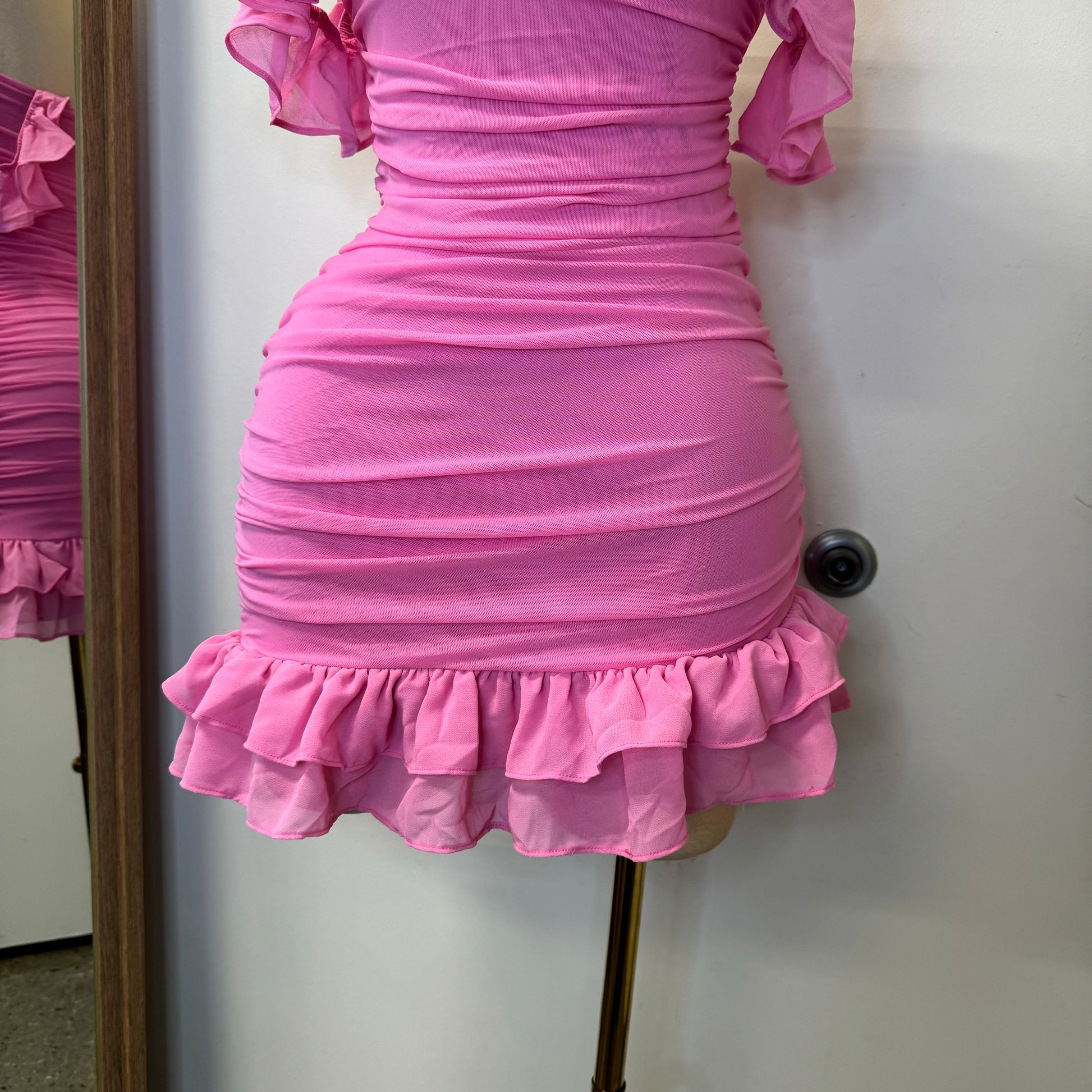 LUXE SUPER STRETCH MESH RUFFLE SLEEVES OFF THE SHOULDER ASYMMETRICAL RUFFLED HEM RUCHED MINI DRESS