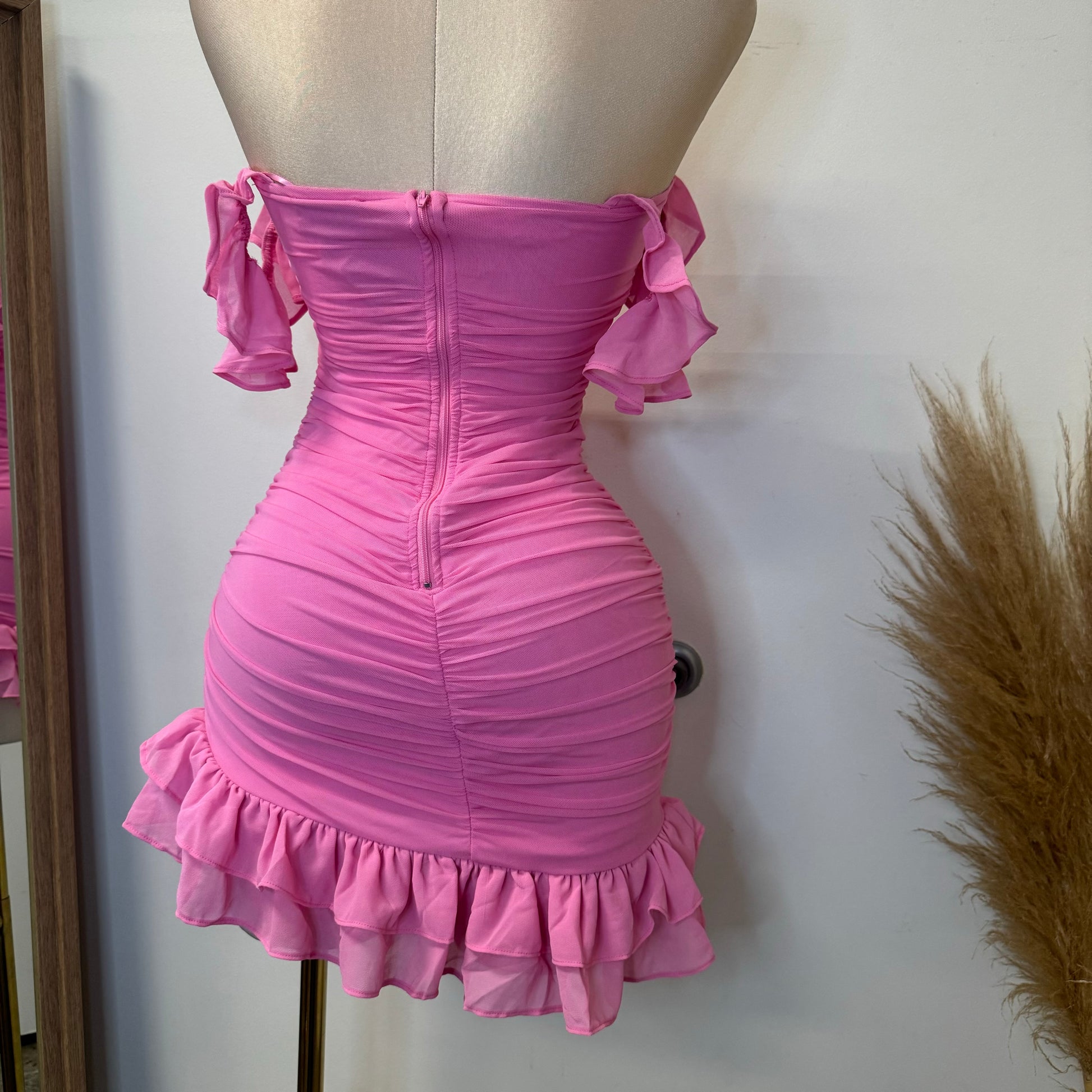 Annalise Off Shoulder Mesh Asymmetrical Ruffle Hem Dress-Pink