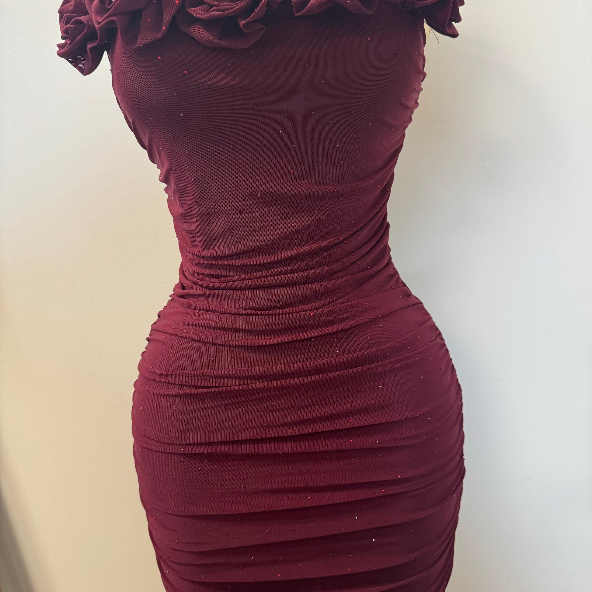 ROMANTIC HOTFIX STONES EMBELLISHED MESH SLEEVELESS ROSETTES RUCHED BACK SLITTED KNEE LENGHT DRESS