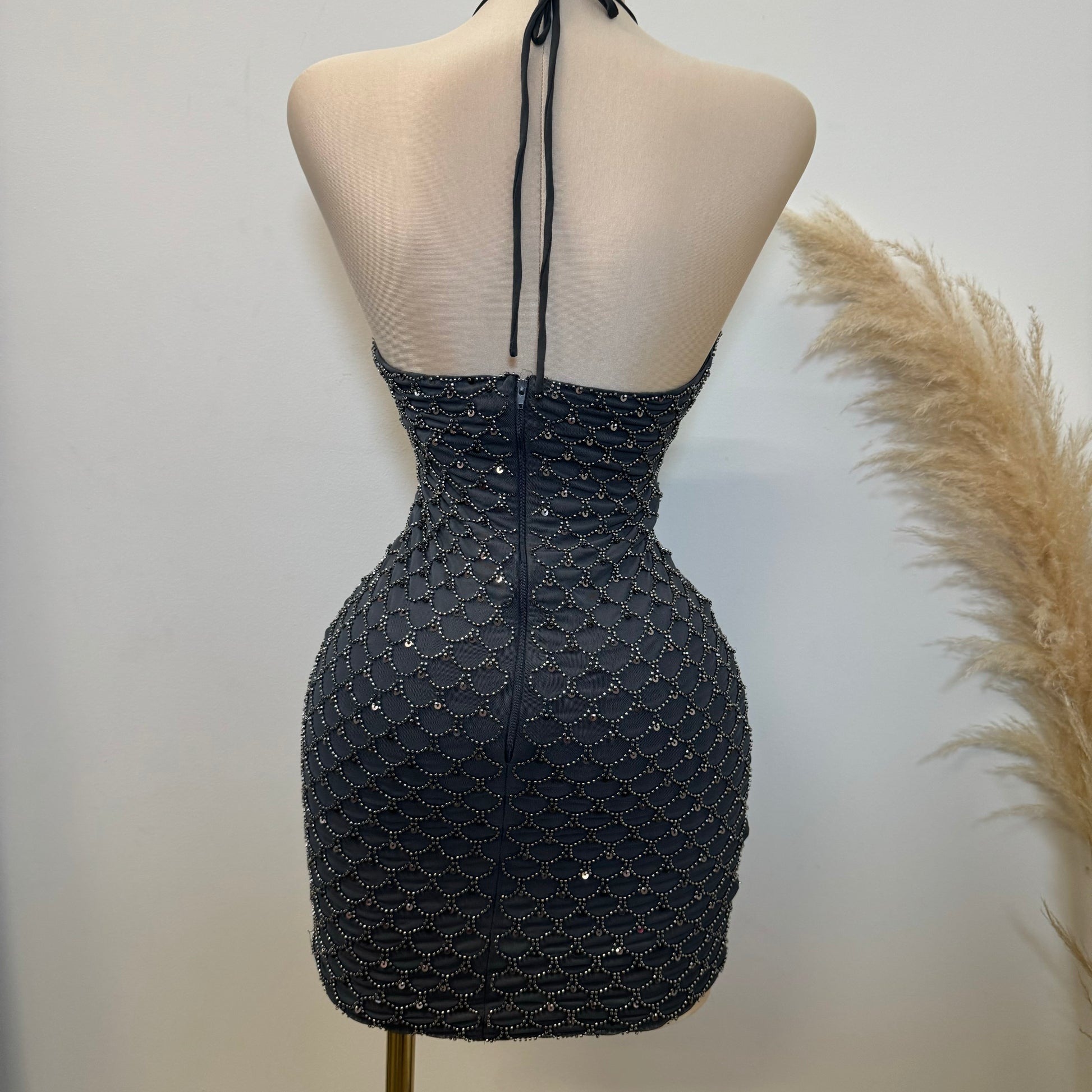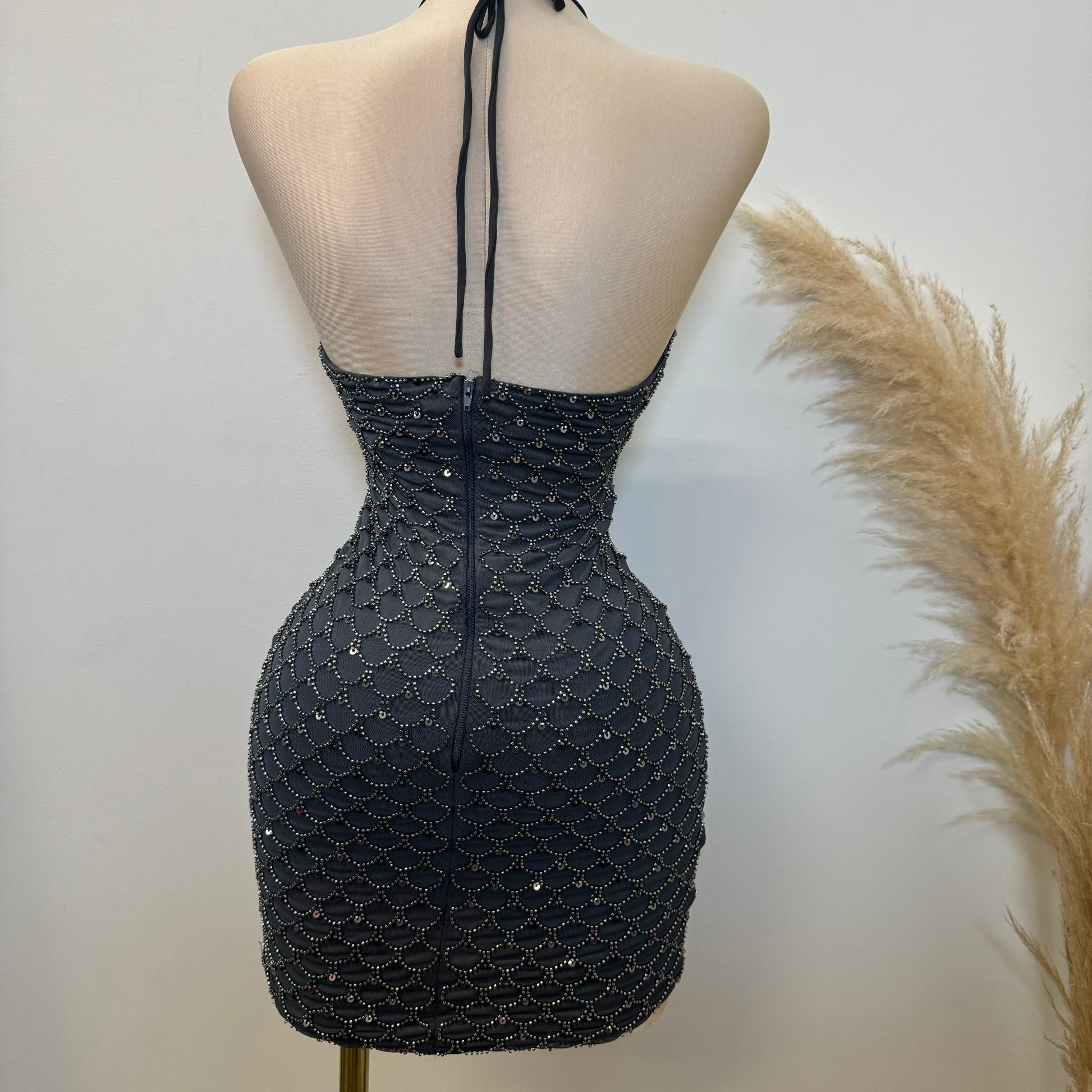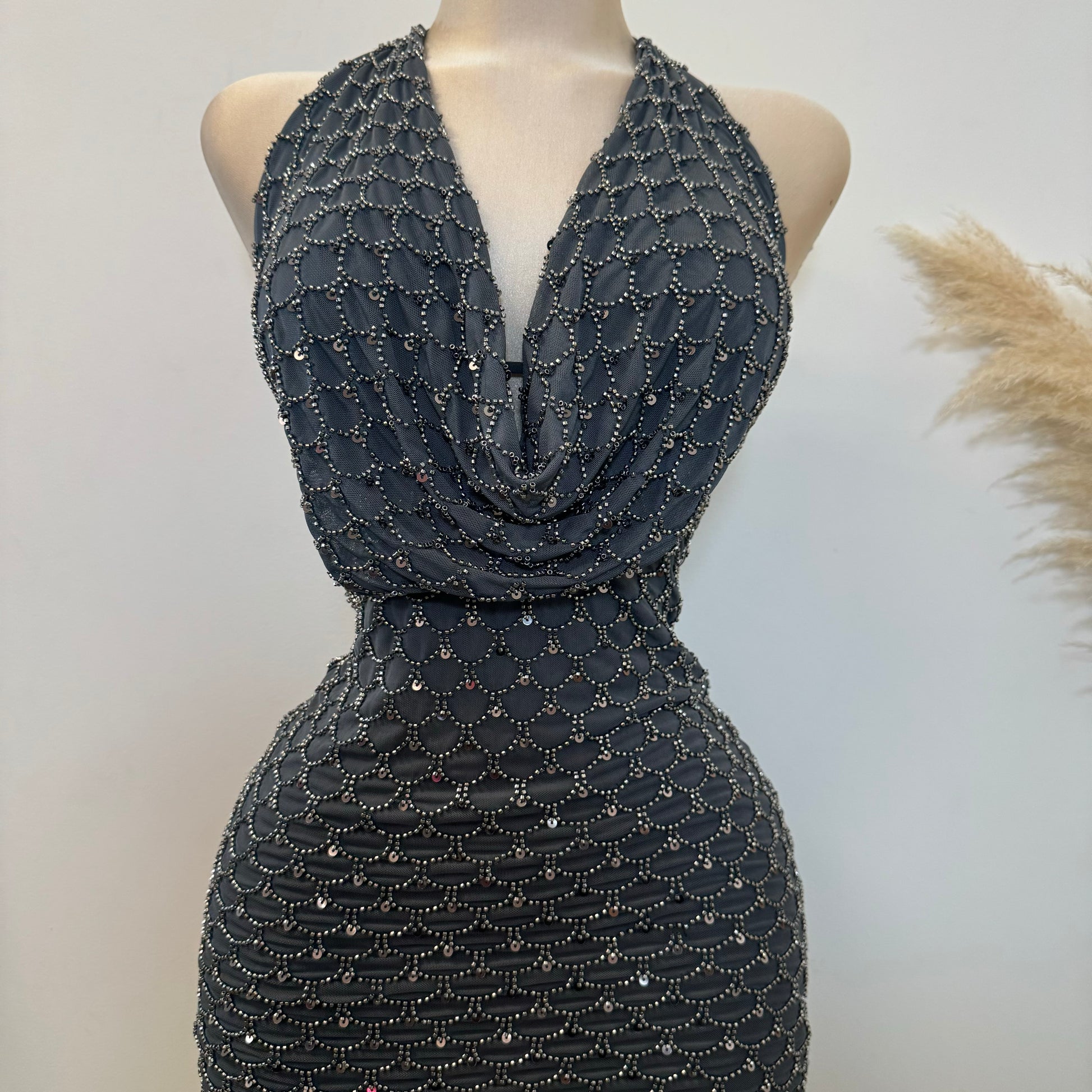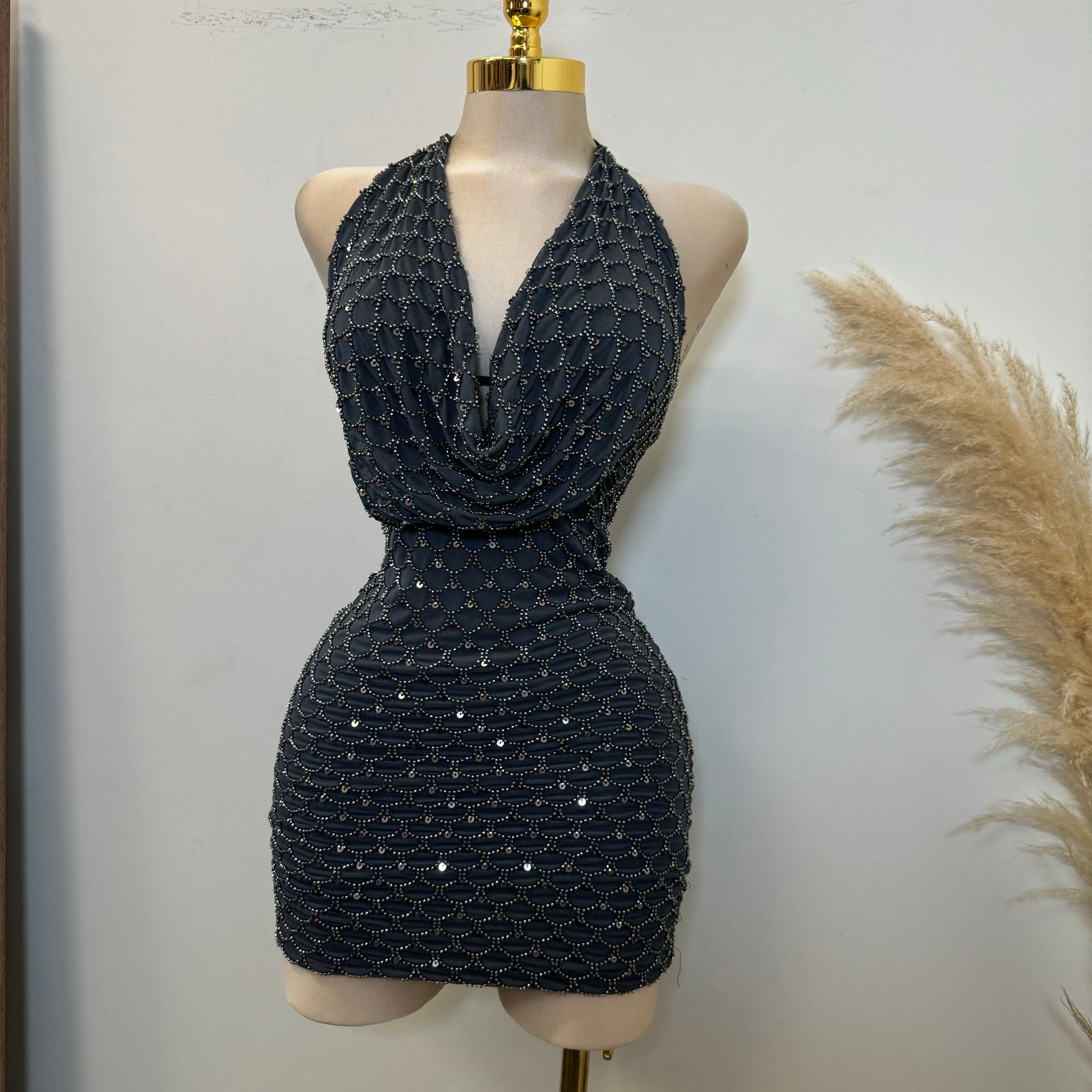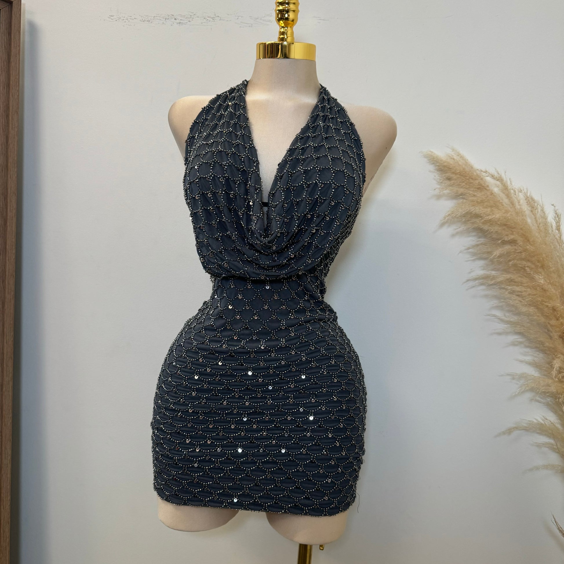 -Bead Scales Deep Cowl Halter Dress Mini Dress