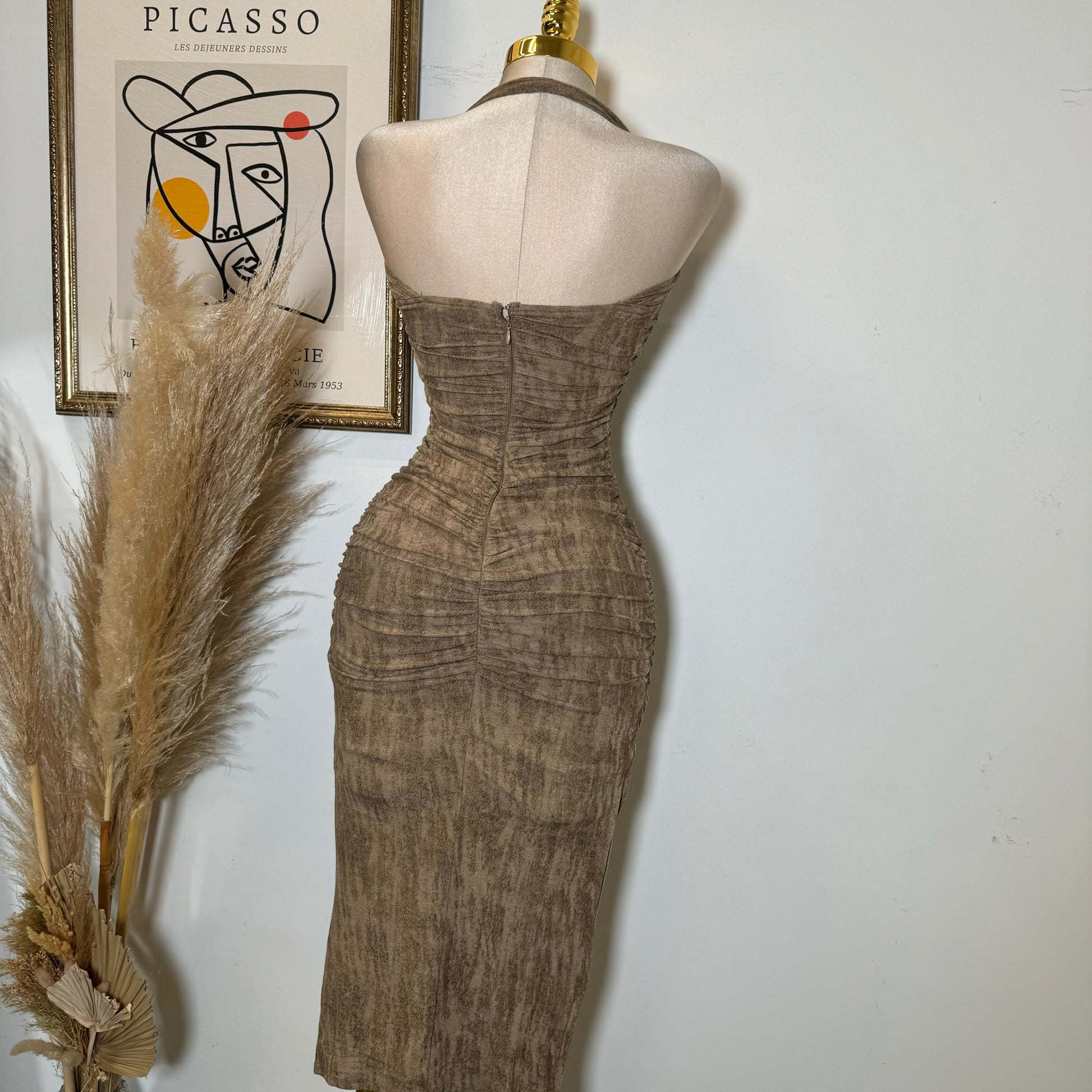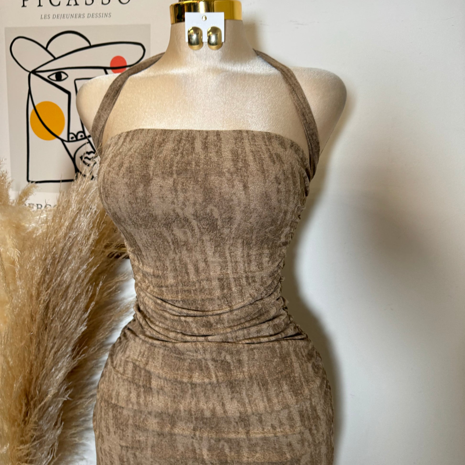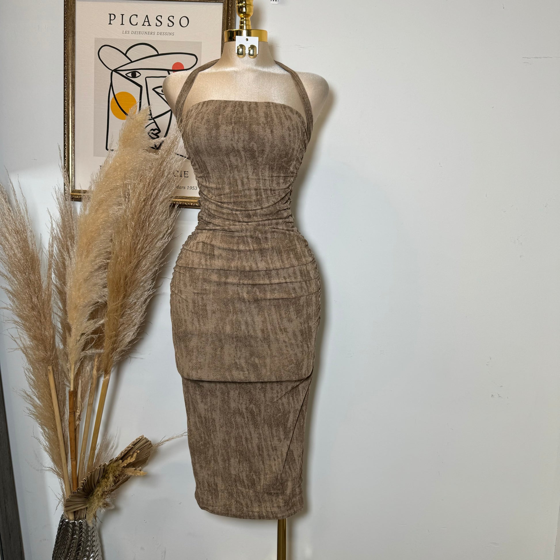 BRUSHED KNIT TUBE MOCK NECK MIDI DRESS-Mocha