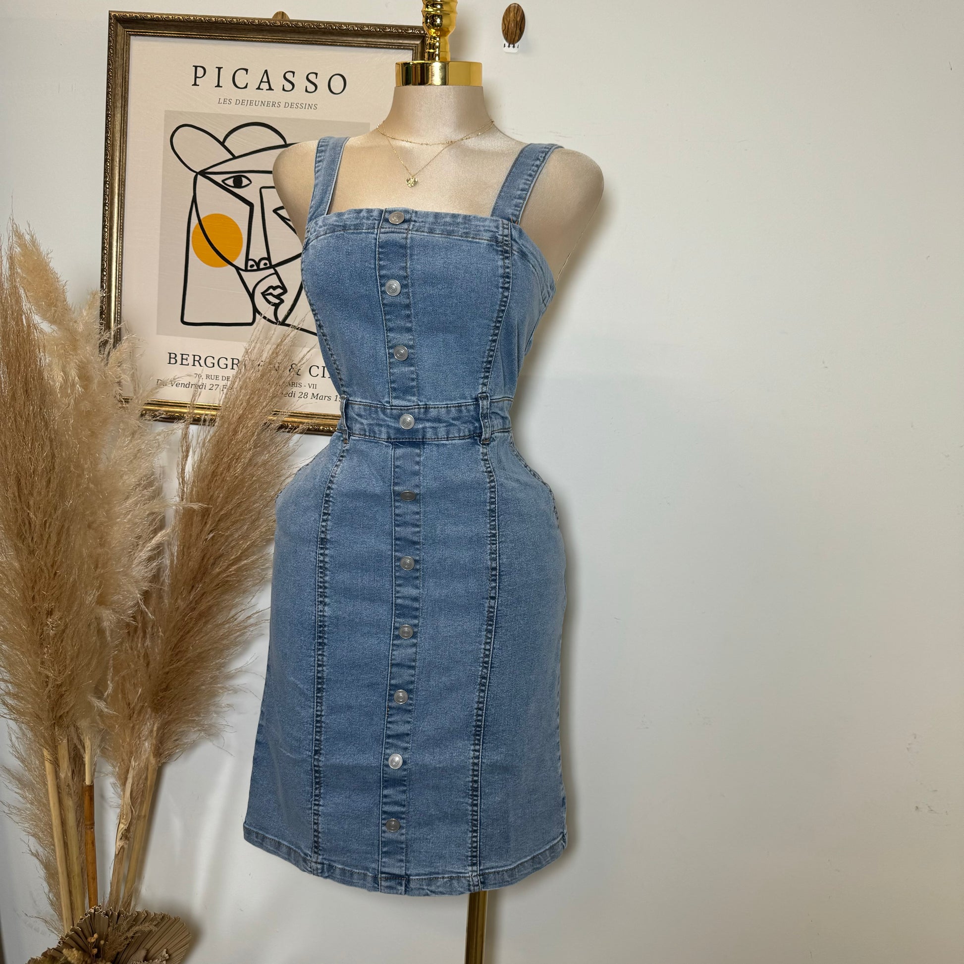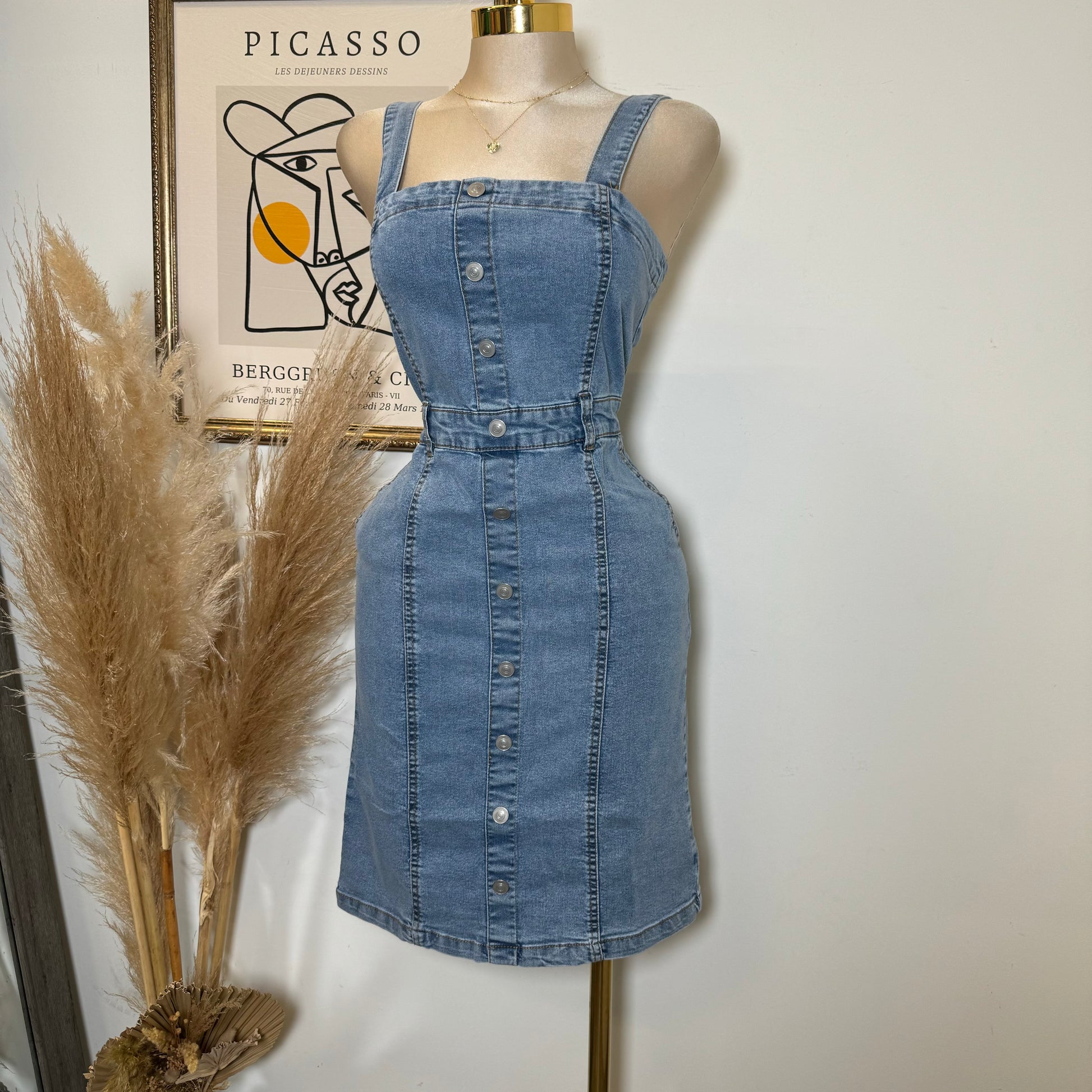 - STRAIGHT NECKLINE WITH BUTTON DOWN PLACKET STRETCH DENIM DRESS