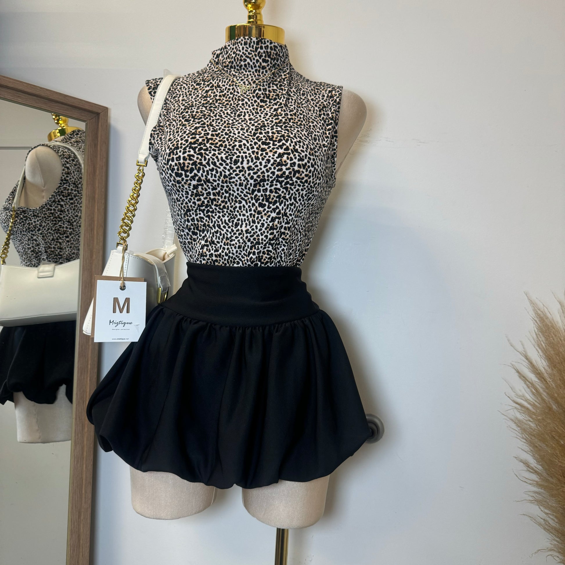 -Sleeve less Mock Neck animal Printed Rib knit Top