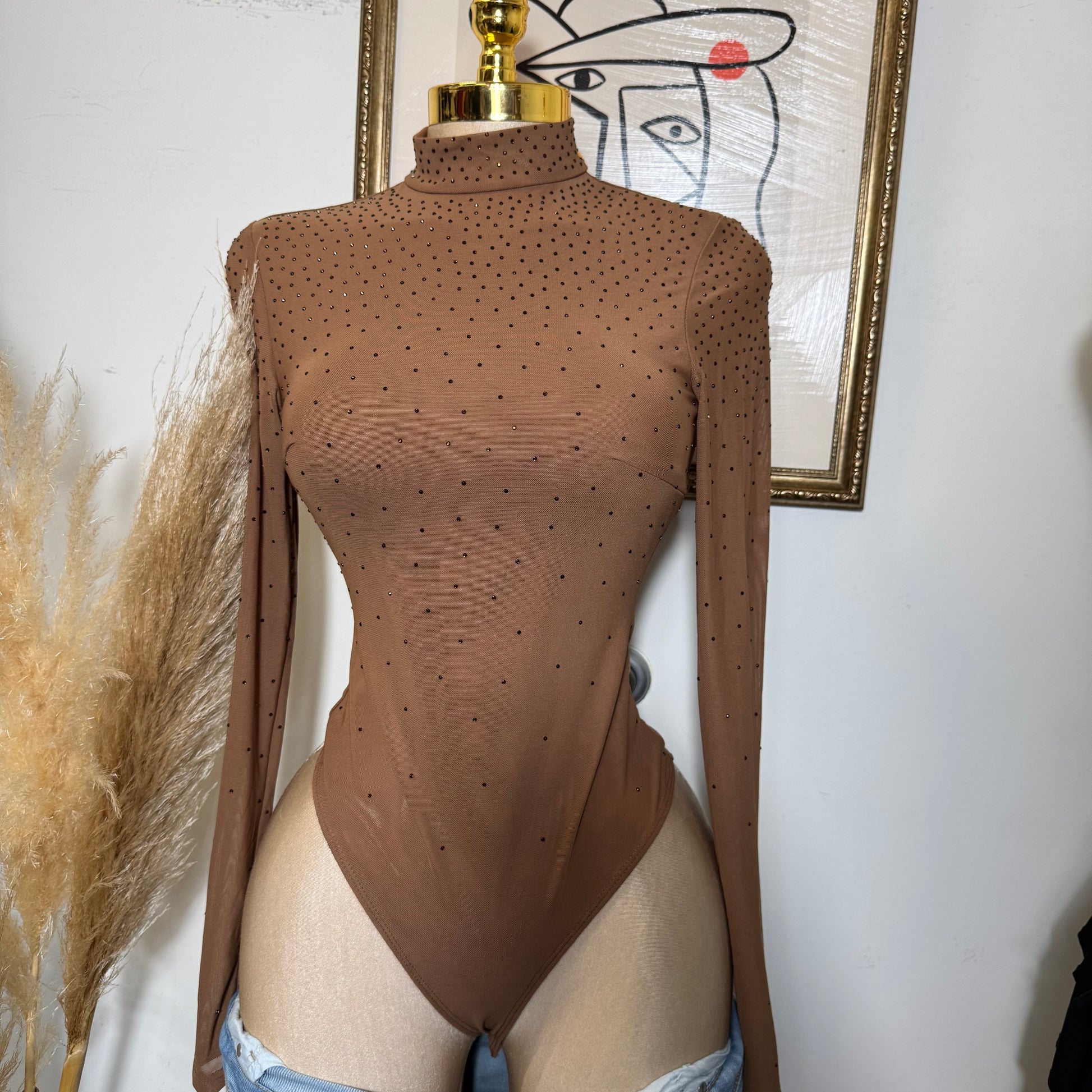 Chic Rhinestone Embellished Mock Neck Bodysuit Top-Mocha