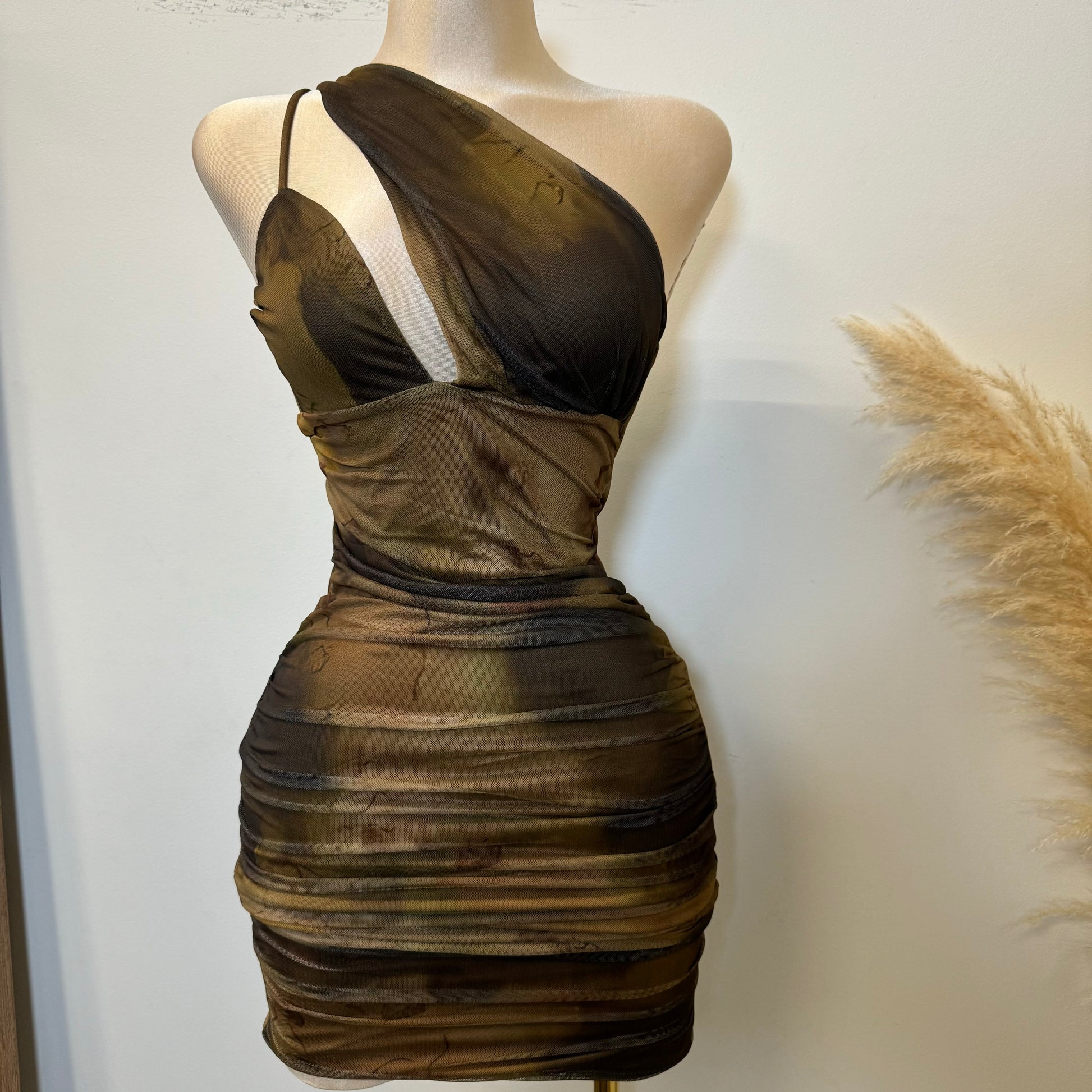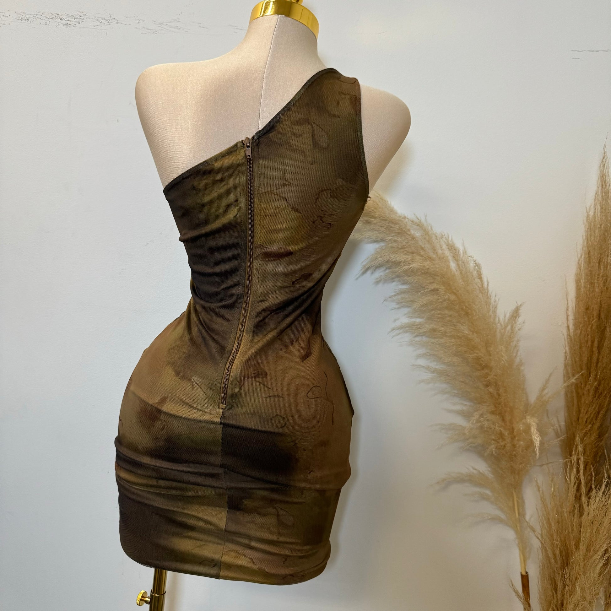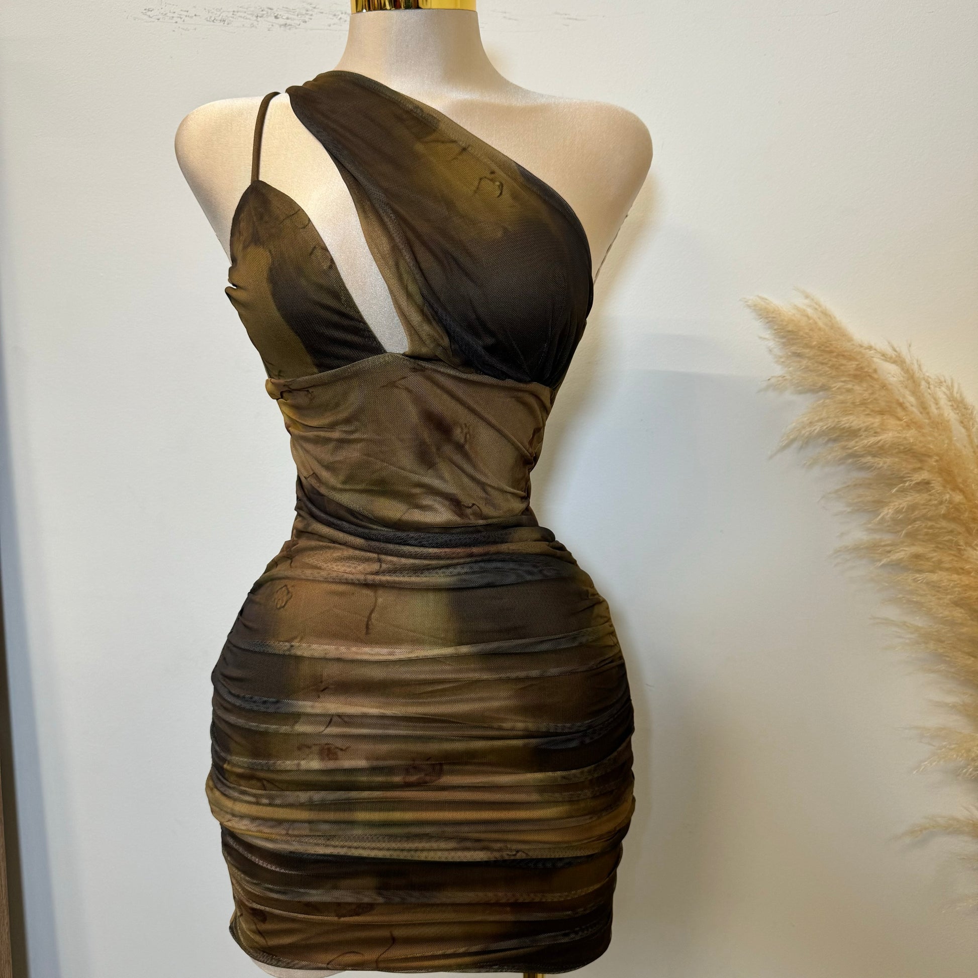 LUXE ESPRESSO TIE DYE MESH ONE SHOULDER WITH CUTOUT KNEE LENGTH BODYCON DRESS