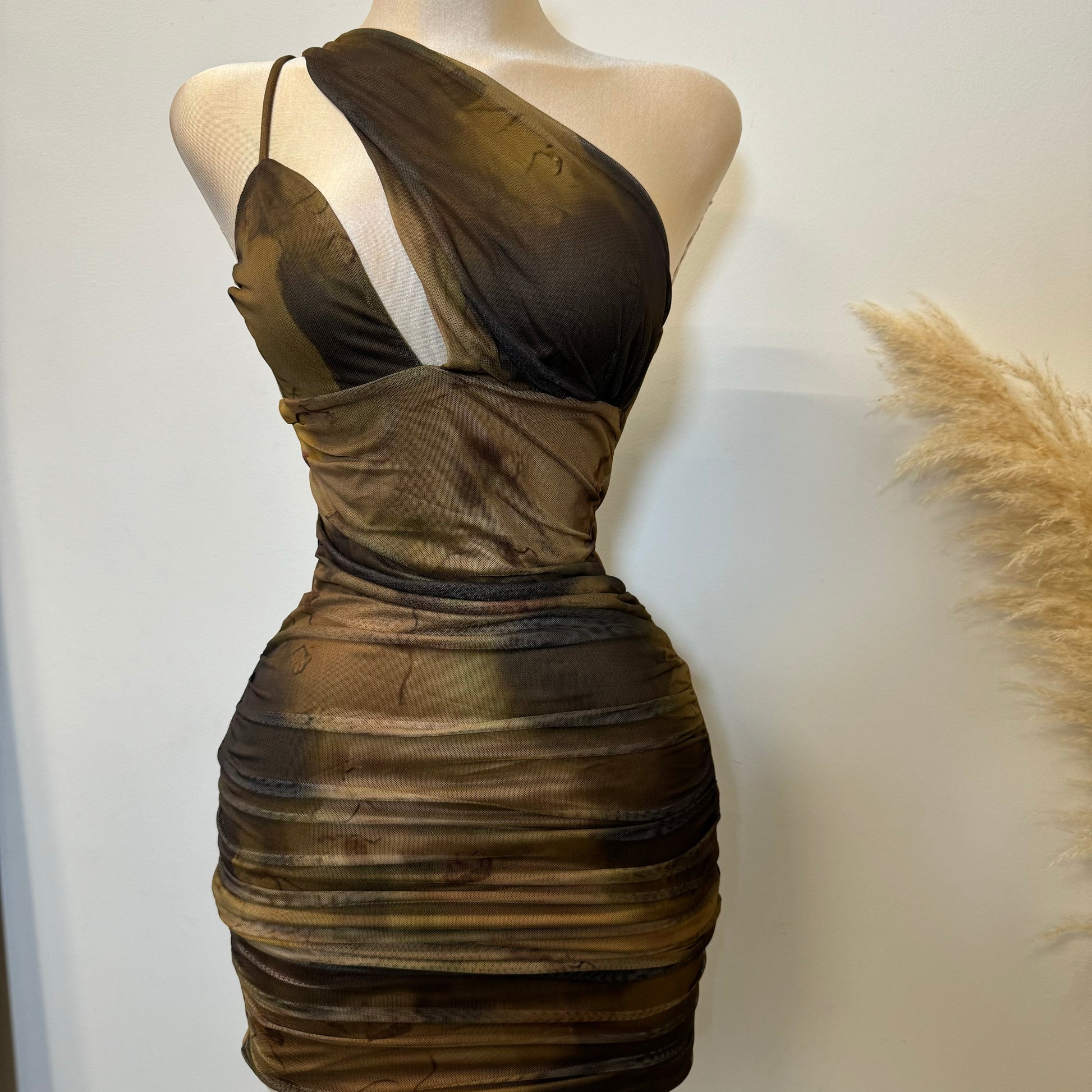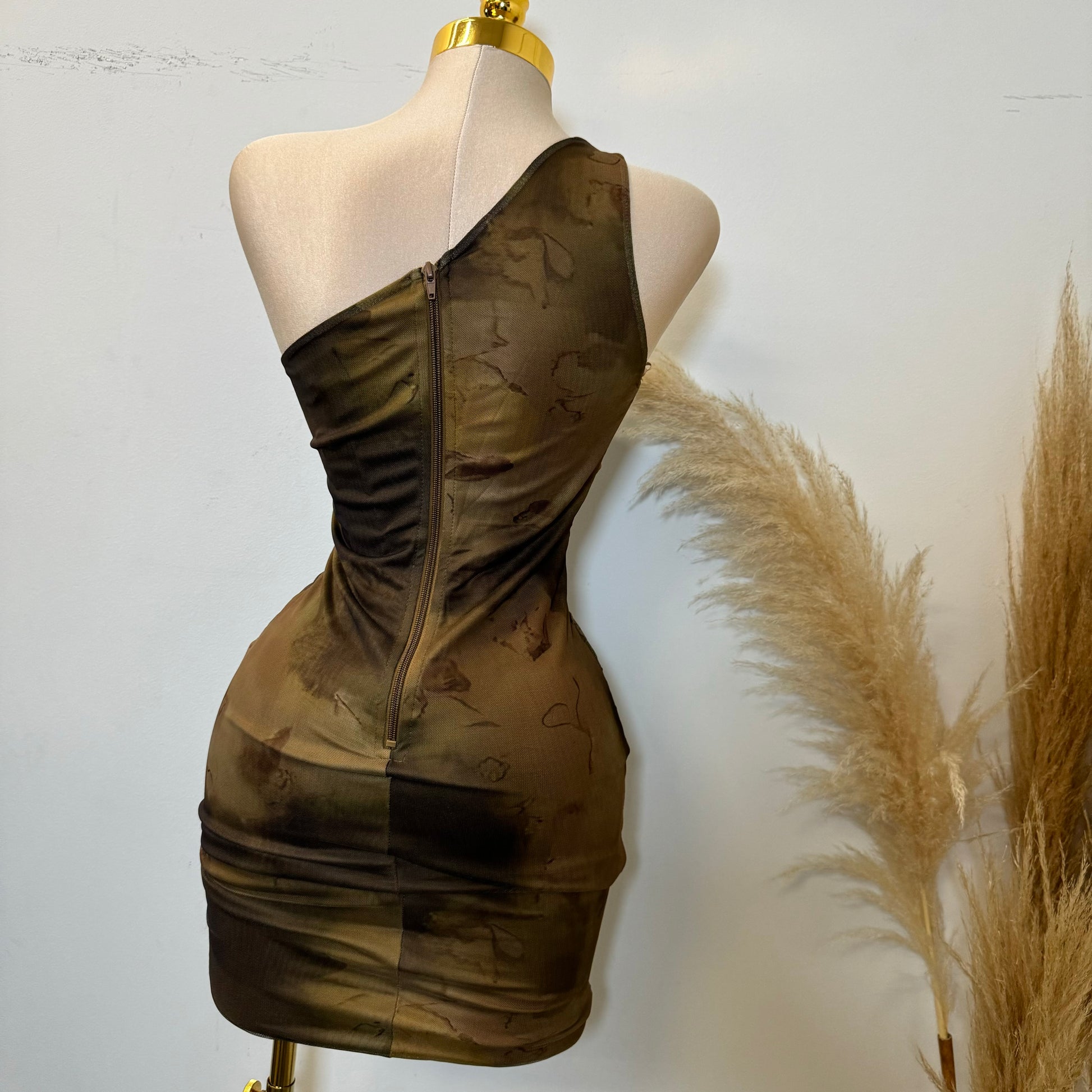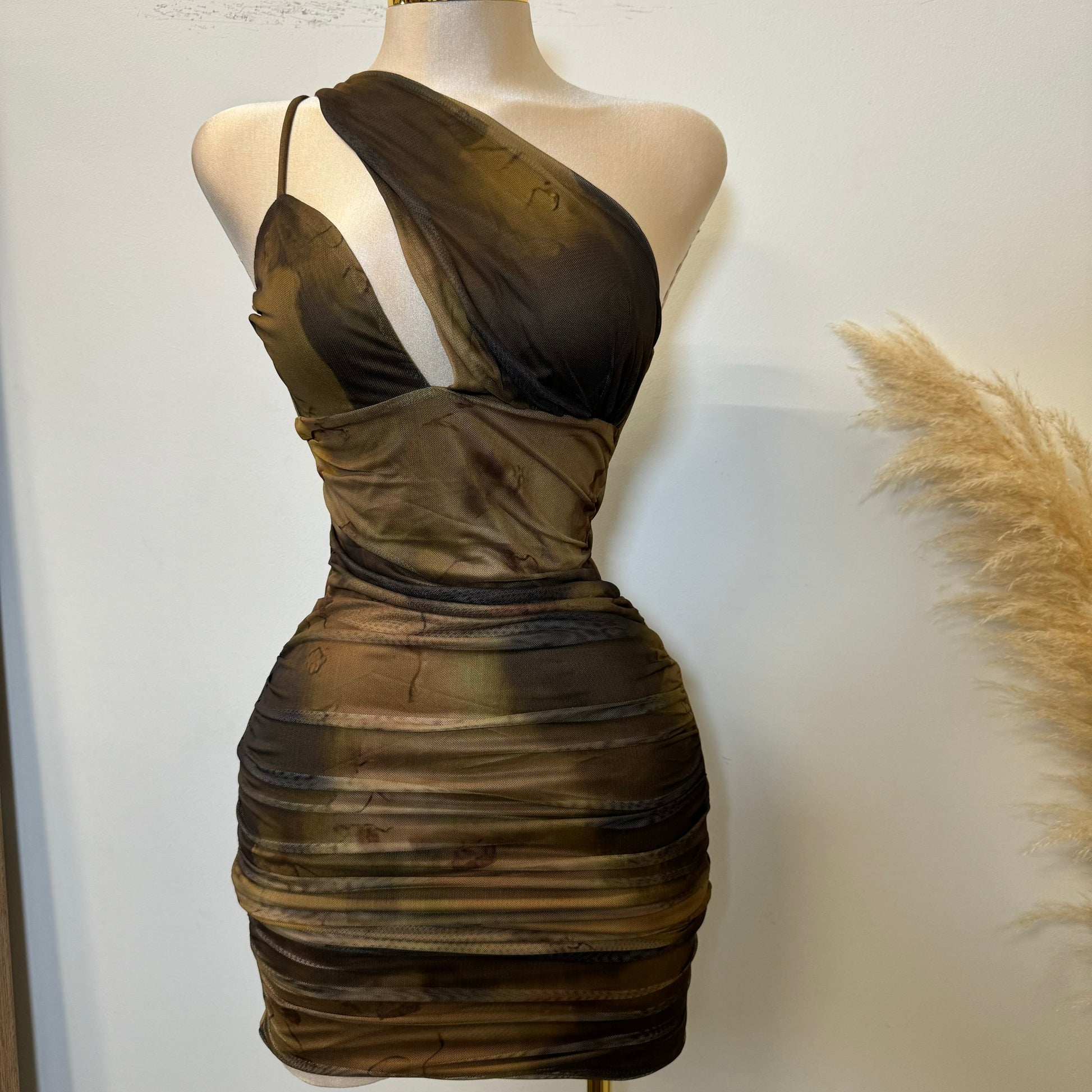 LUXE ESPRESSO TIE DYE MESH ONE SHOULDER WITH CUTOUT KNEE LENGTH BODYCON DRESS