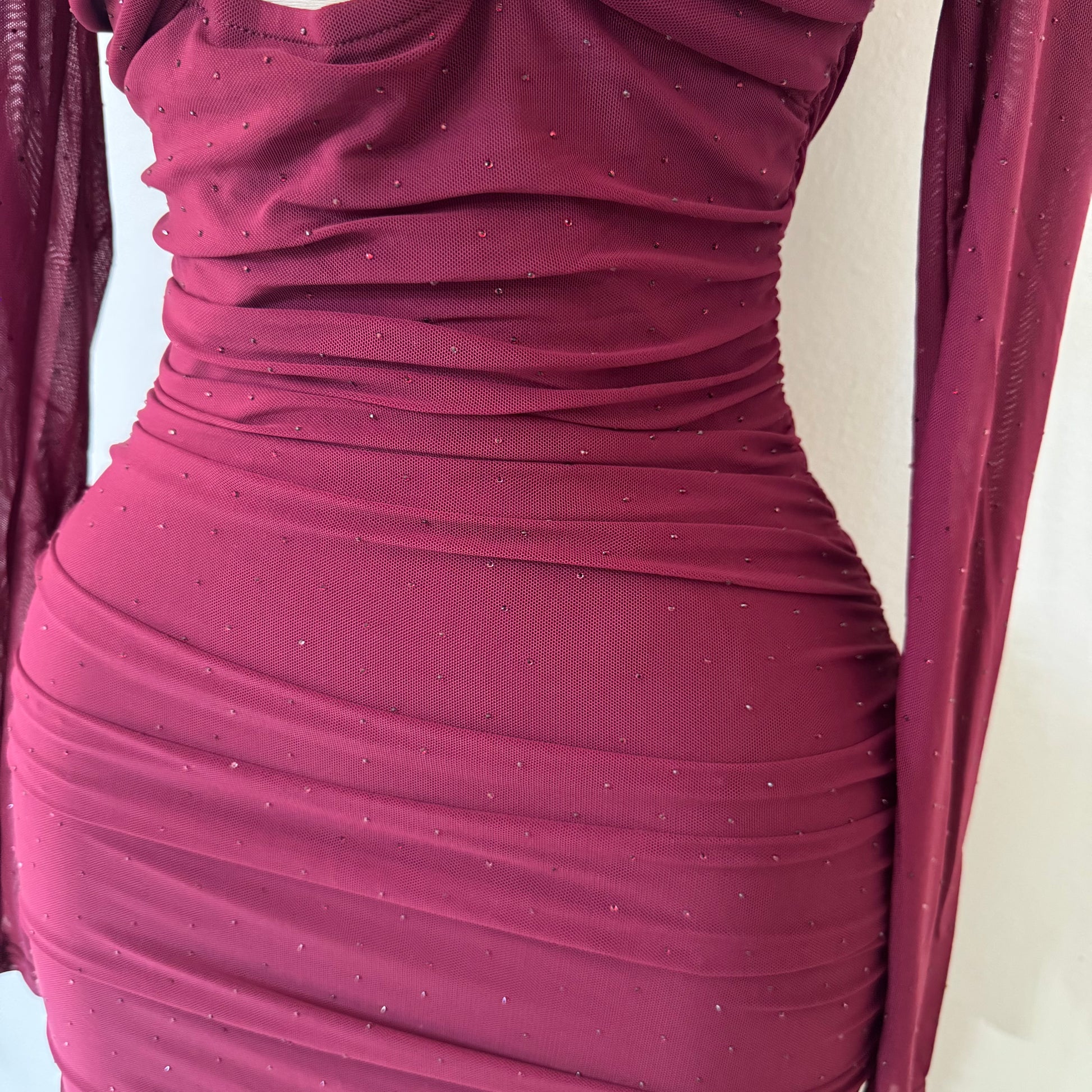 Sweet Heart Long Sleeve Rucing Rhinestone Midi Dress- Burgundy