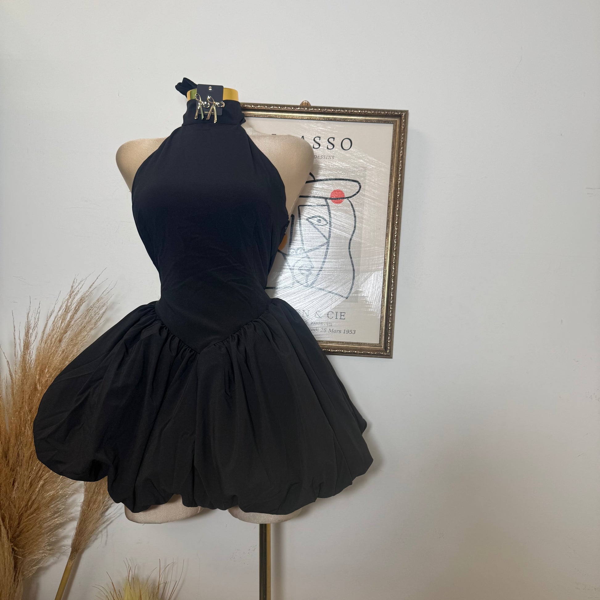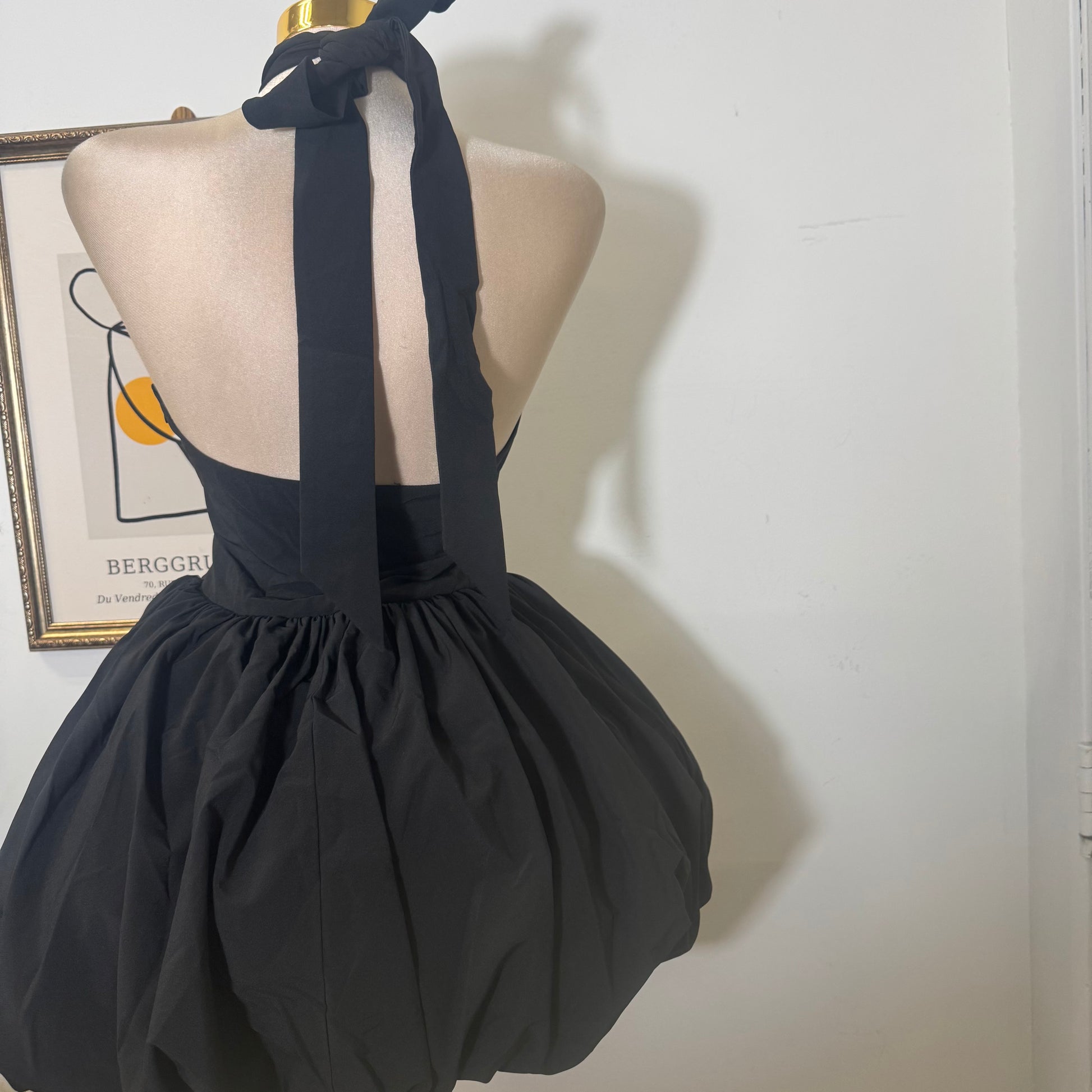 Crepe High Halter Neckline Bow tie Detail Dress-Black