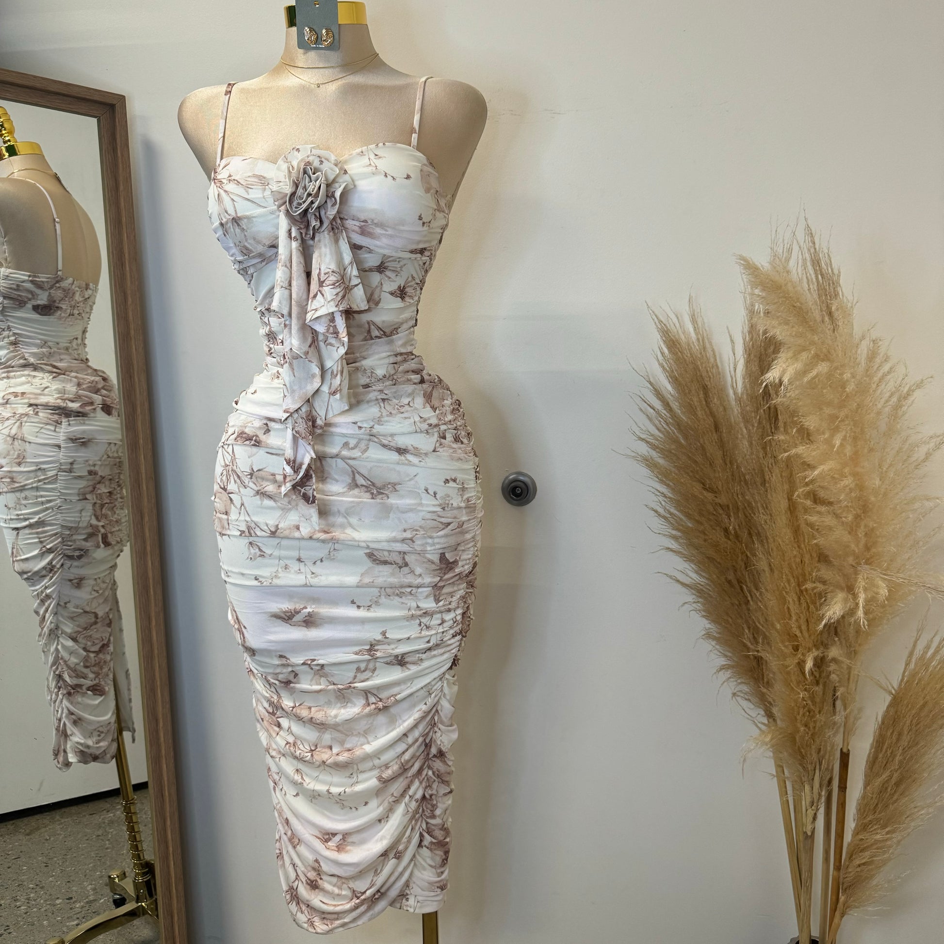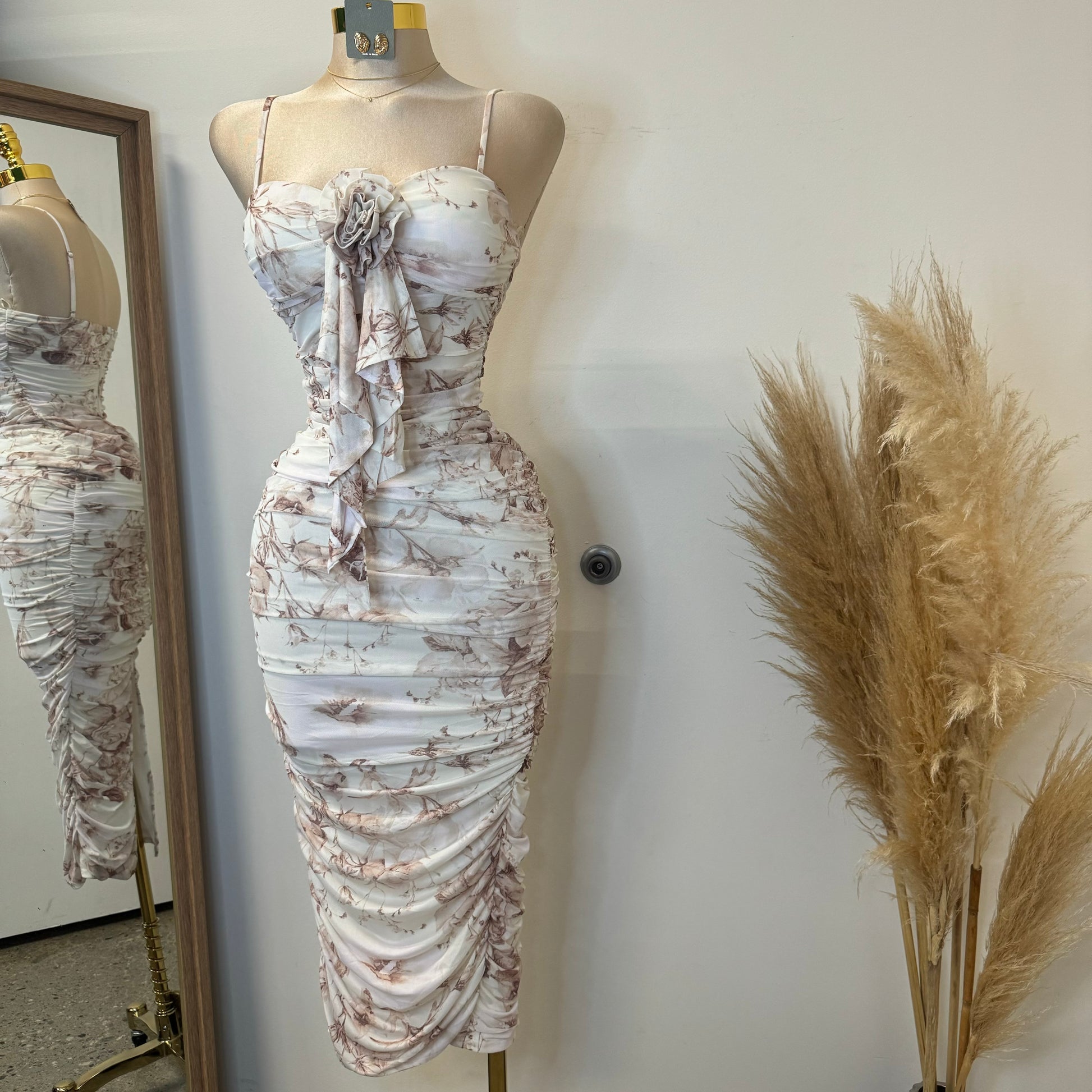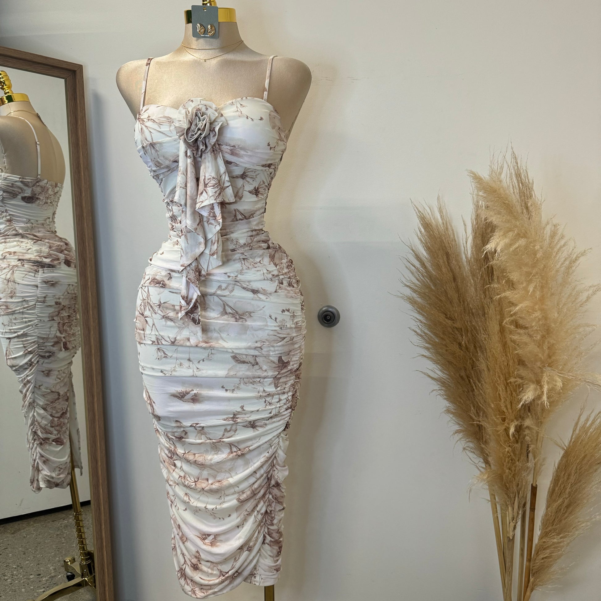 Daisy Floral Mesh Rossete Ruched Midi Dress-Brown