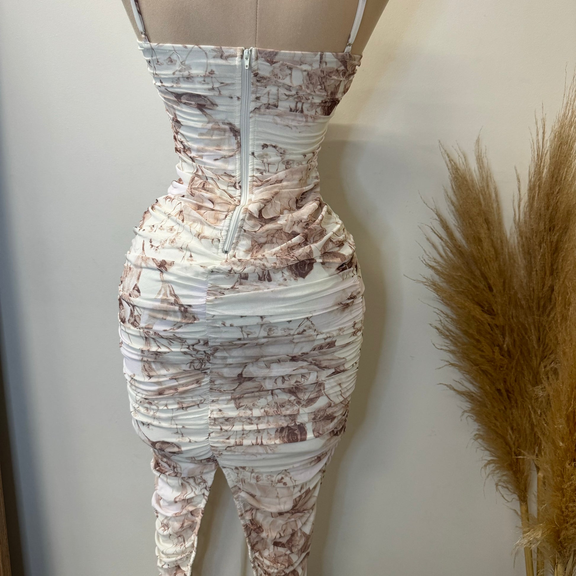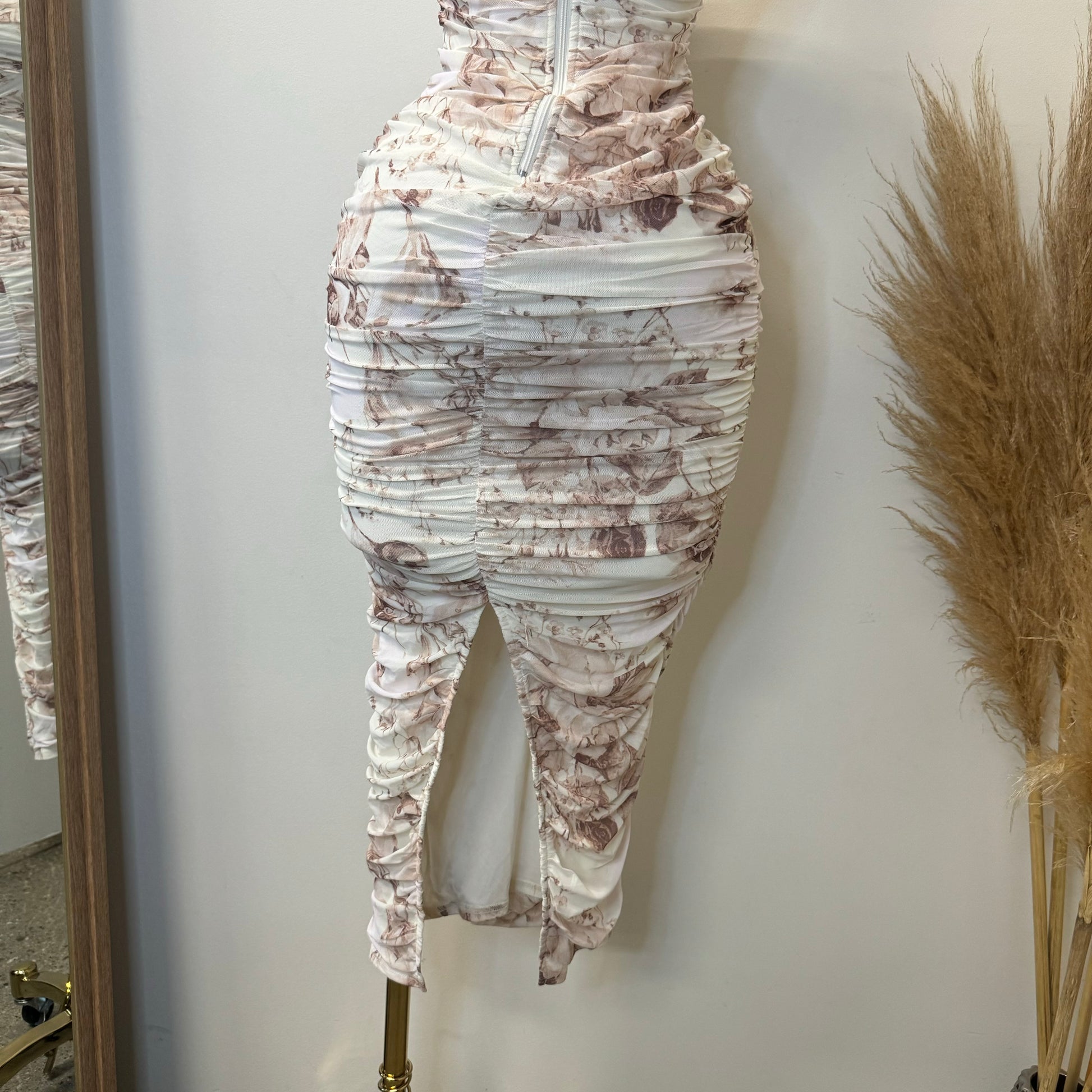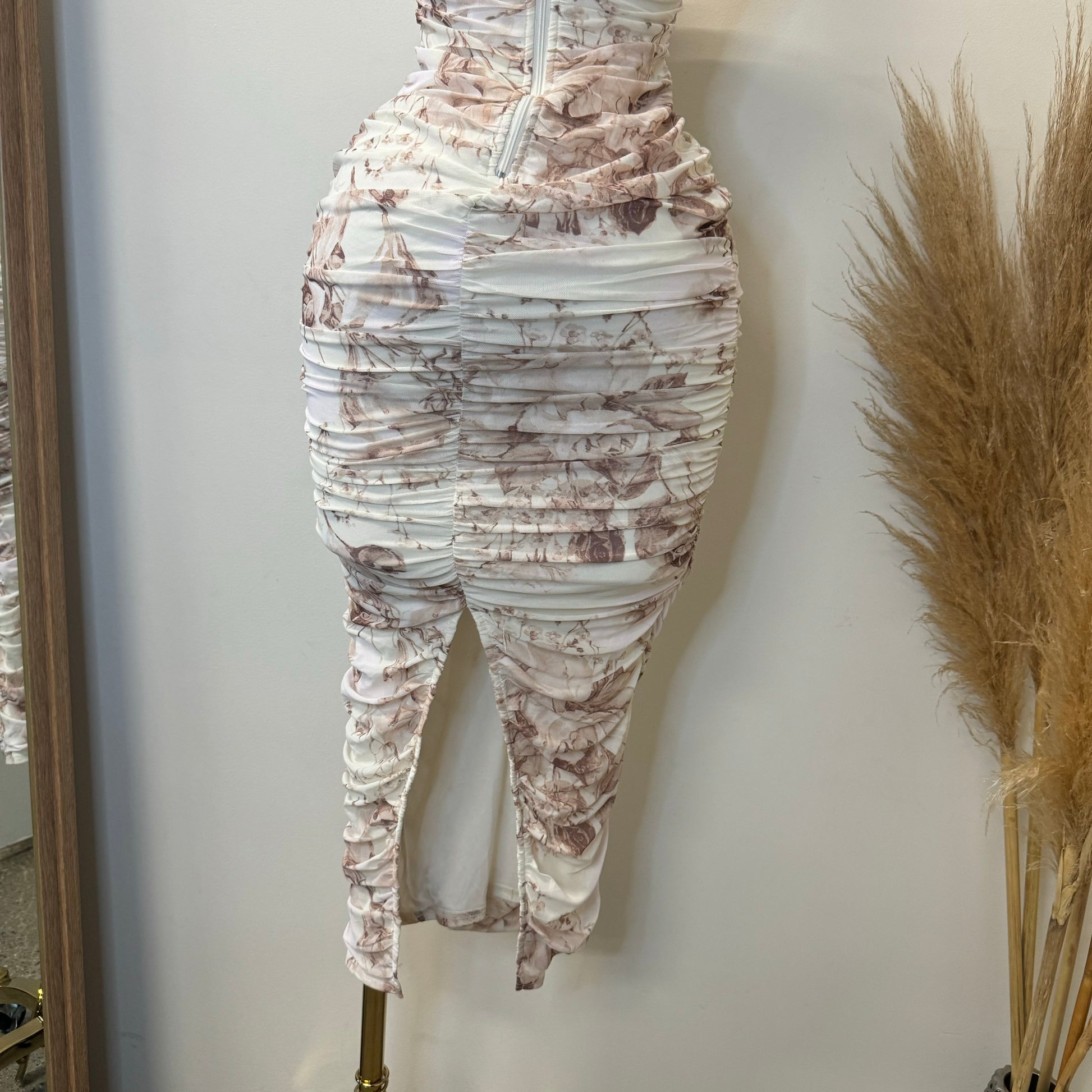 Daisy Floral Mesh Rossete Ruched Midi Dress-Brown