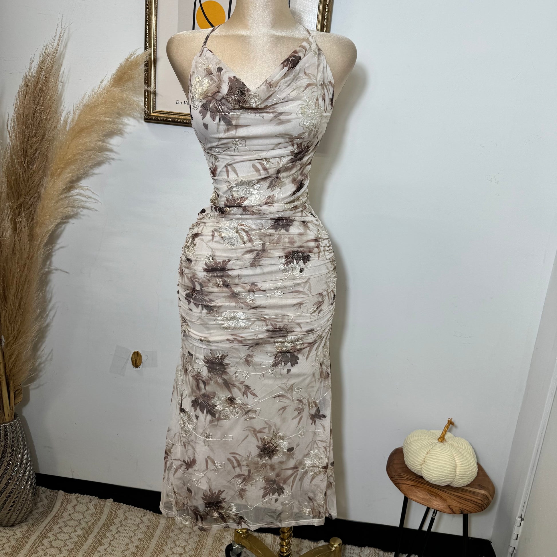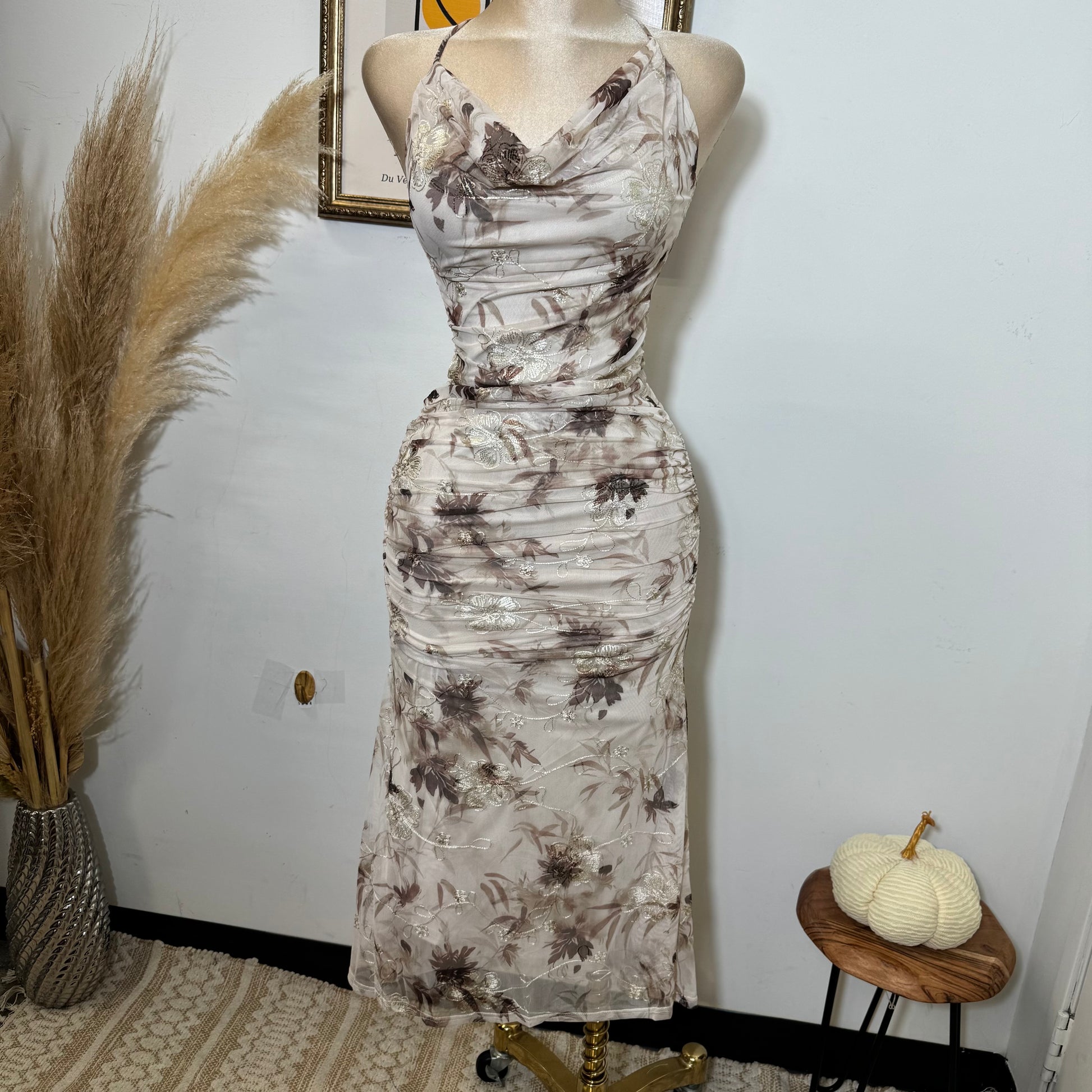 Deep Plunge Halter Neck a-Line Midi Dress-Brown