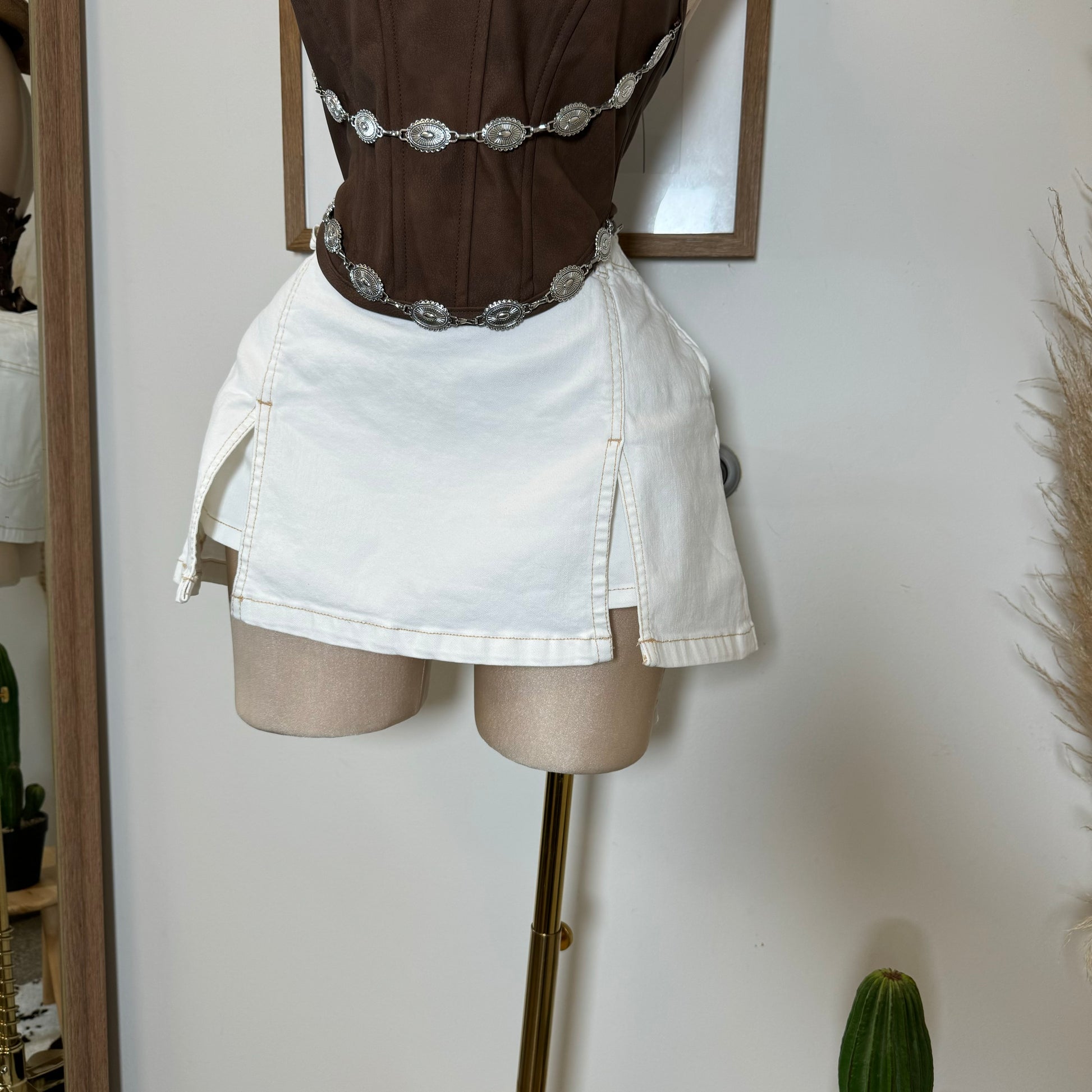 Double Side Slit Denim Skort-White