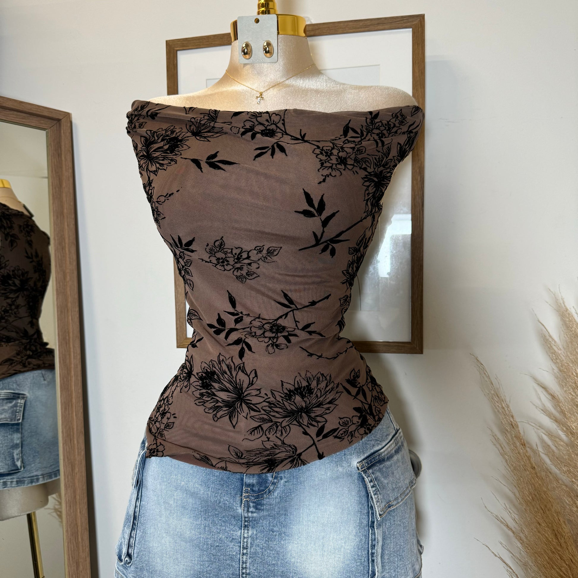 Elina Flocked Mesh Off Shoulder Top-Mocha