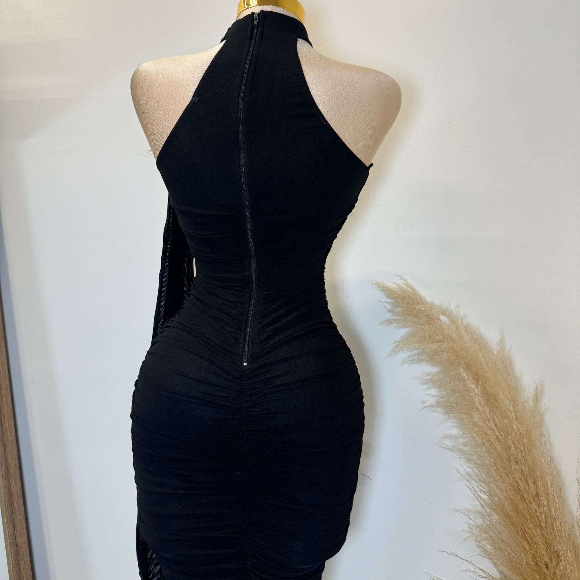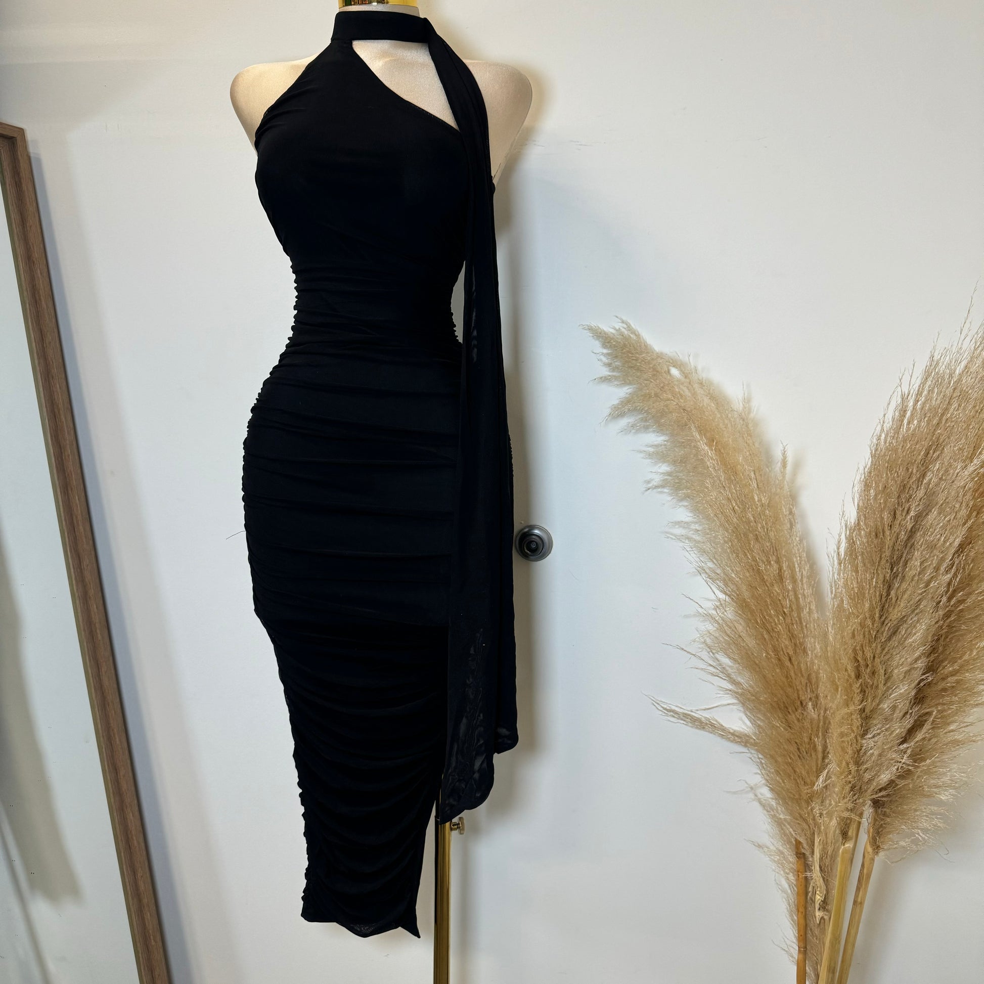 LUXE MESH ASYMMETRIC MOCK NECK WITH BACK DRAPED RUCHED BODYCON SLITTED MIDI DRESS