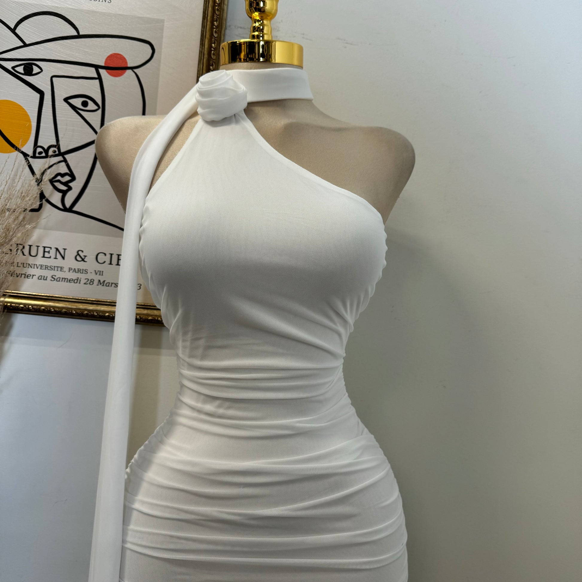 LUXE MESH ASYMMETRIC MOCK NECK WITH BACK DRAPED RUCHED BODYCON SLITTED MIDI DRESS