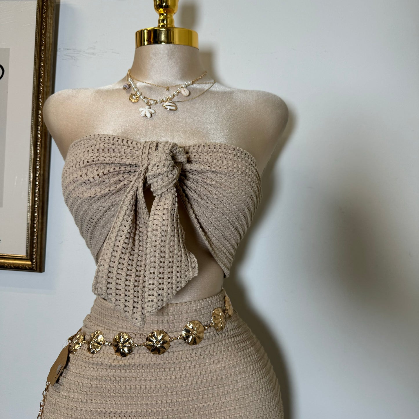 Fishnet Textured Knit Bow Tie Tube Top & Skirt Set-Beige