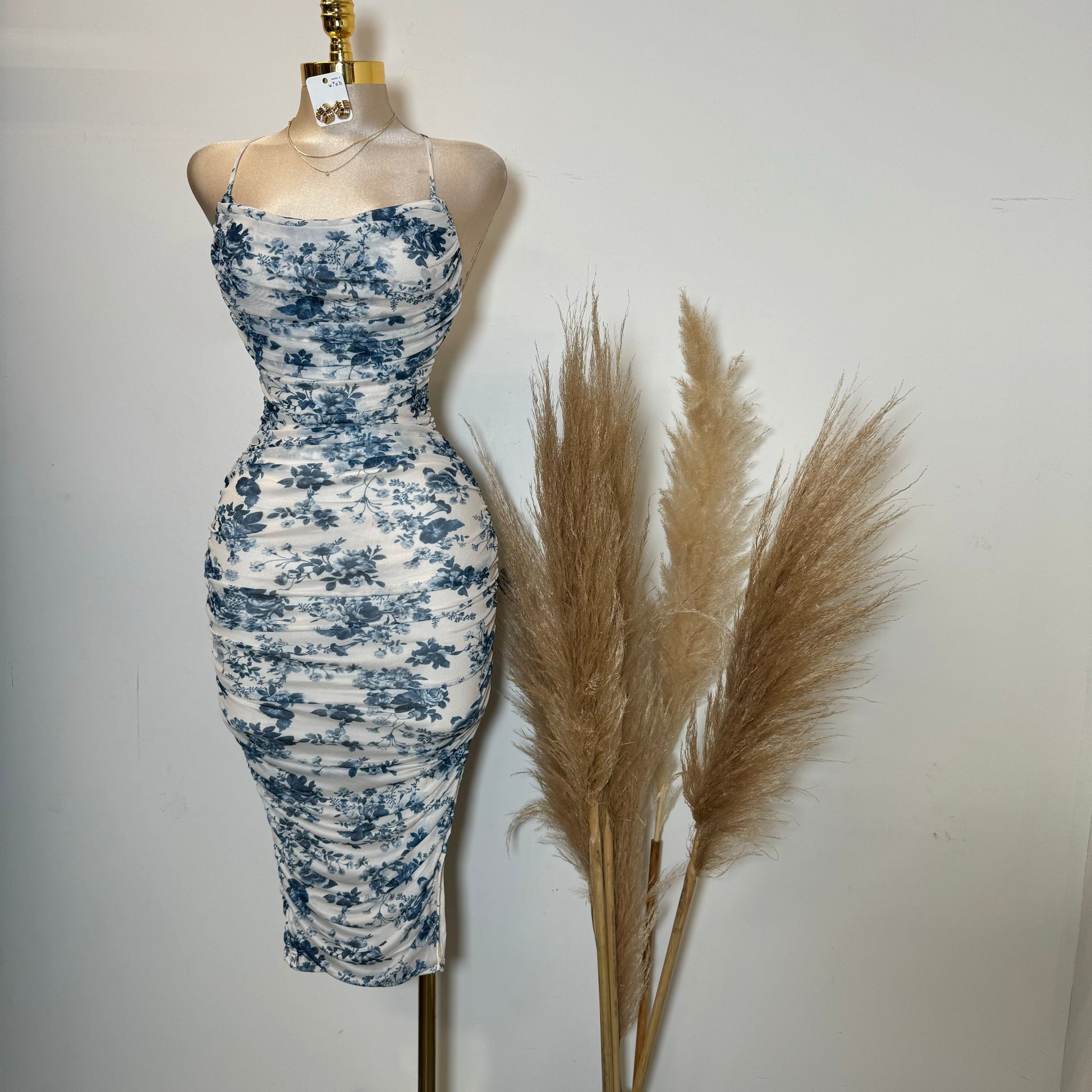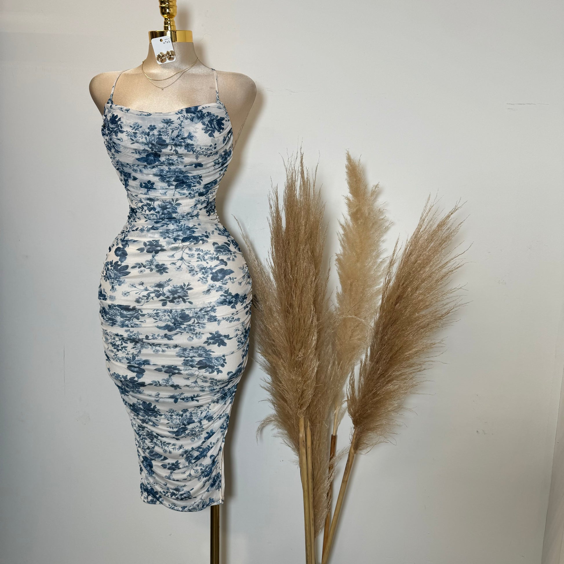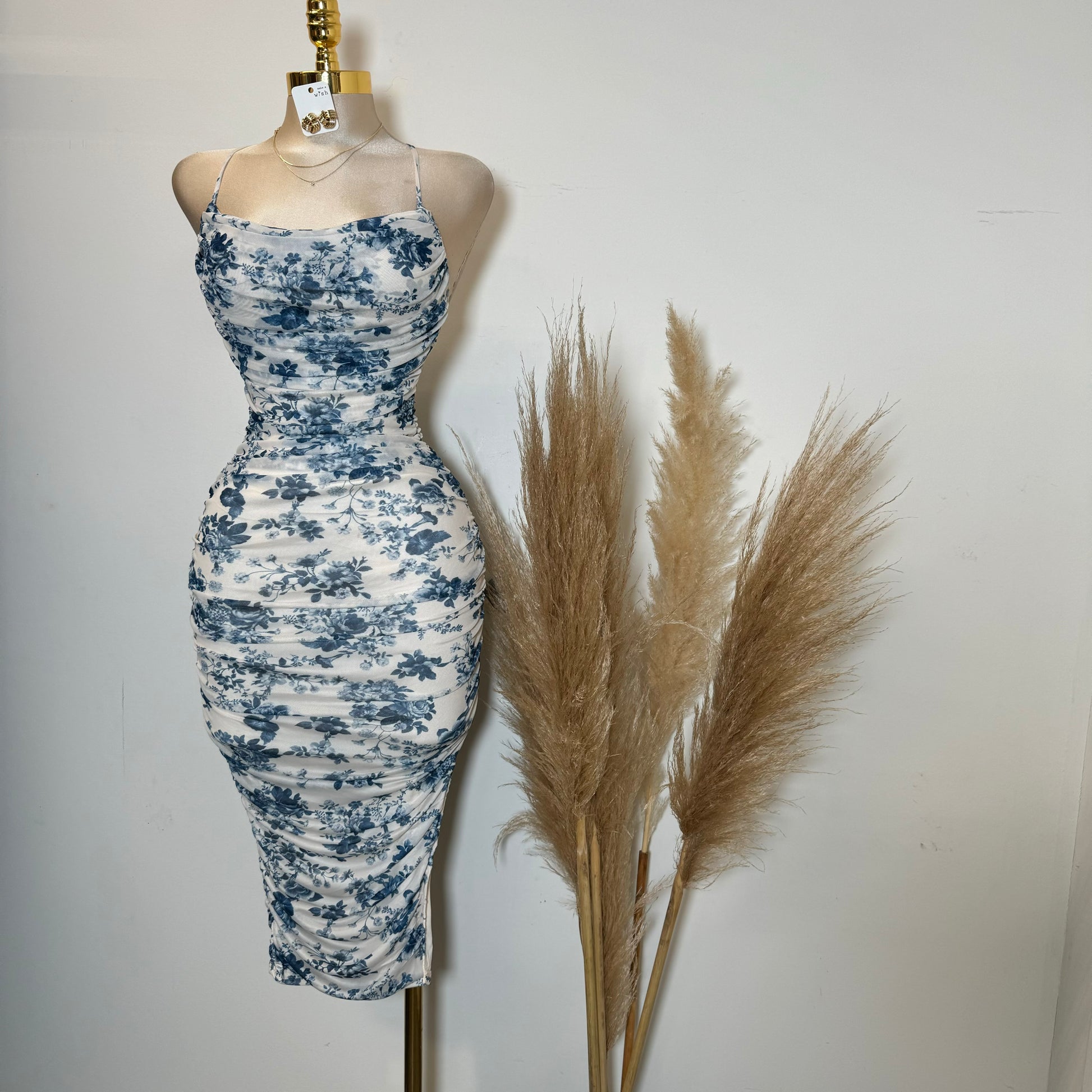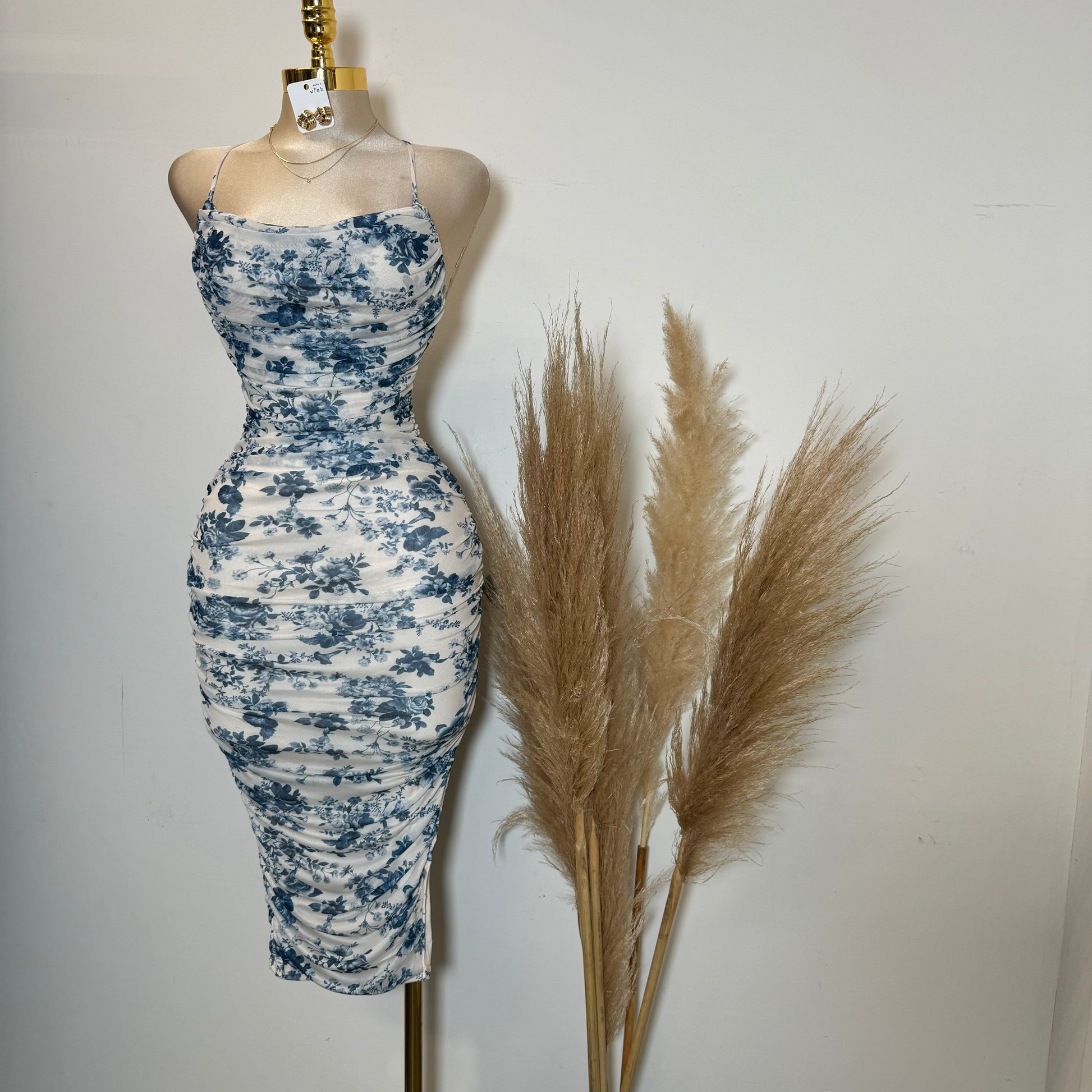 Floral Pleated Neckline Ruched Mini Dress-Blue/White