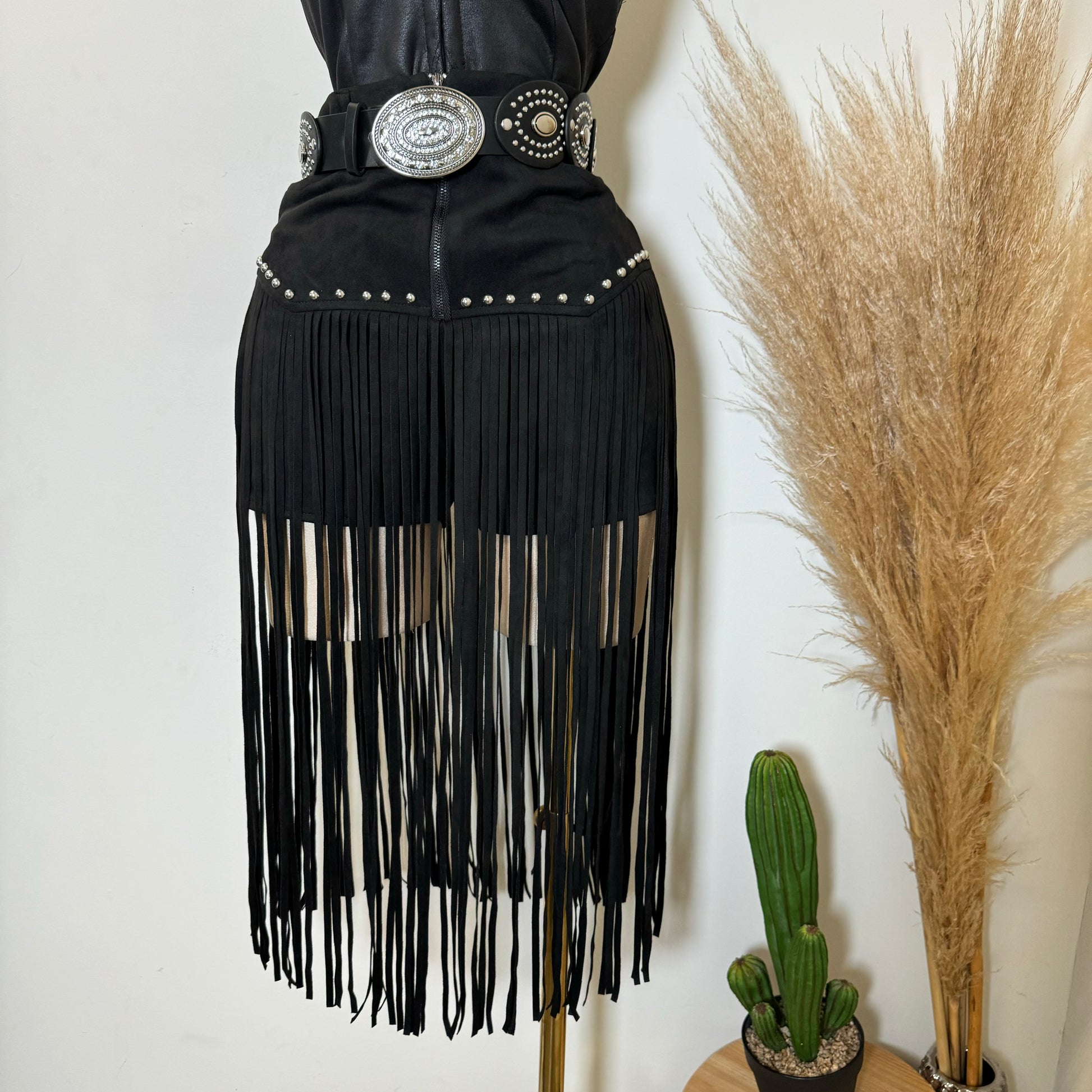 Fringe Stud Suede Shorts-Black