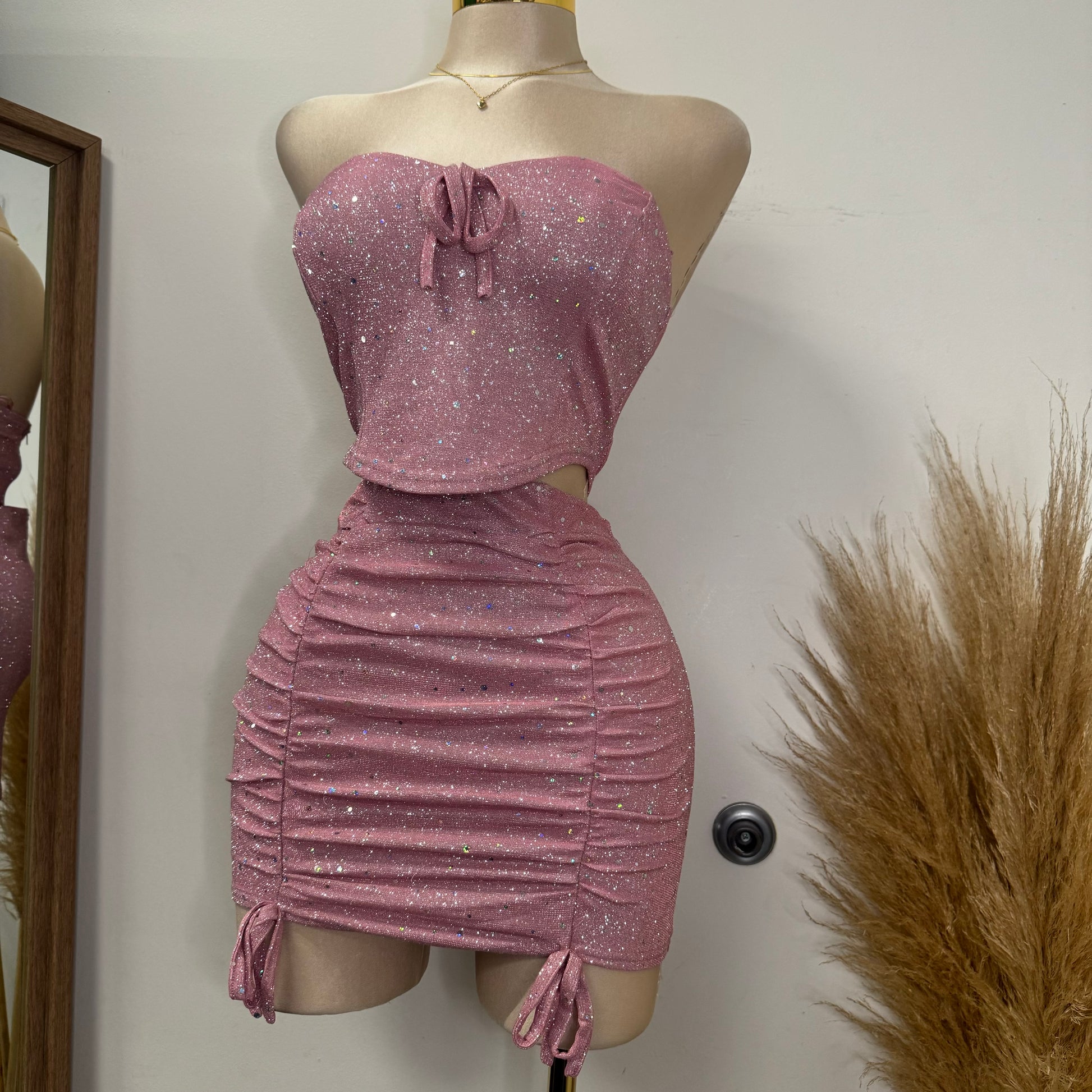 METALLIC GLITTER MINI BOW TIE BUSTIER TUBE TOP & RUCHED MINI SKIRT SETS