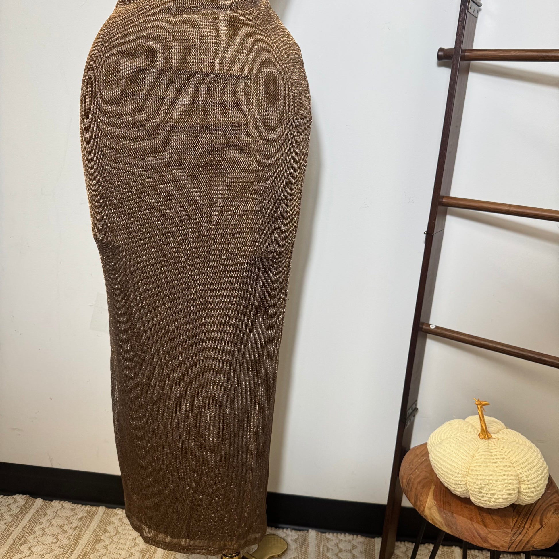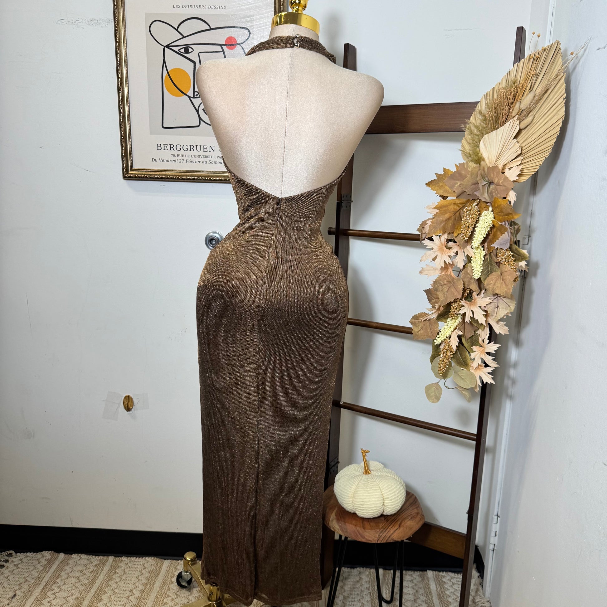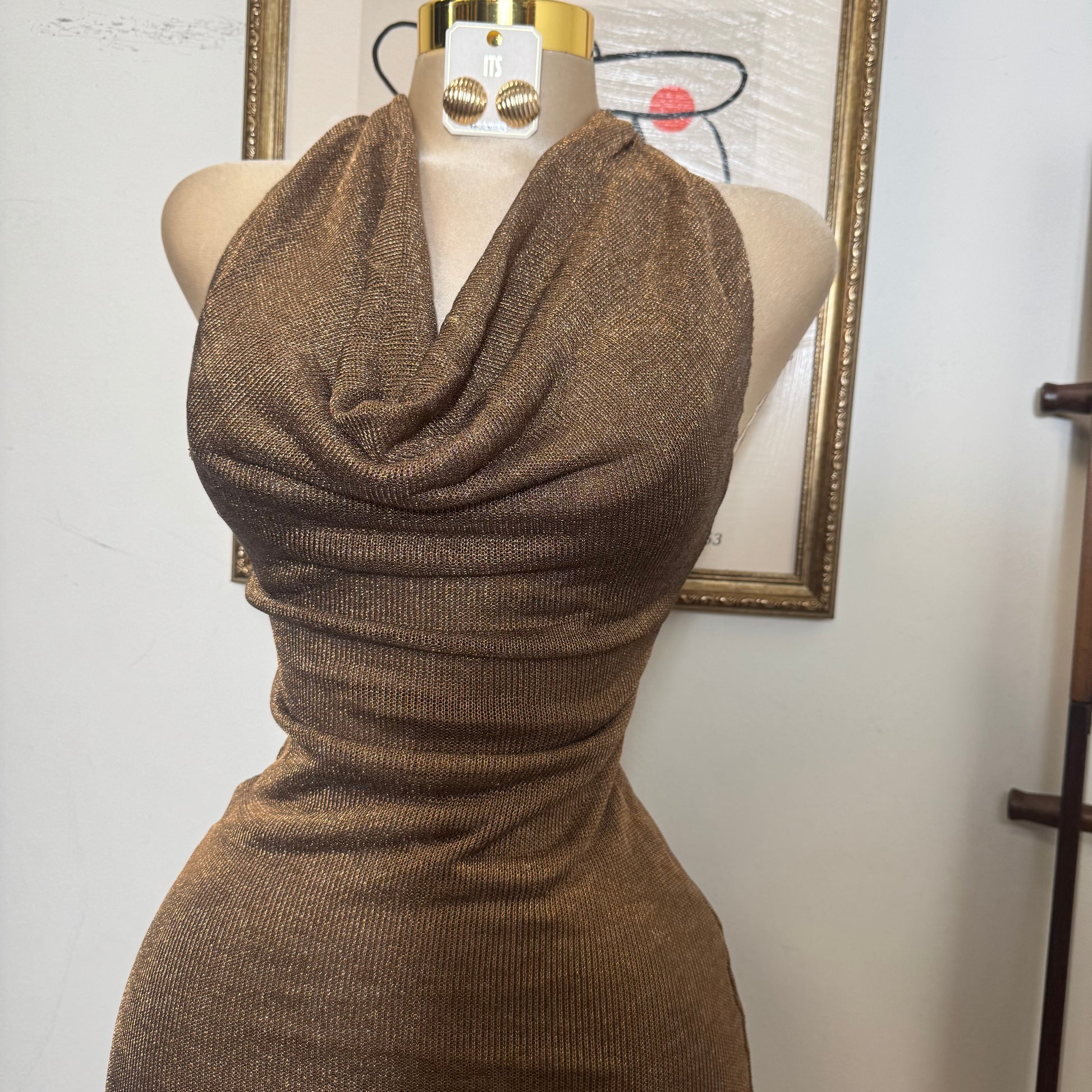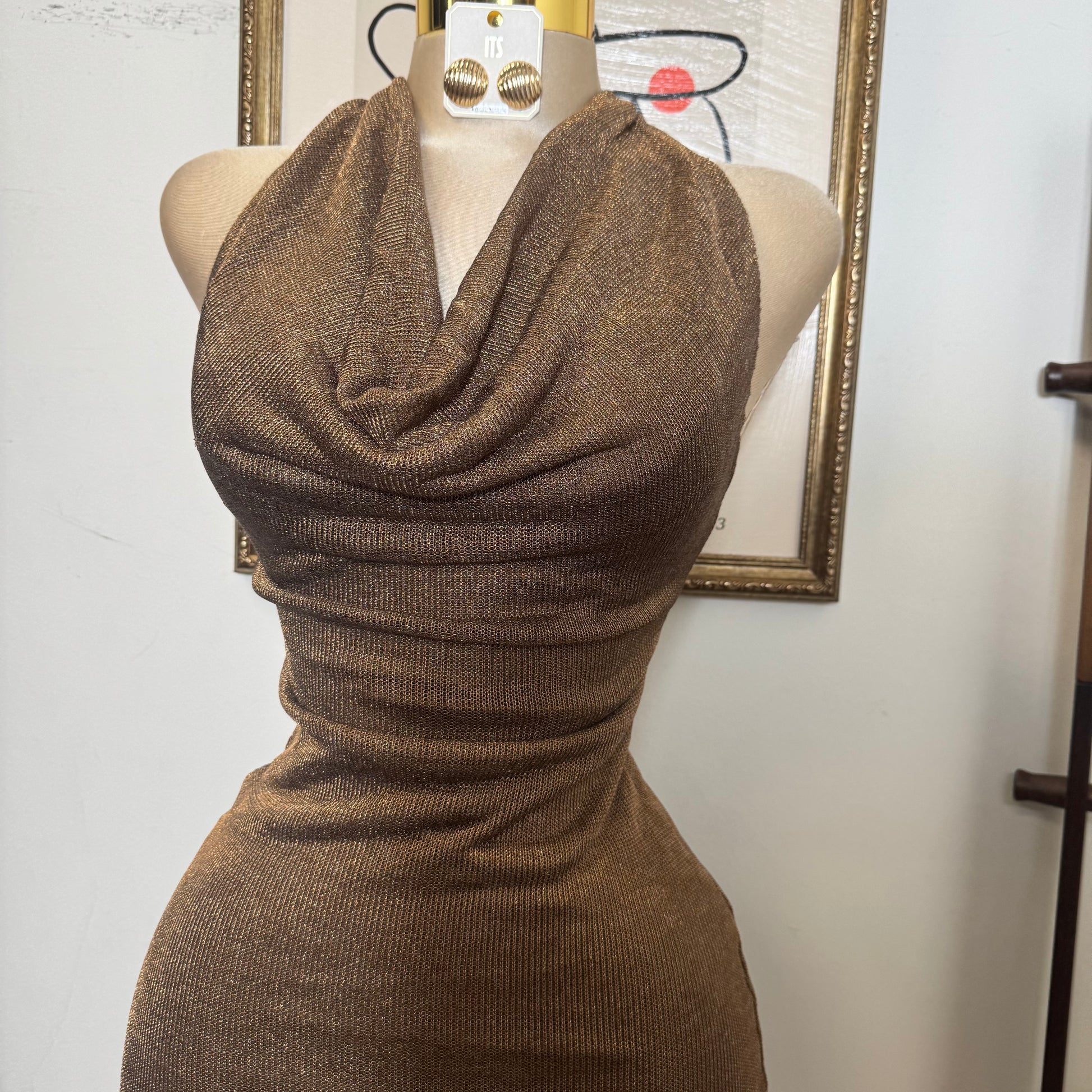 Halter Cowl Neck Metallic Knit Maxi Dress-brown