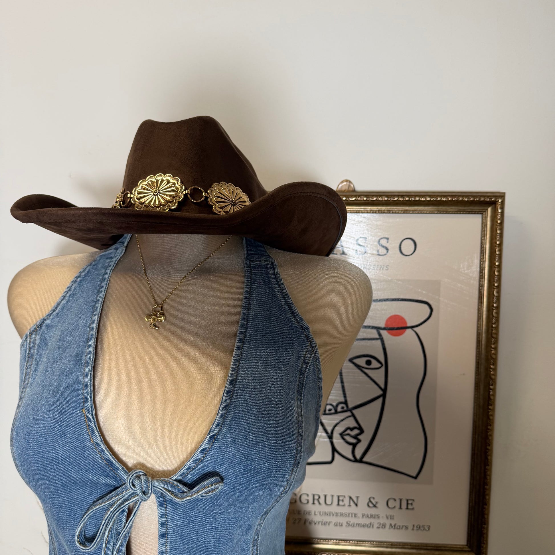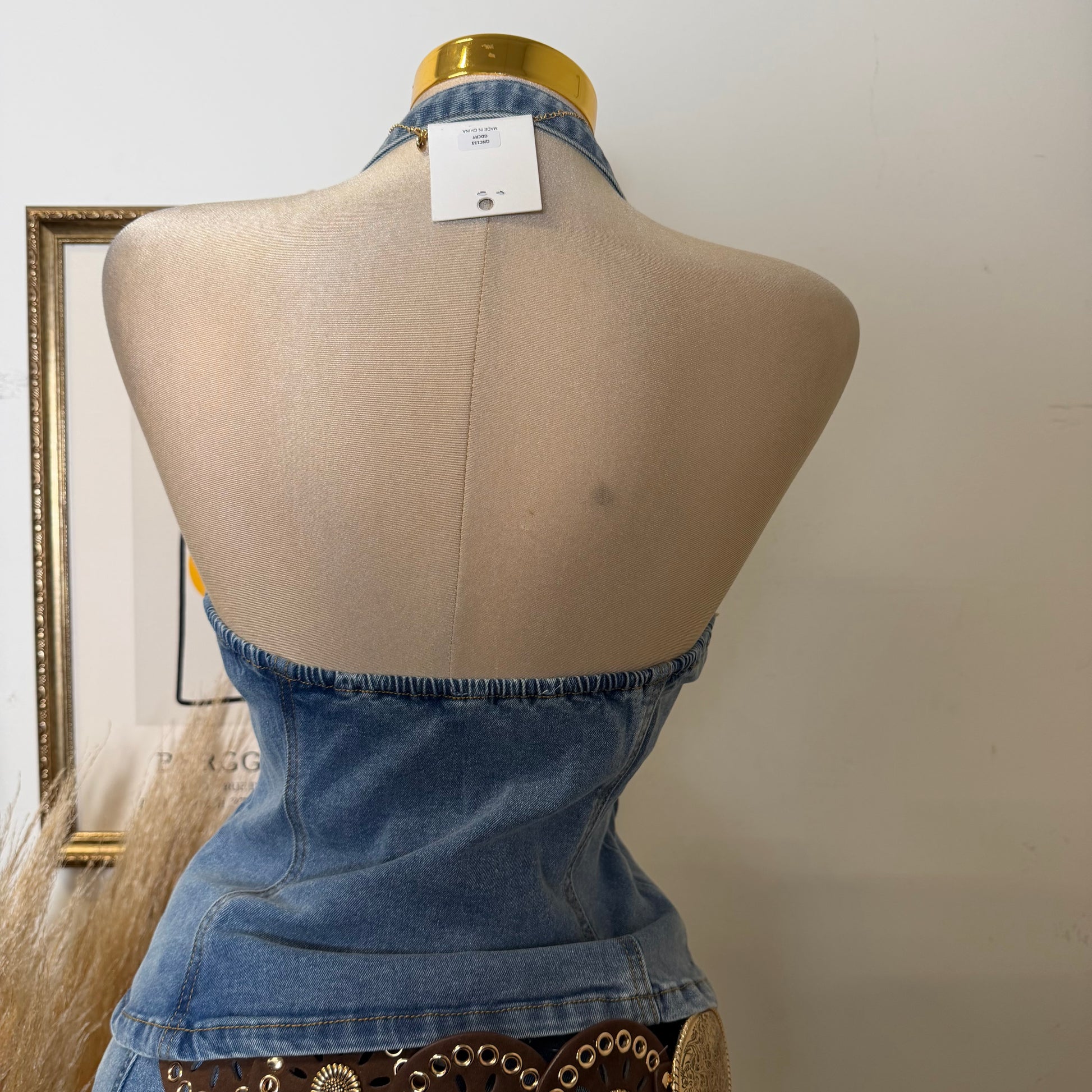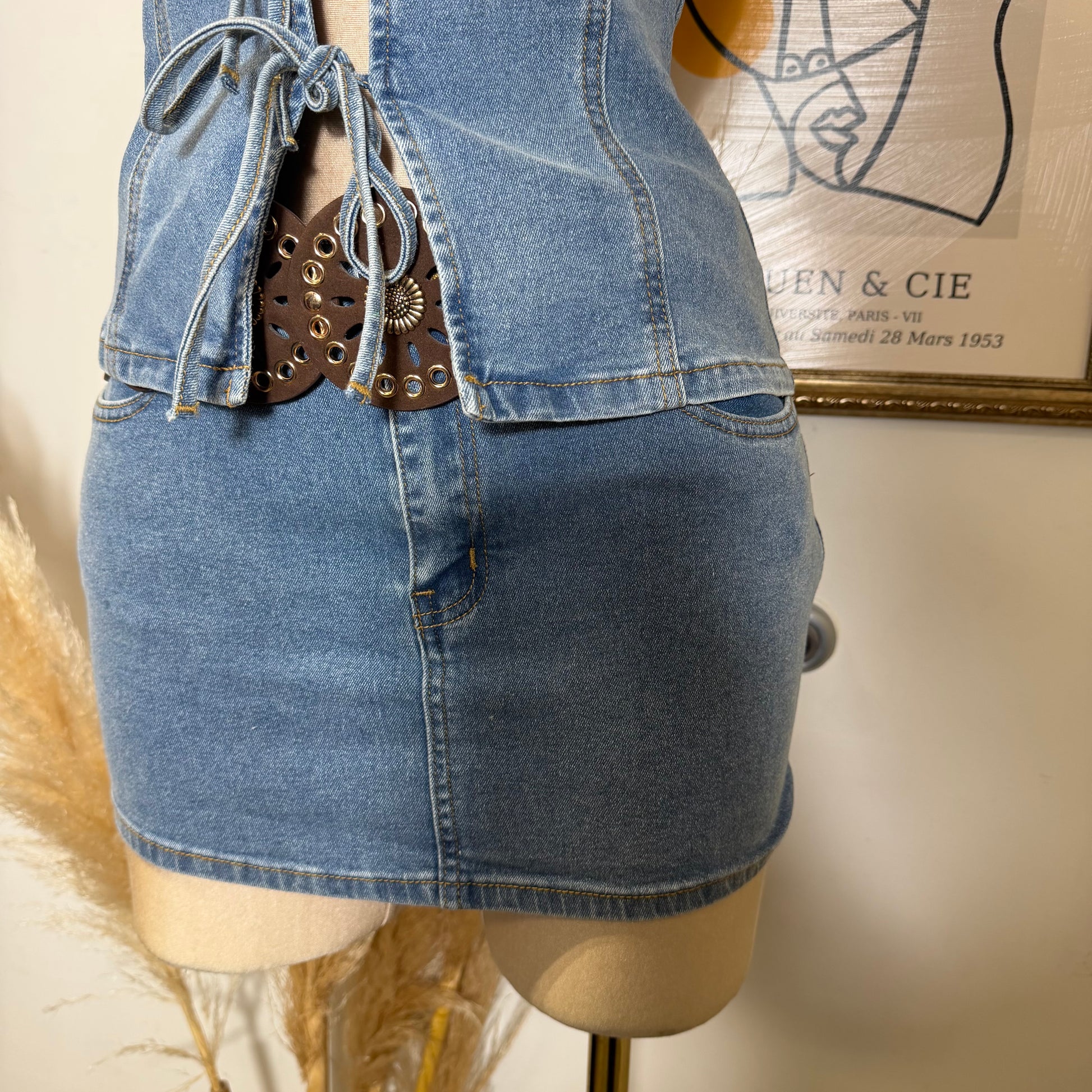 Halter Neck Front Tie Top And Mini Skirt Set-Denim