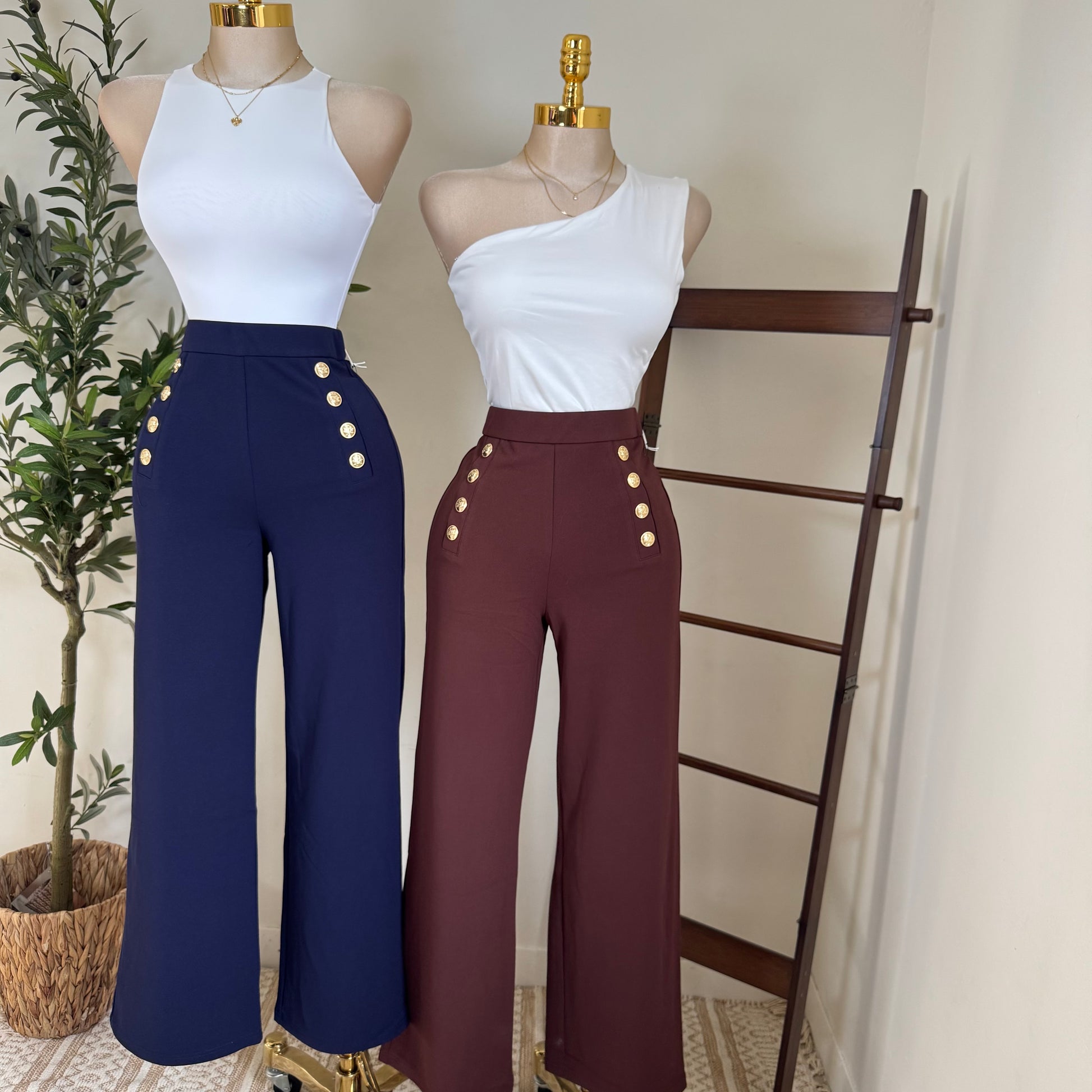 High waisted Dressy Pants with Buttons on the Side-Brown