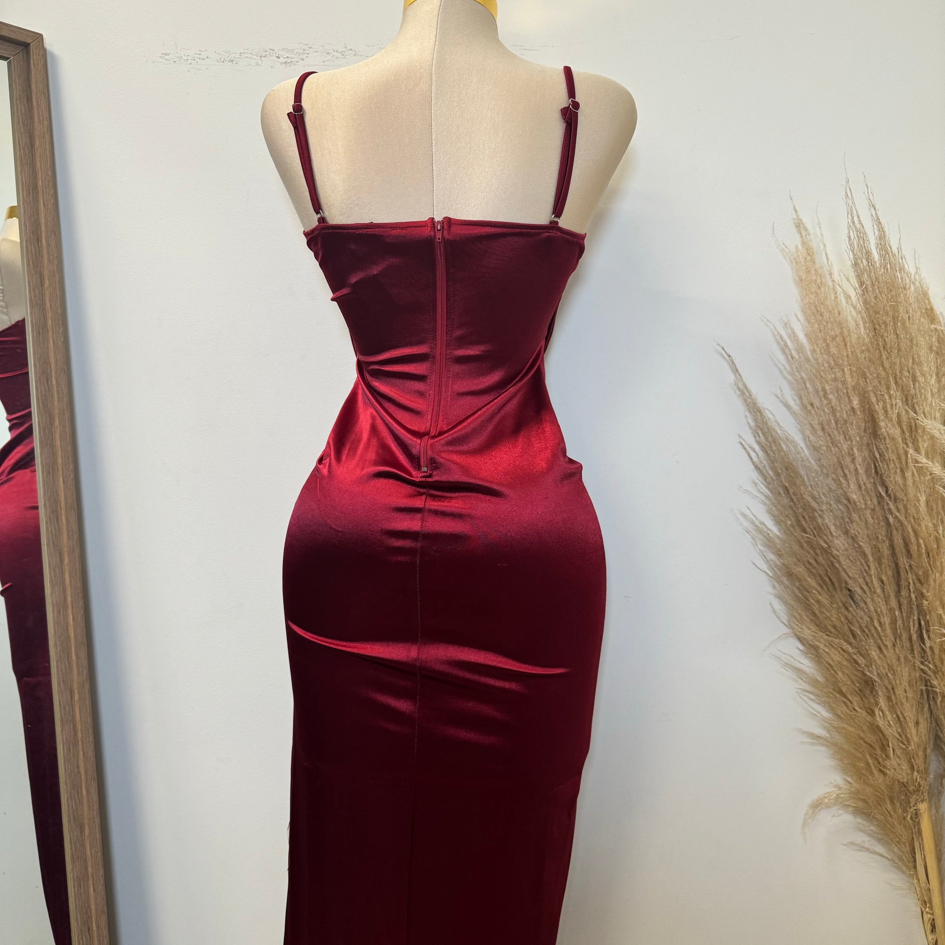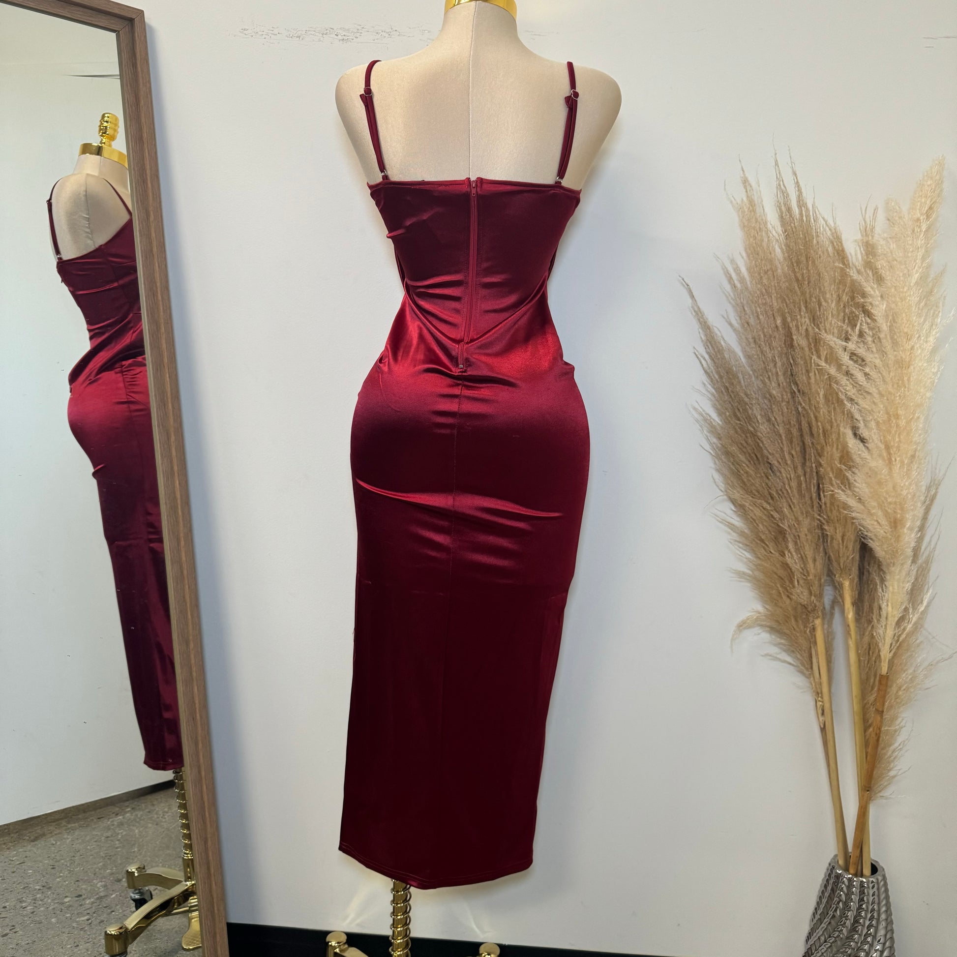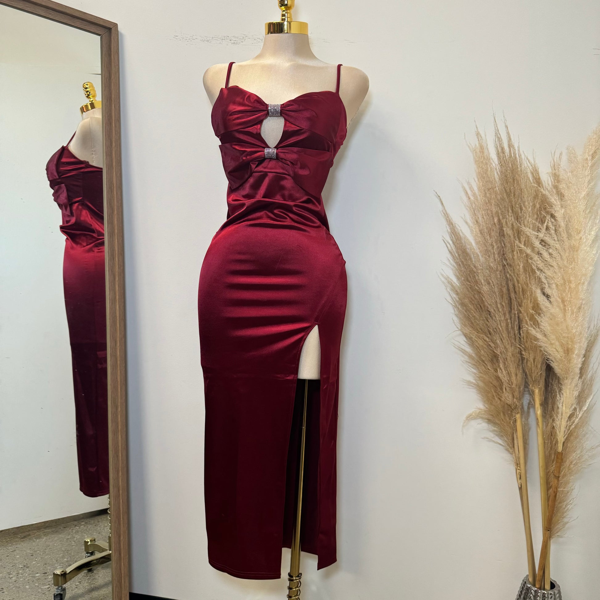 LUXE CASINO SATIN SLEEVELESS JEWELED DOBULE BOWS WITH KEYHOLE SIDE SLITTED BODYCON MAXI DRESS