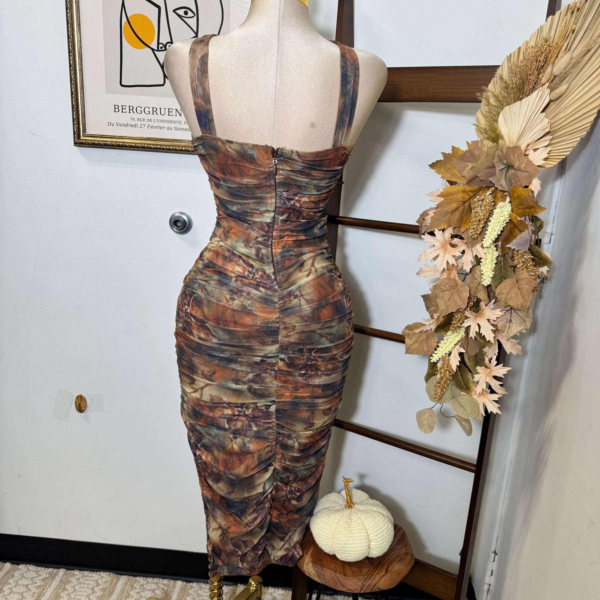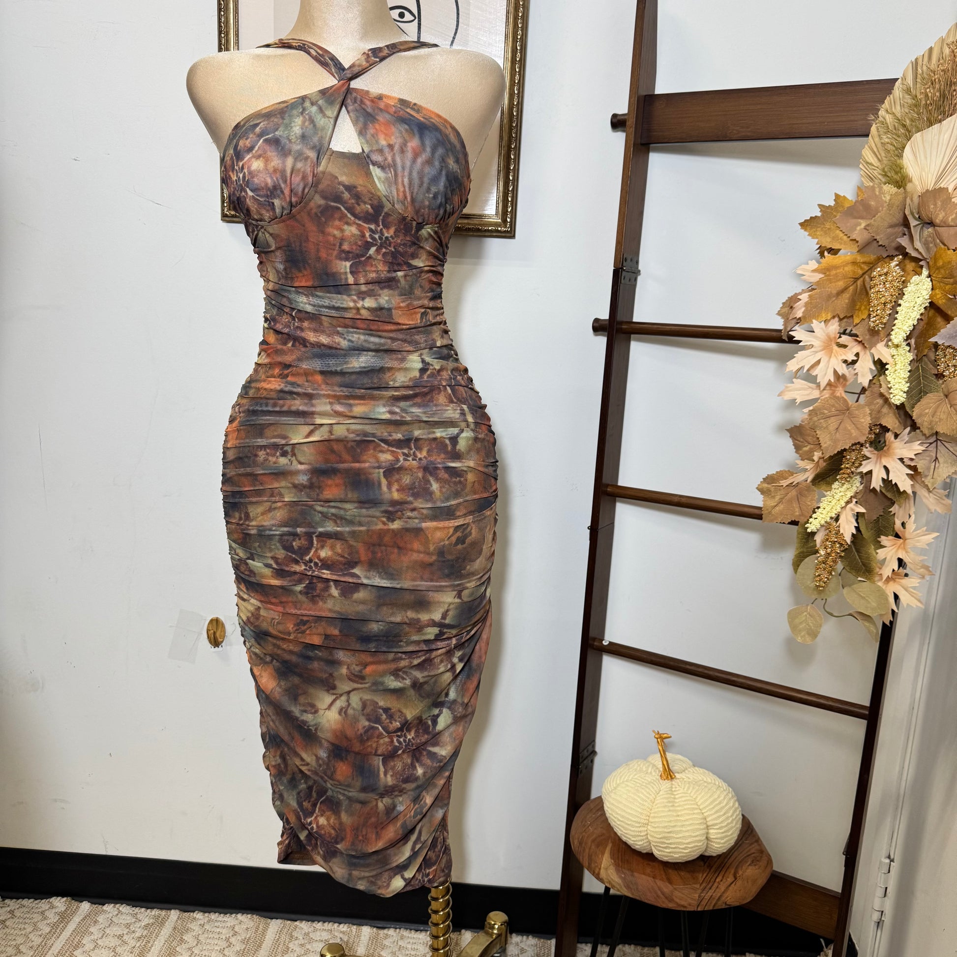 Inara Mesh Twist Halter Neck Midi Dress-Rust Multi
