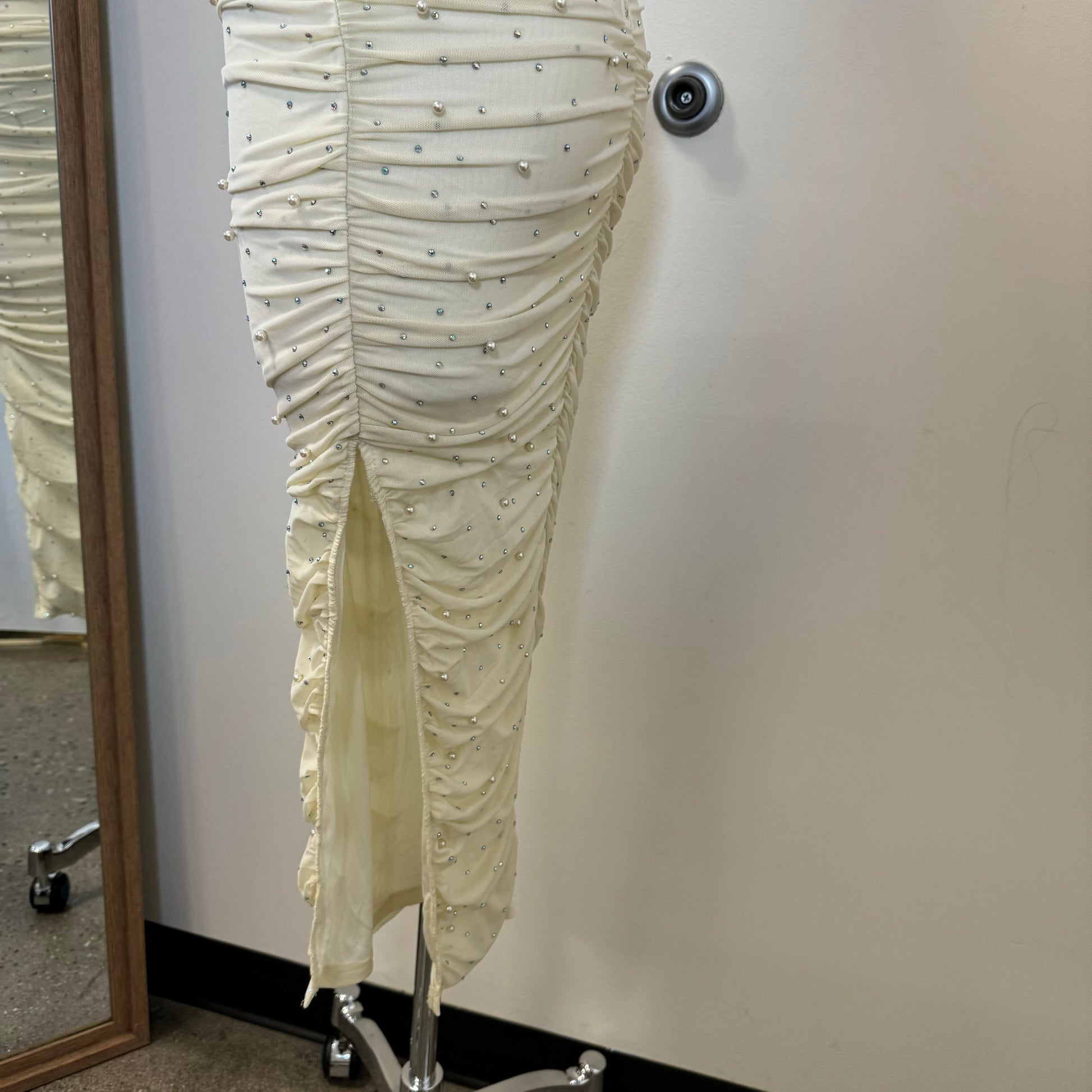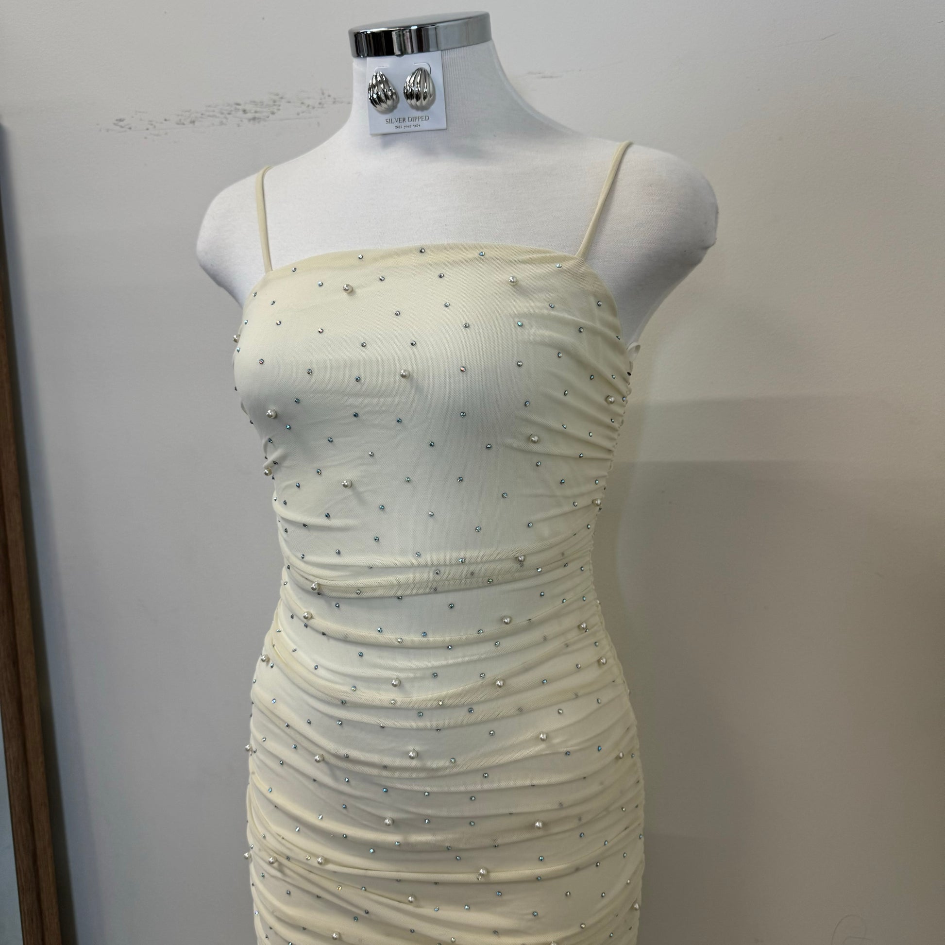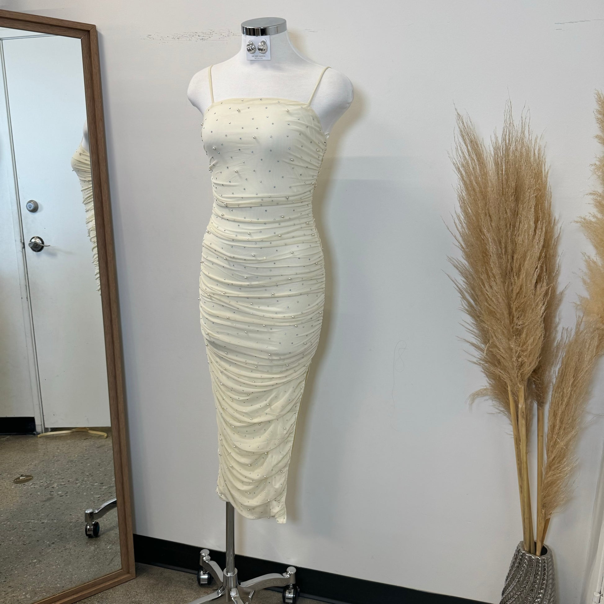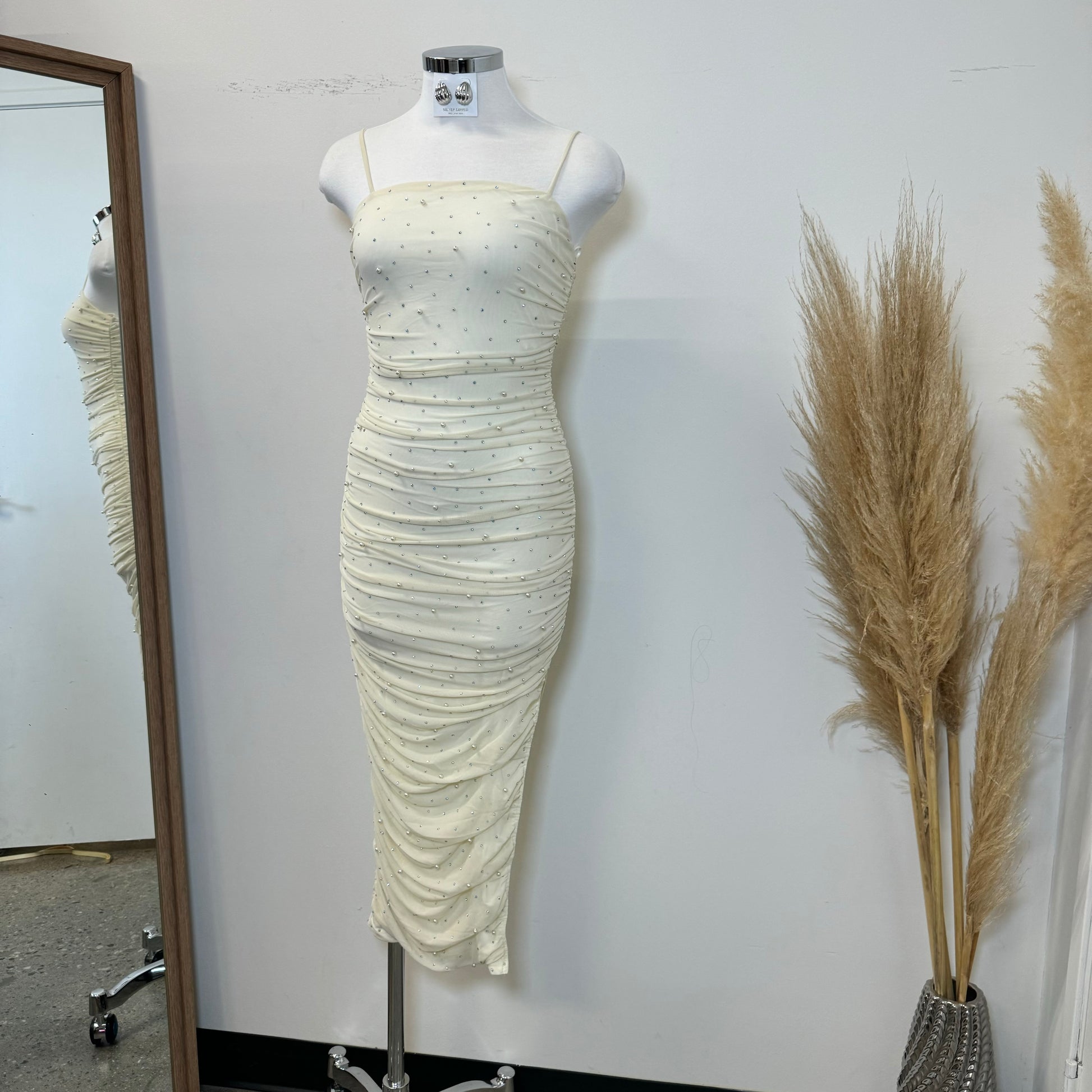 -Luxe Hotfit pearl Embellished mesh sleeveless ruched side slitted midi dress