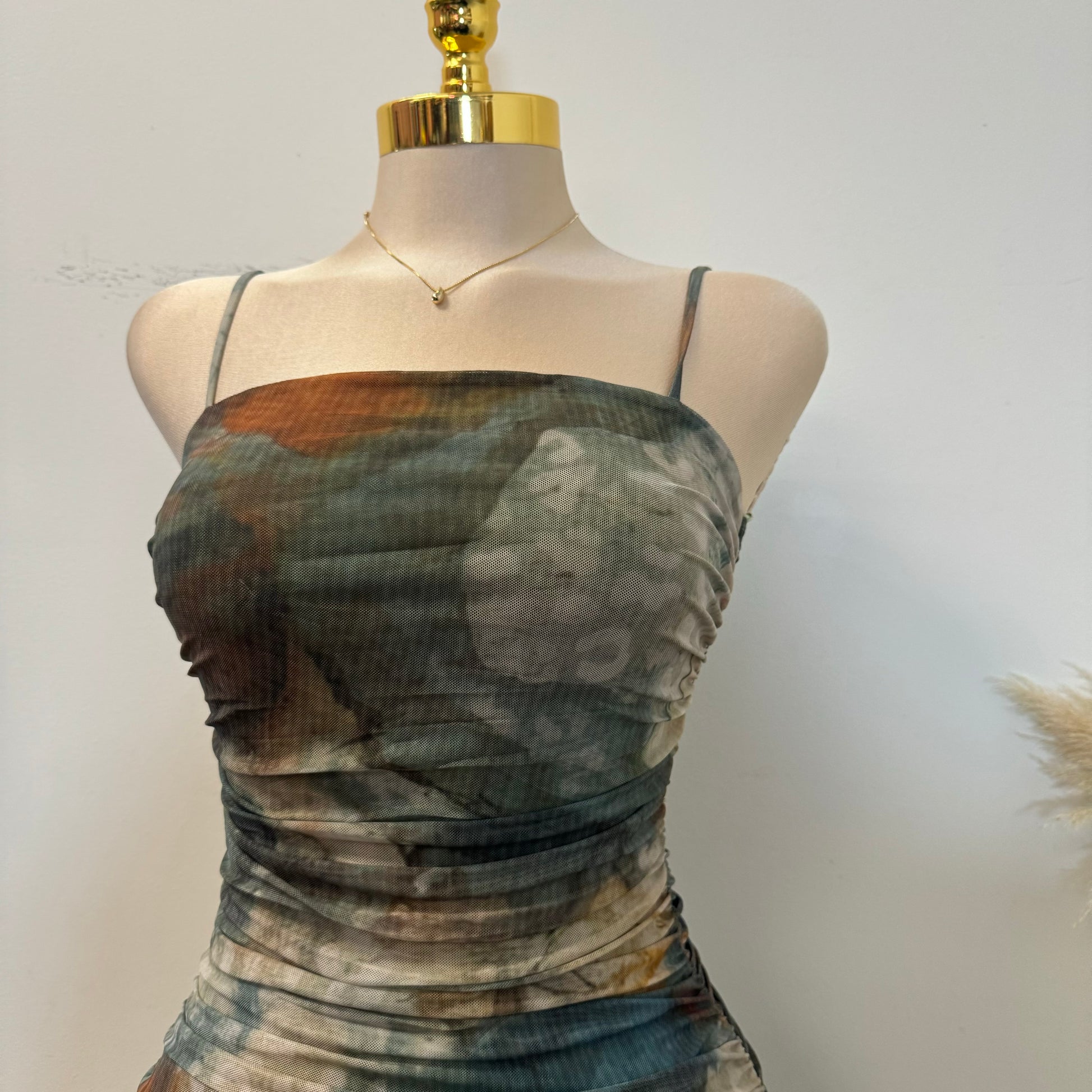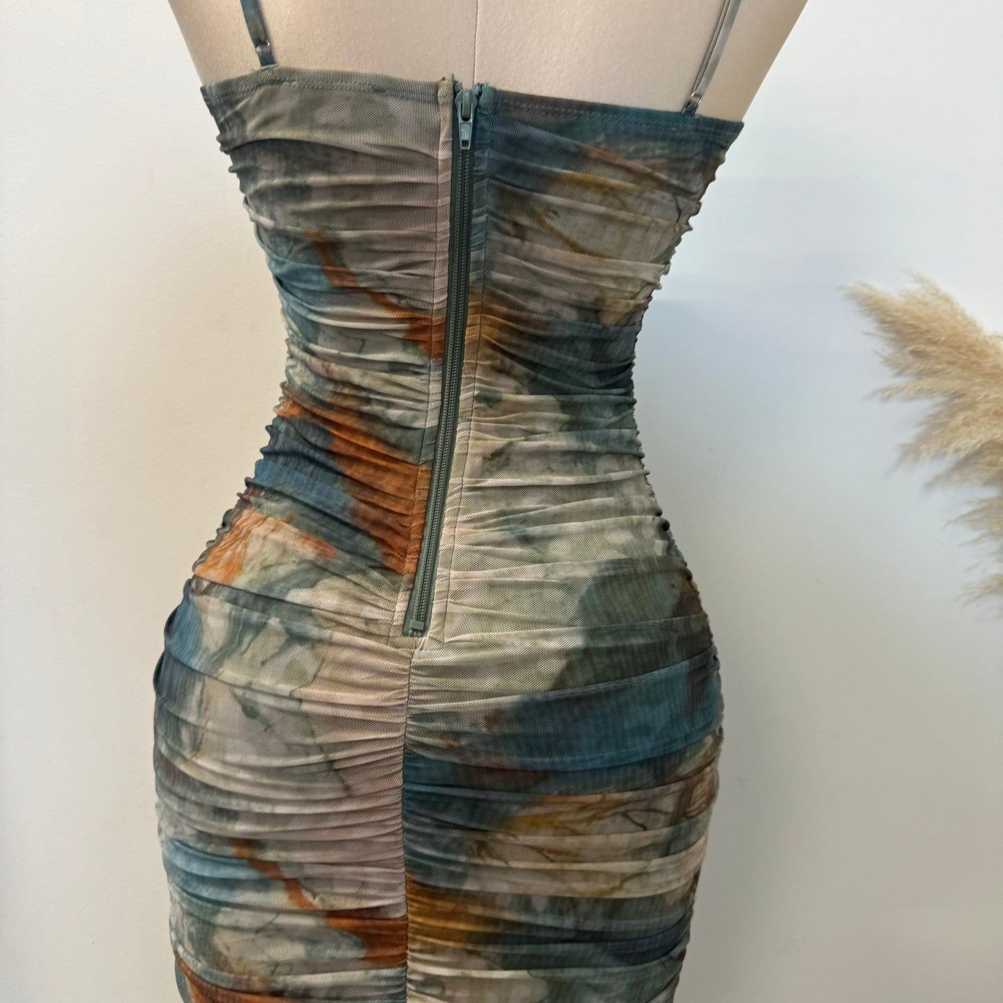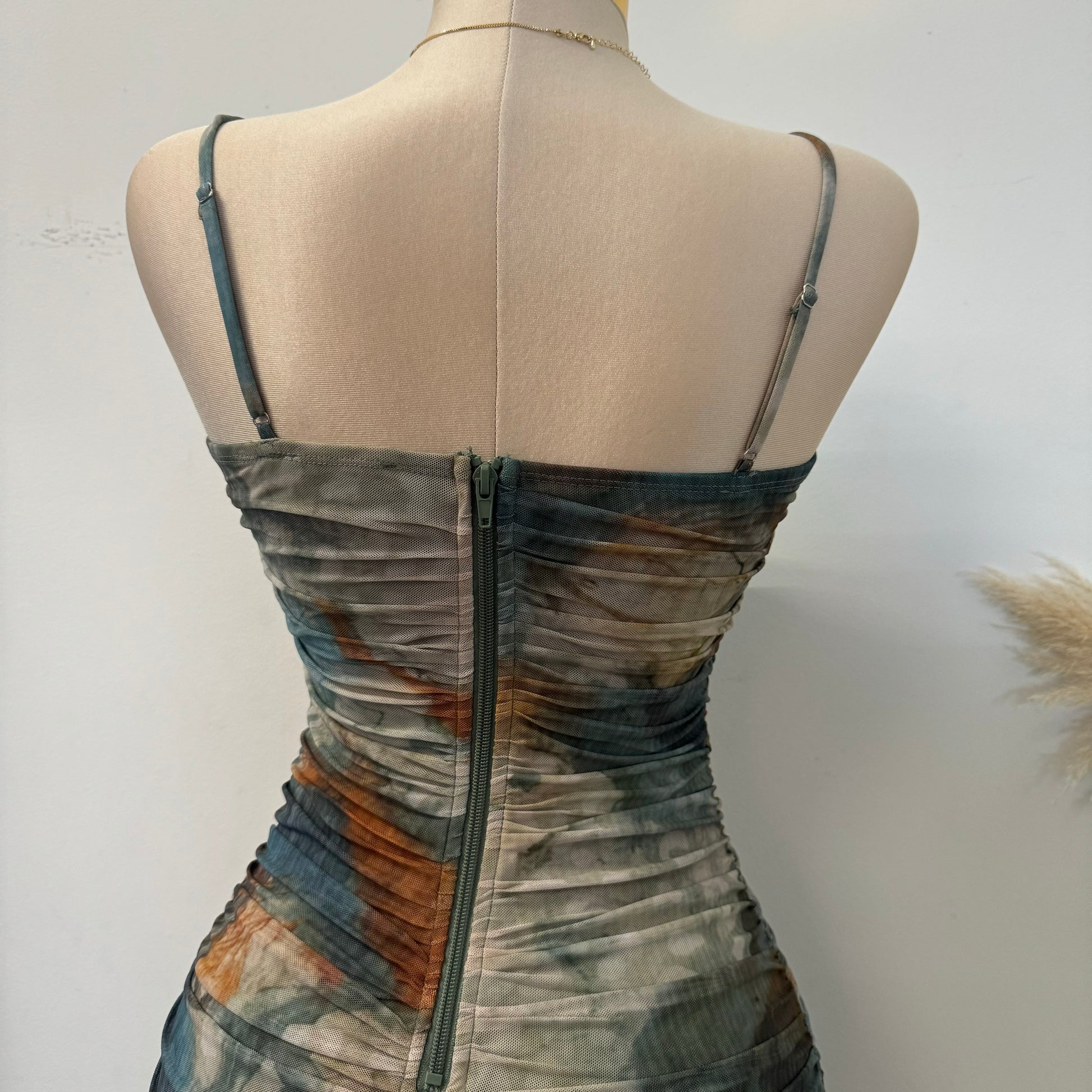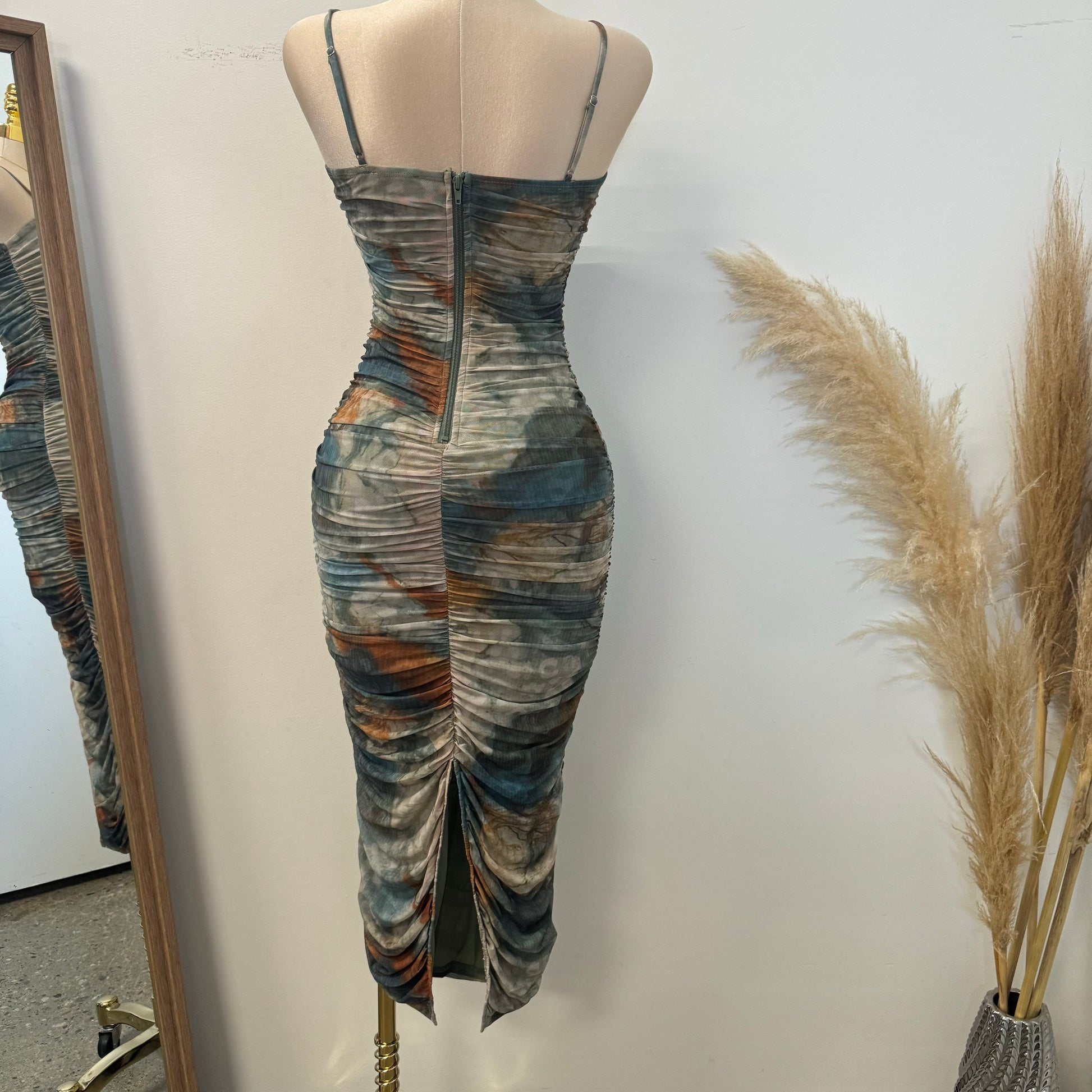 TIE DYE PRINT MESH SPAGHETTI STRAPS SLEEVELESS RUCHED BACK SLITTED MIDI DRESS