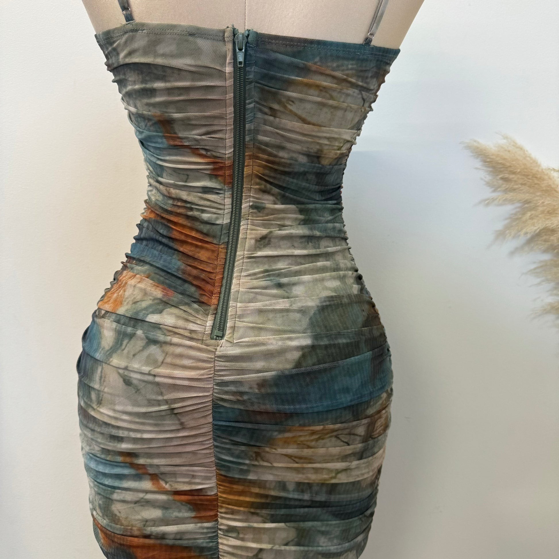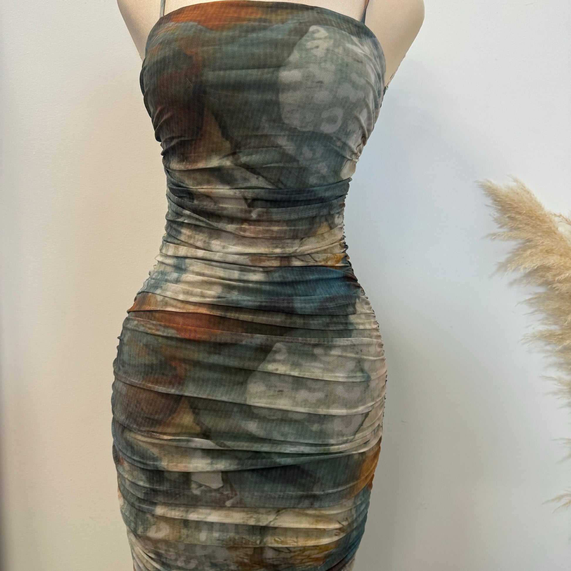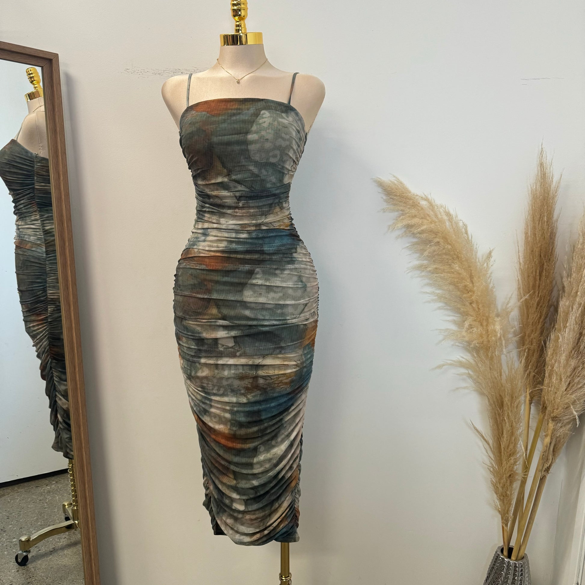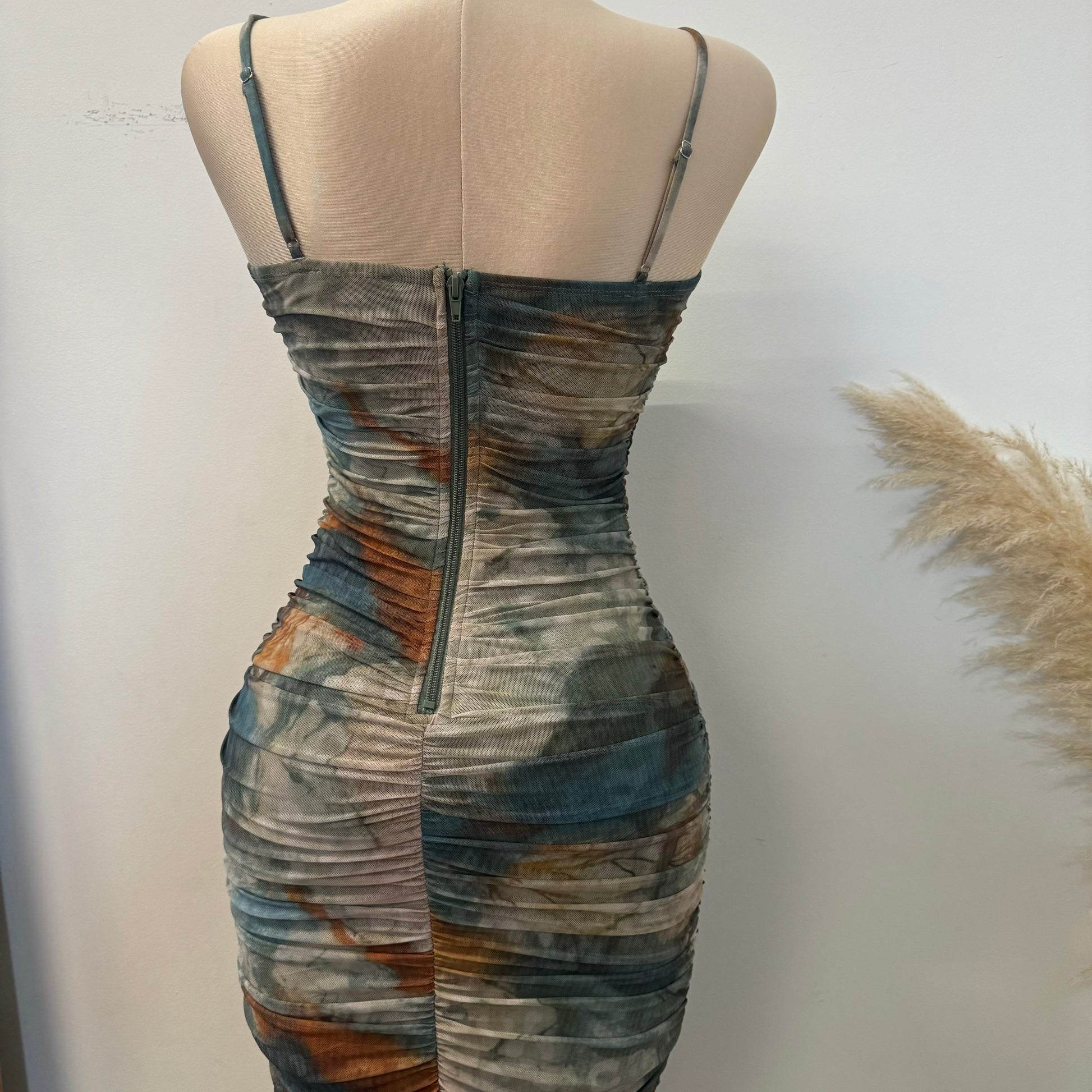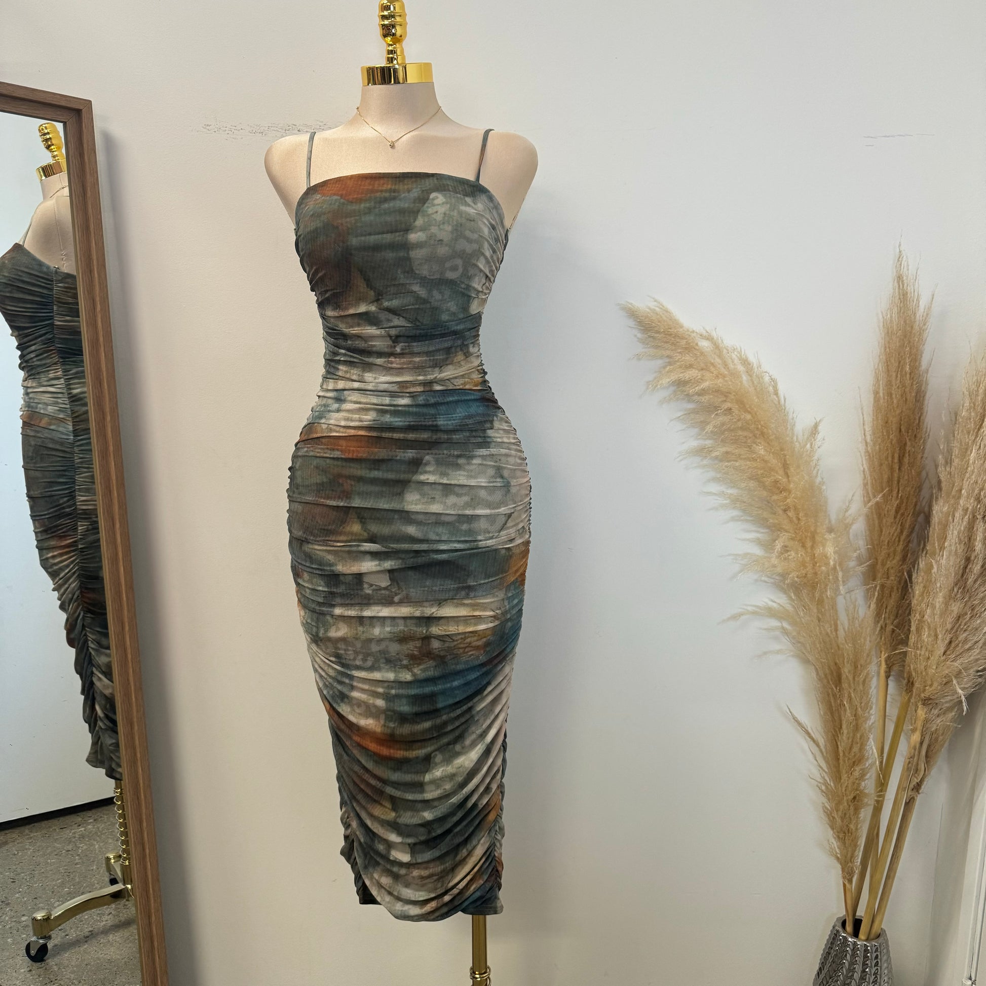 TIE DYE PRINT MESH SPAGHETTI STRAPS SLEEVELESS RUCHED BACK SLITTED MIDI DRESS