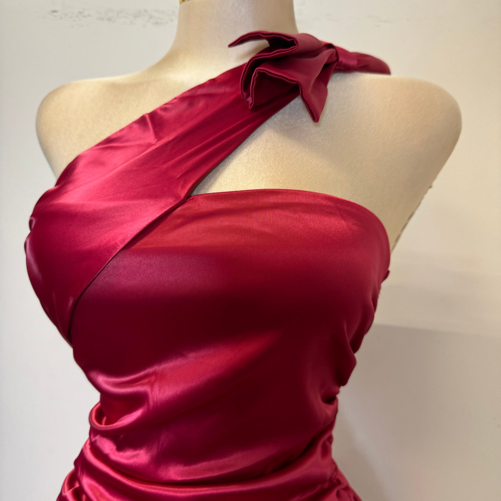 LUXE SATIN BOW ONE SHOULDER TUBE SKATER MINI DRESS