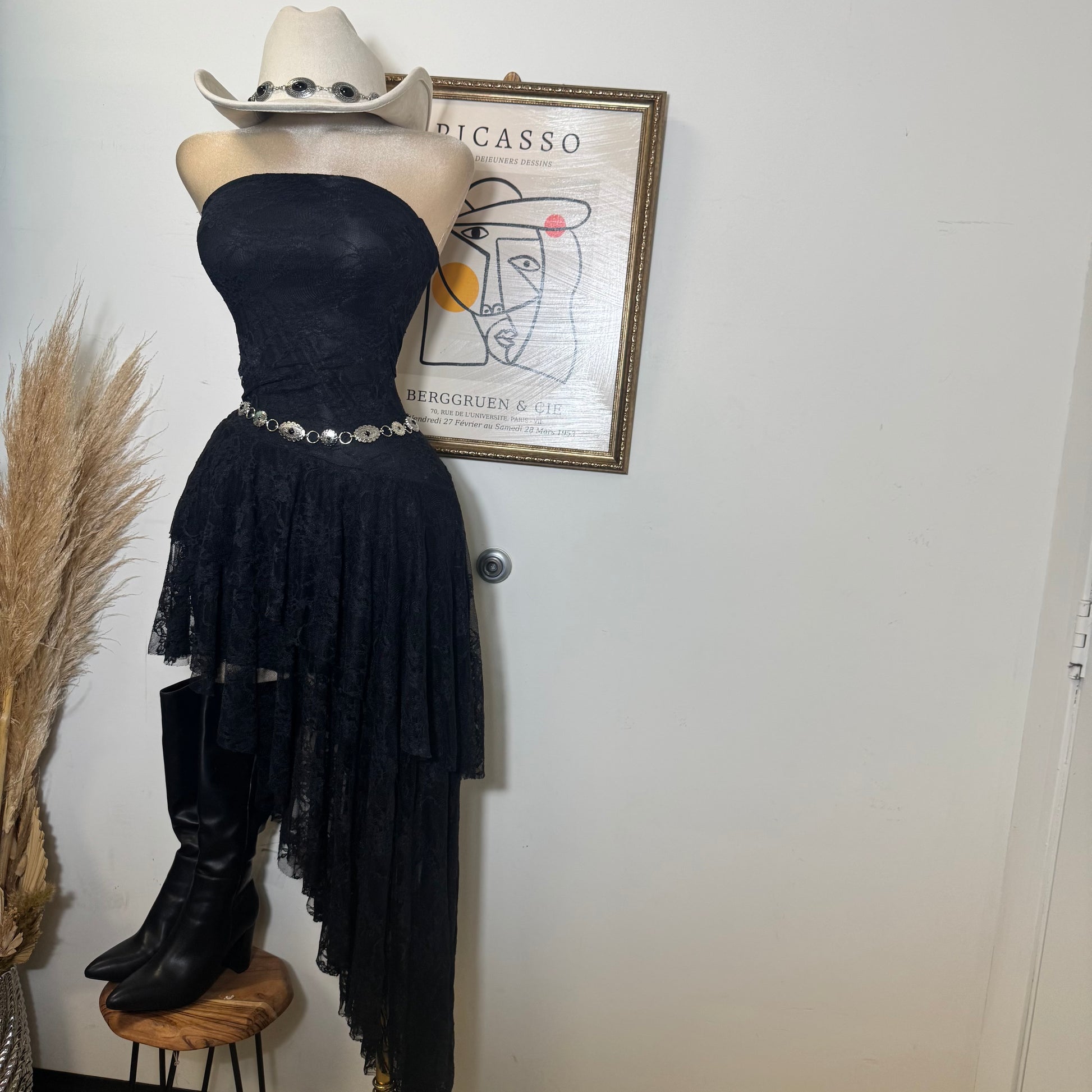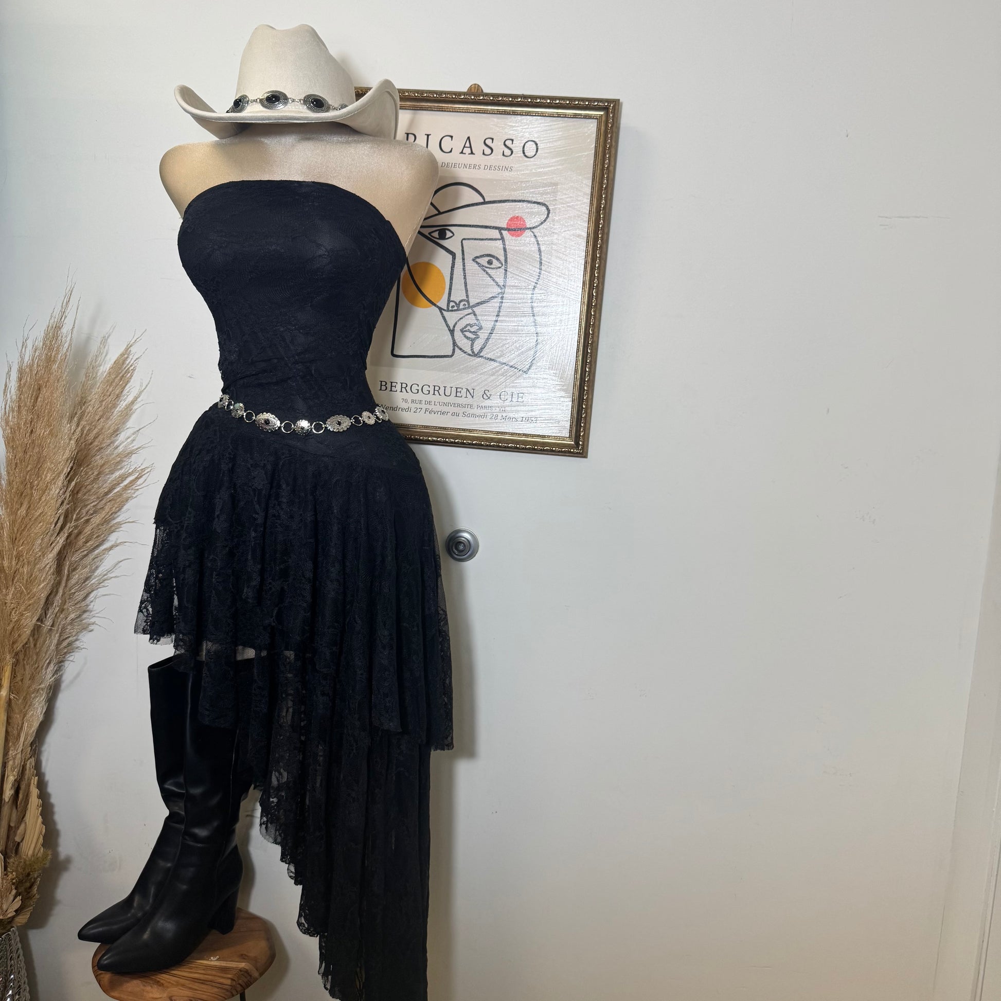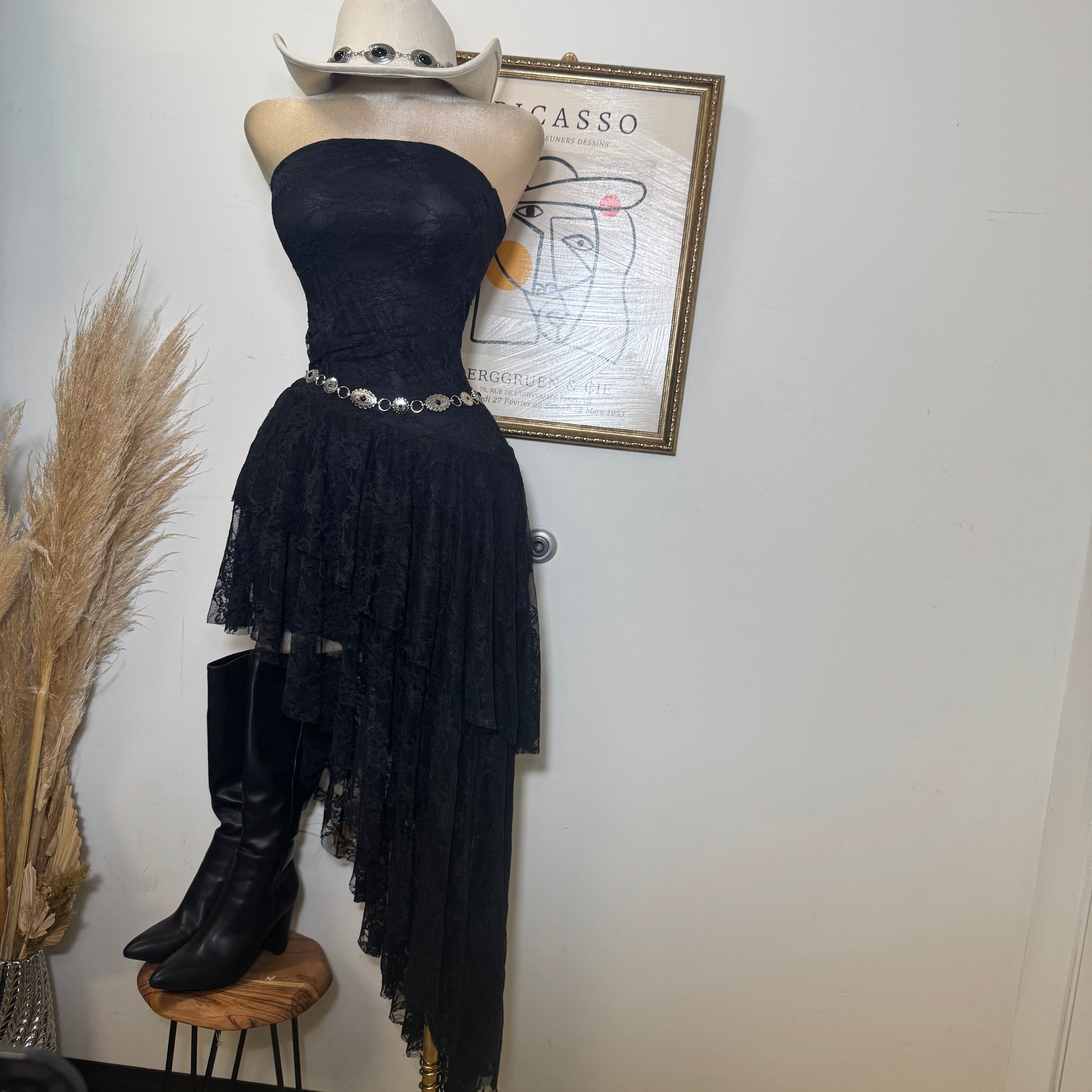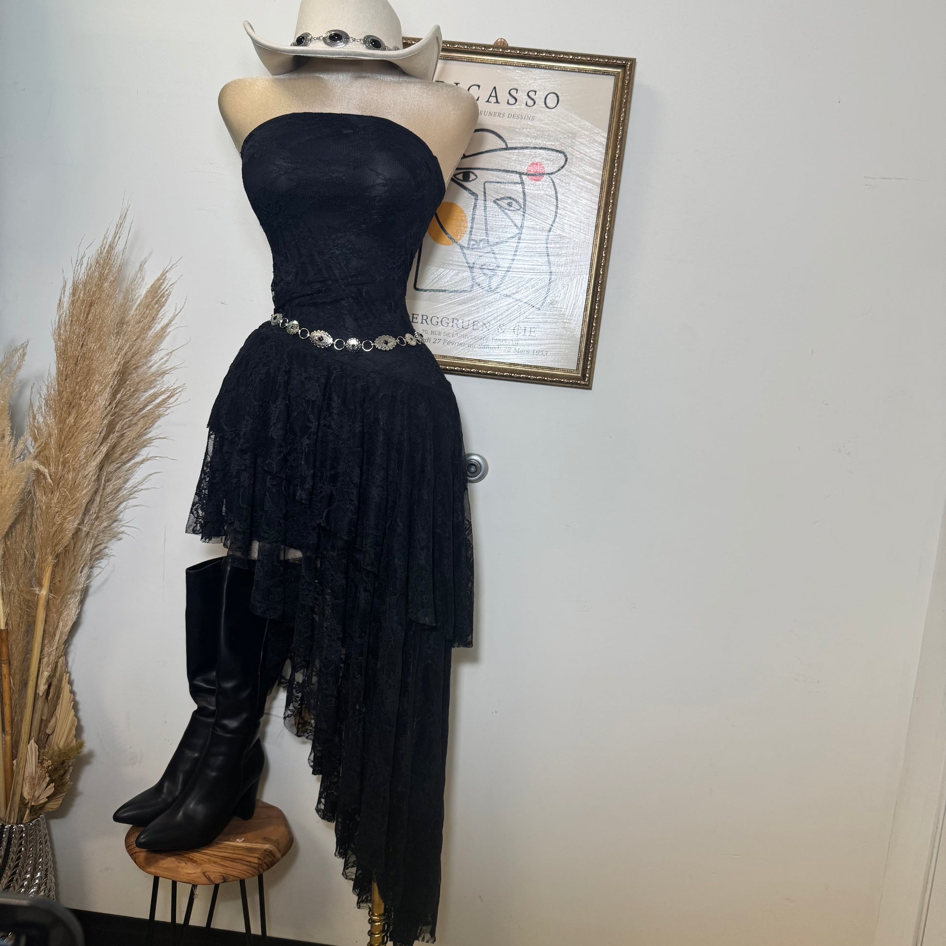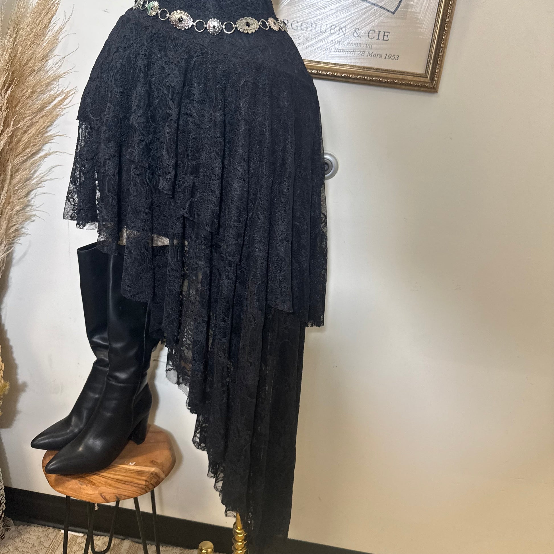 Lace Double Layer Ruffle Asymmetrical Maxi Dress-Black
