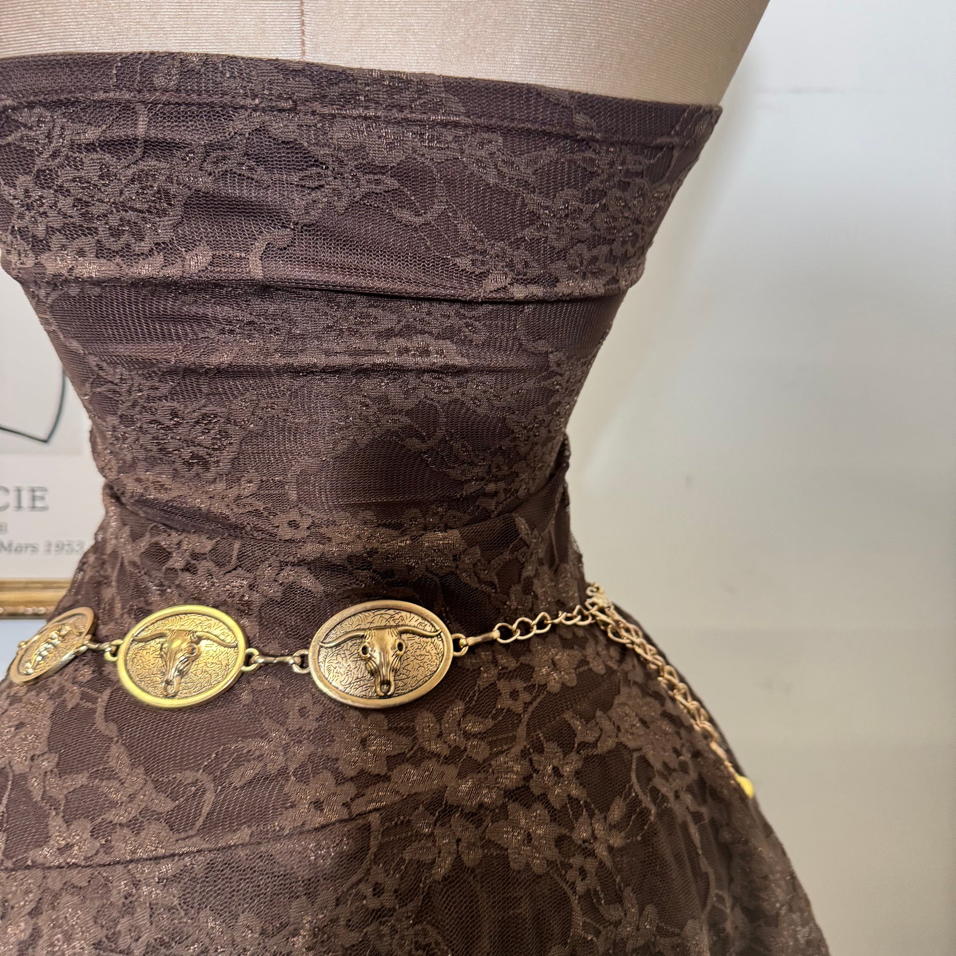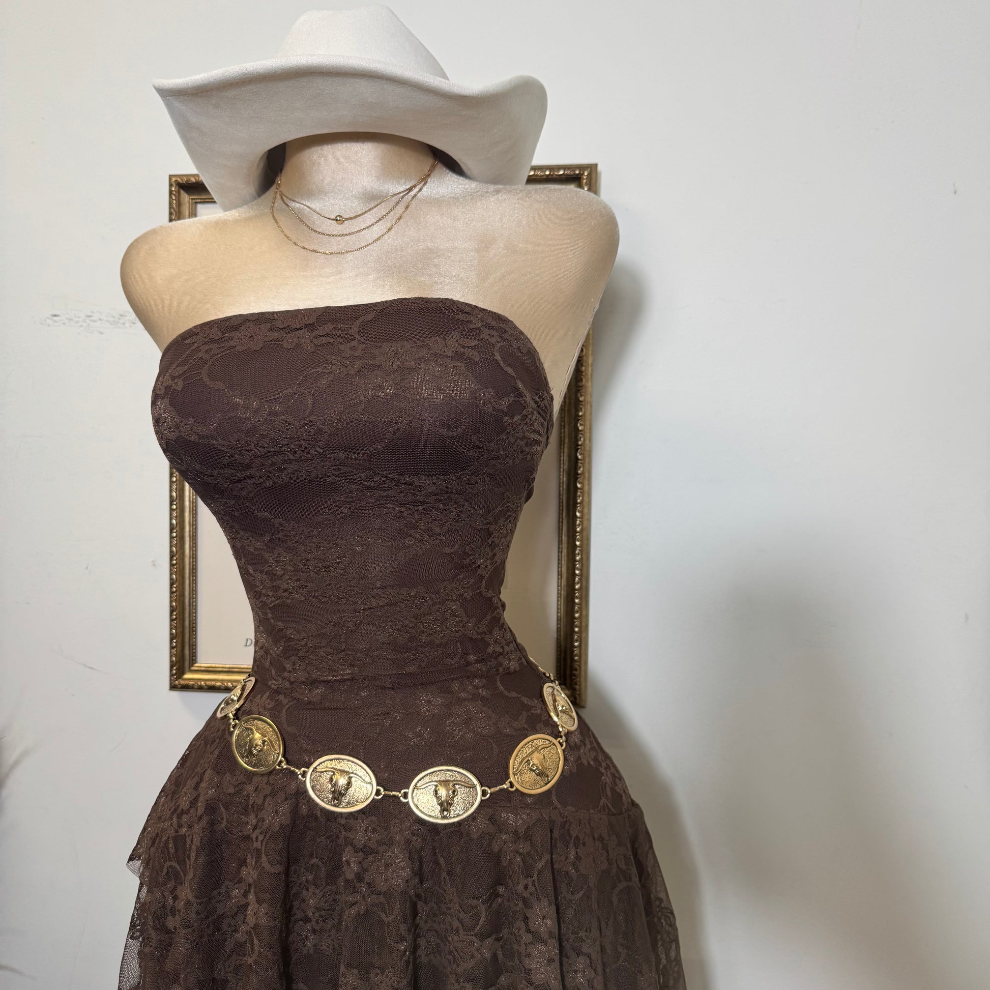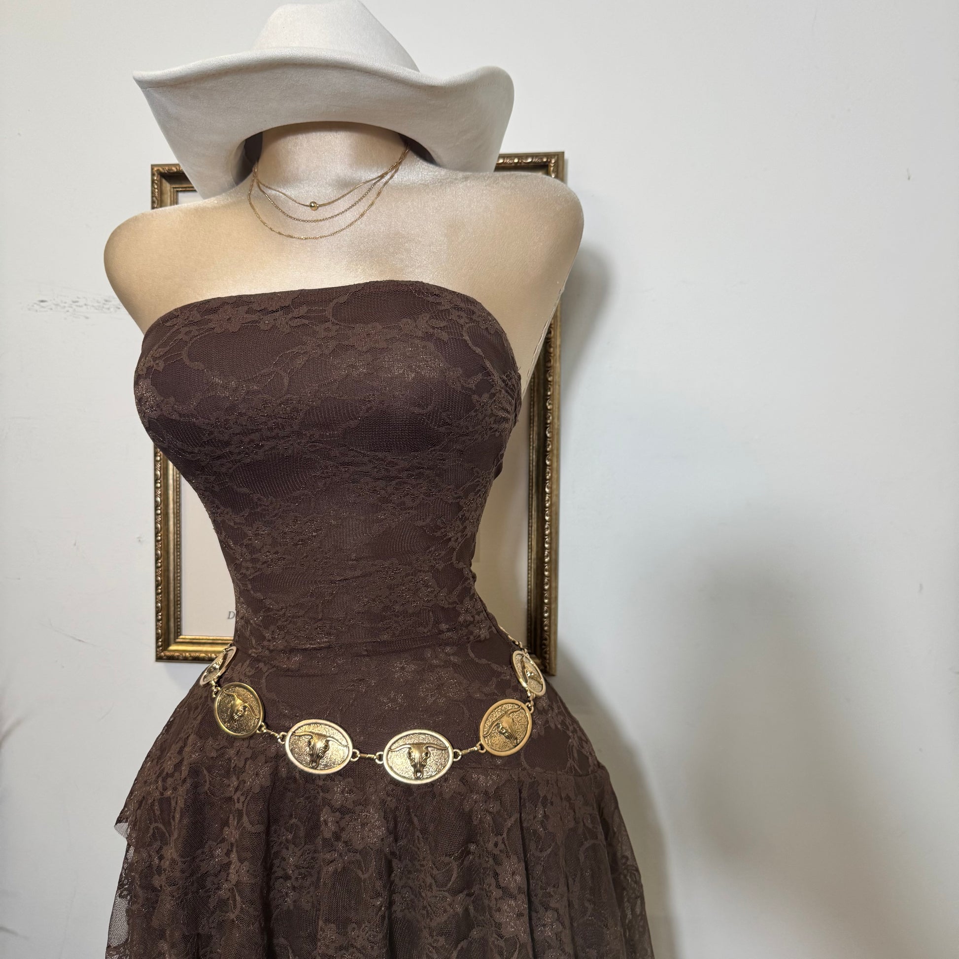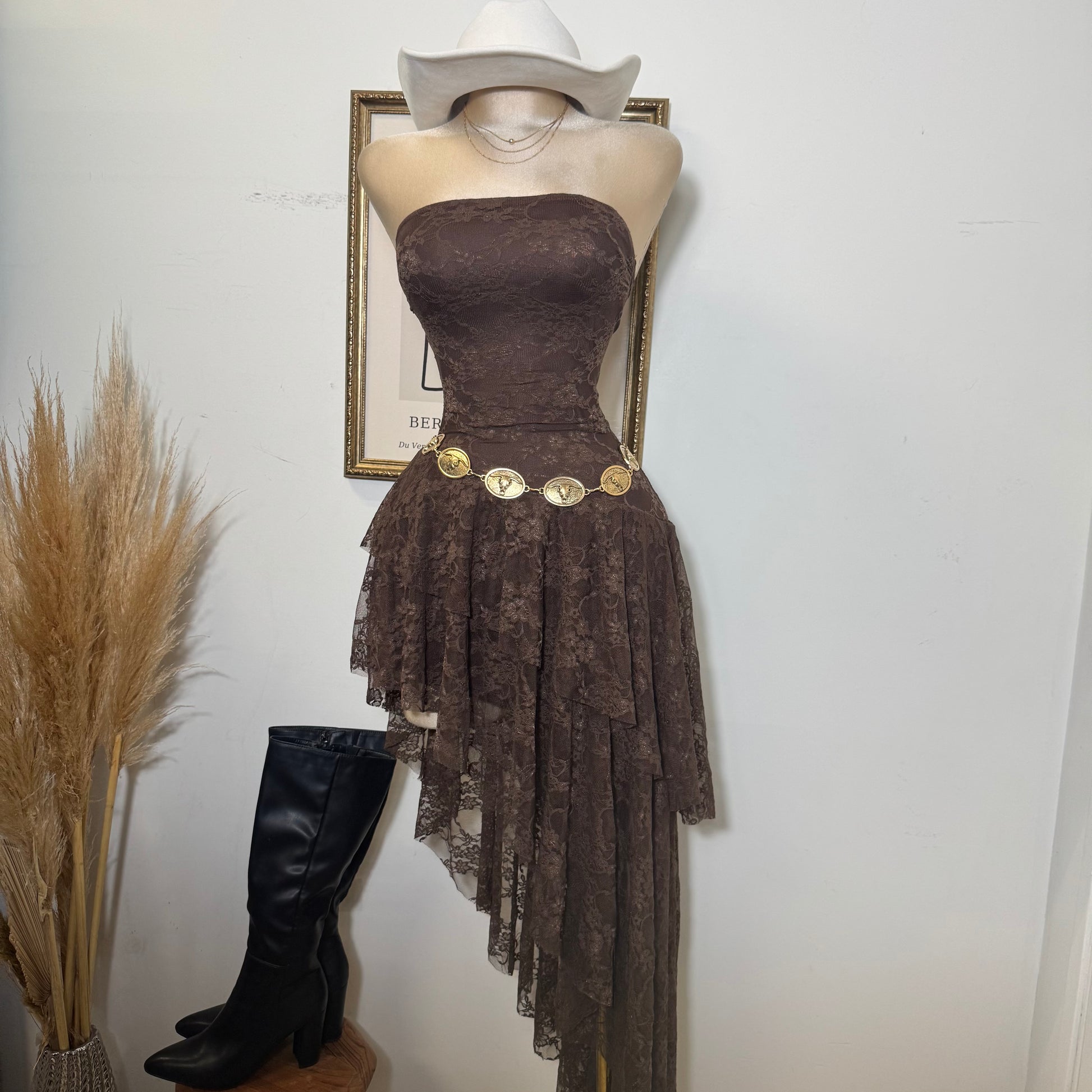 Lace Double Layer Ruffle Asymmetrical Maxi Dress-Brown