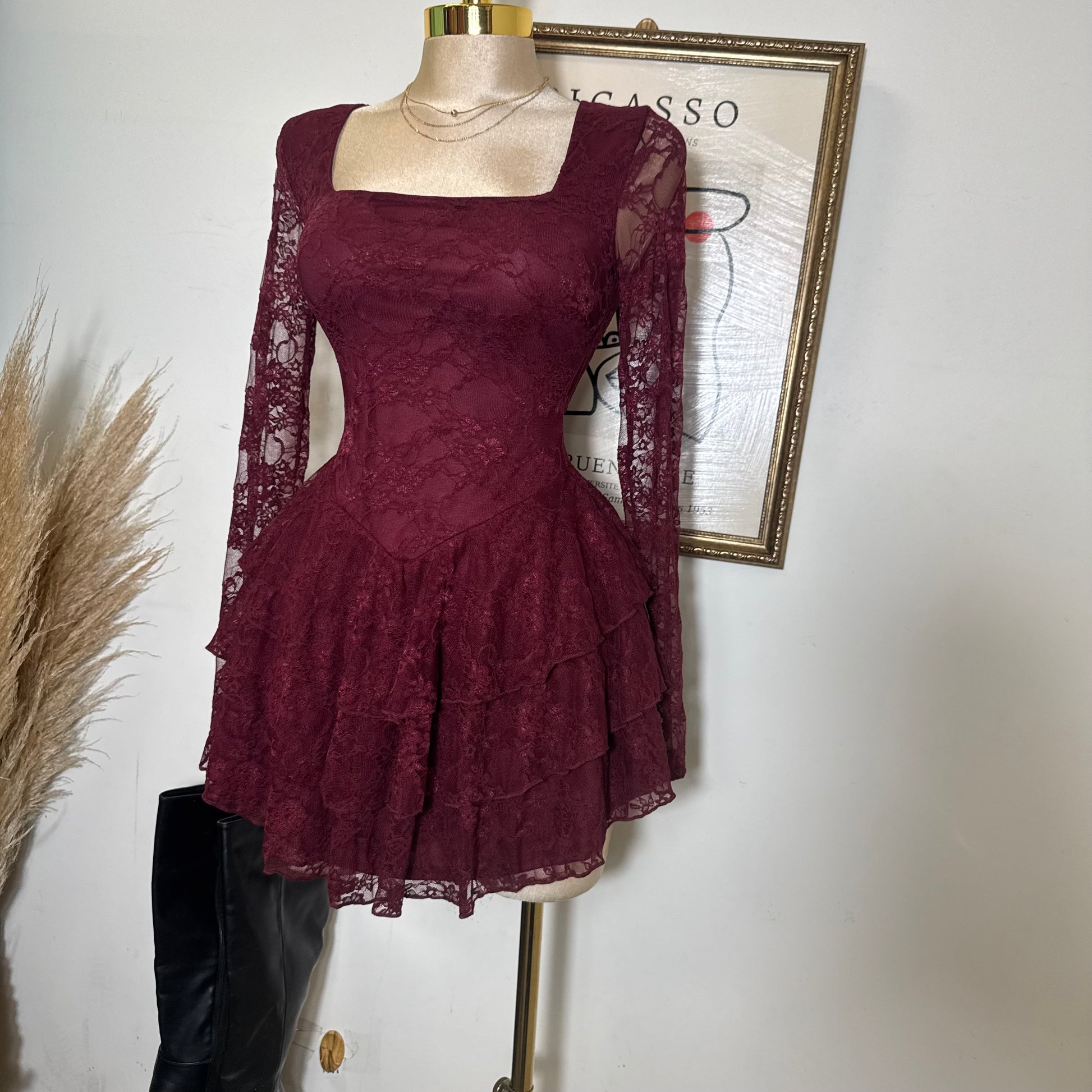 Lace Long Sleeve Ruffle Layered Mini Dress-Burgundy